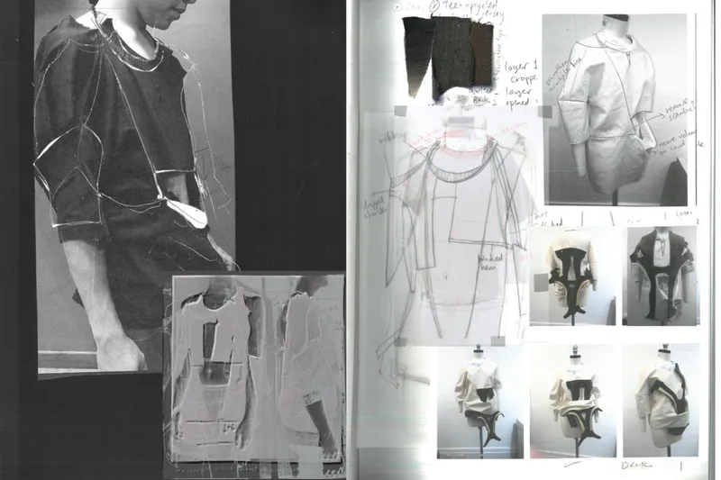 From the disfigured bodies of the nuclear power plant disaster of Chernobyl 1986, i found beauty in disintegration. I started deconstructing a baby carrier (pram) which resulted in a series of experiments using its inner foam padding. This deconstruction continues with an investigation on an easily-torn t-shirt prop. Through an imitation of the wear and tear, the highly fragile garment inspired the jersey aspect of the collection. Taking reference from the artist Lygia Clark, famous for her Obra Mole (1964), the collection focuses on creating a soft sculptural look with a juxtaposition of the ‘hard’ padded garments against the ‘soft’ jersey drapes. the theme of contrast surfaces in the prints created for the drapes. by experimenting with light and shadow, engineering the prints specifically to emphasise the shadows in the cowl drapes, depths of bright tones are revealed when in motion. This colour palette reflects better days ahead, coming out of the disaster, wishful in injecting a ray of brightness in the doom and gloom.”
