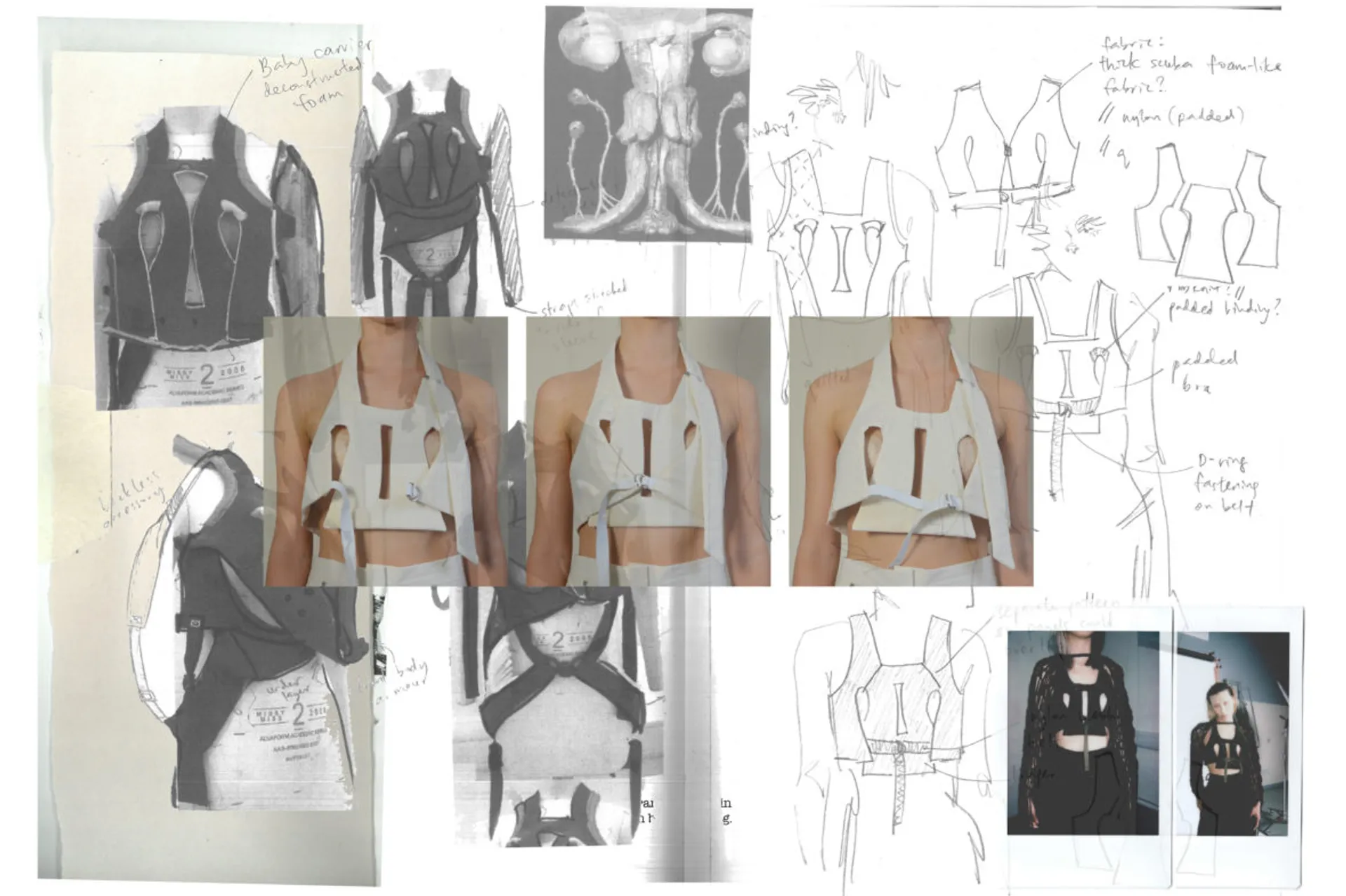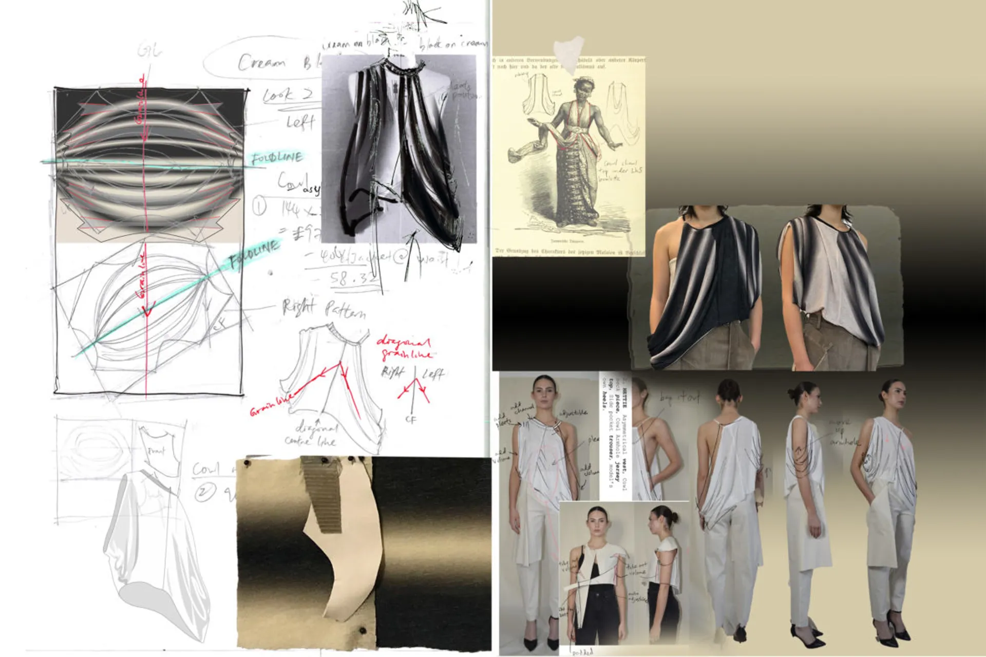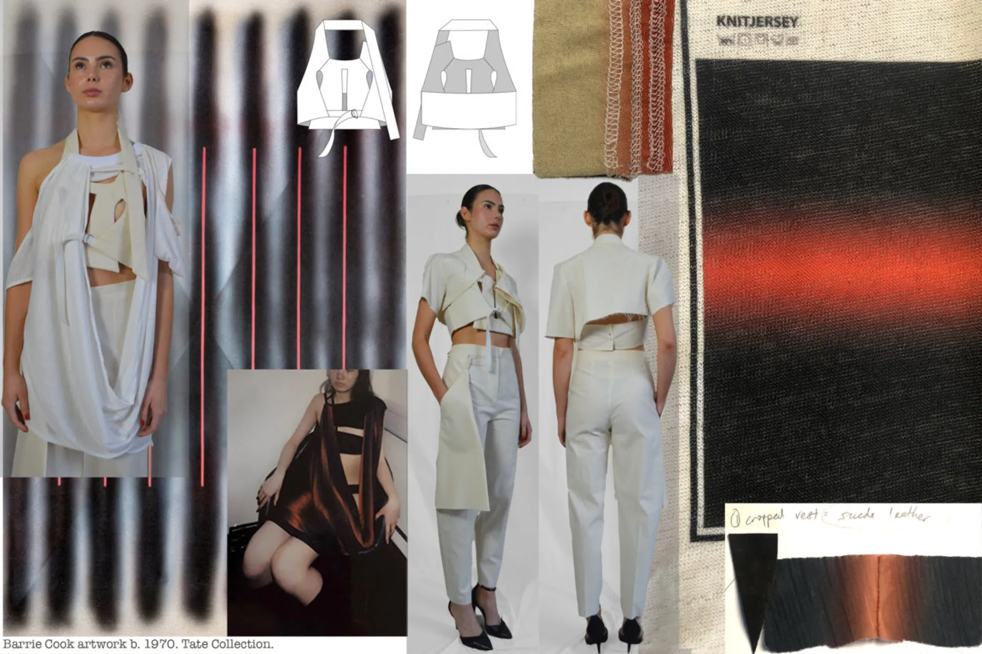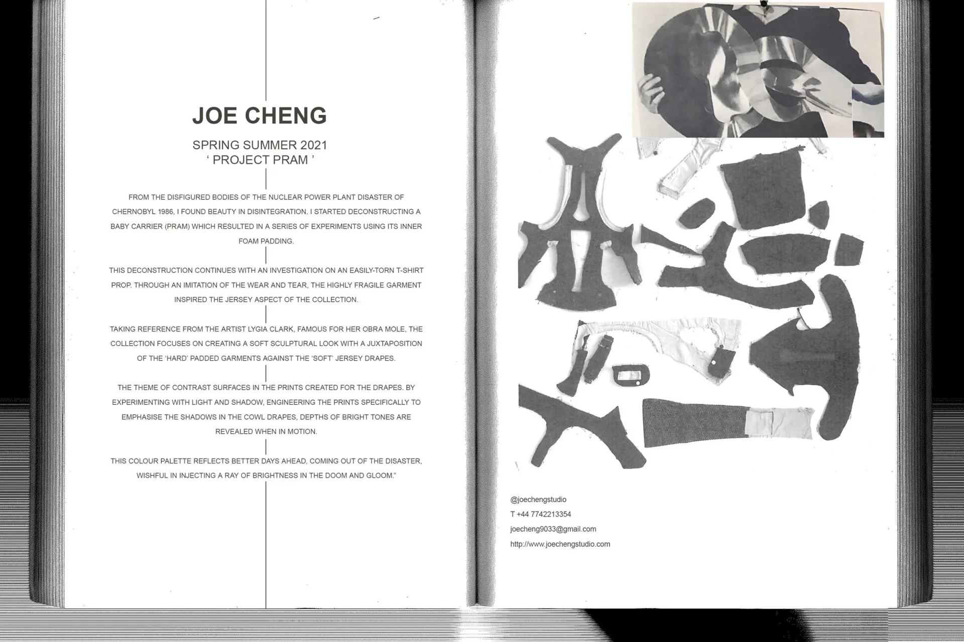 From the disfigured bodies of the nuclear power plant disaster of Chernobyl 1986, i found beauty in disintegration. I started deconstructing a baby carrier (pram) which resulted in a series of experiments using its inner foam padding. This deconstruction continues with an investigation on an easily-torn t-shirt prop. Through an imitation of the wear and tear, the highly fragile garment inspired the jersey aspect of the collection. Taking reference from the artist Lygia Clark, famous for her Obra Mole (1964), the collection focuses on creating a soft sculptural look with a juxtaposition of the ‘hard’ padded garments against the ‘soft’ jersey drapes. the theme of contrast surfaces in the prints created for the drapes. by experimenting with light and shadow, engineering the prints specifically to emphasise the shadows in the cowl drapes, depths of bright tones are revealed when in motion. This colour palette reflects better days ahead, coming out of the disaster, wishful in injecting a ray of brightness in the doom and gloom.”