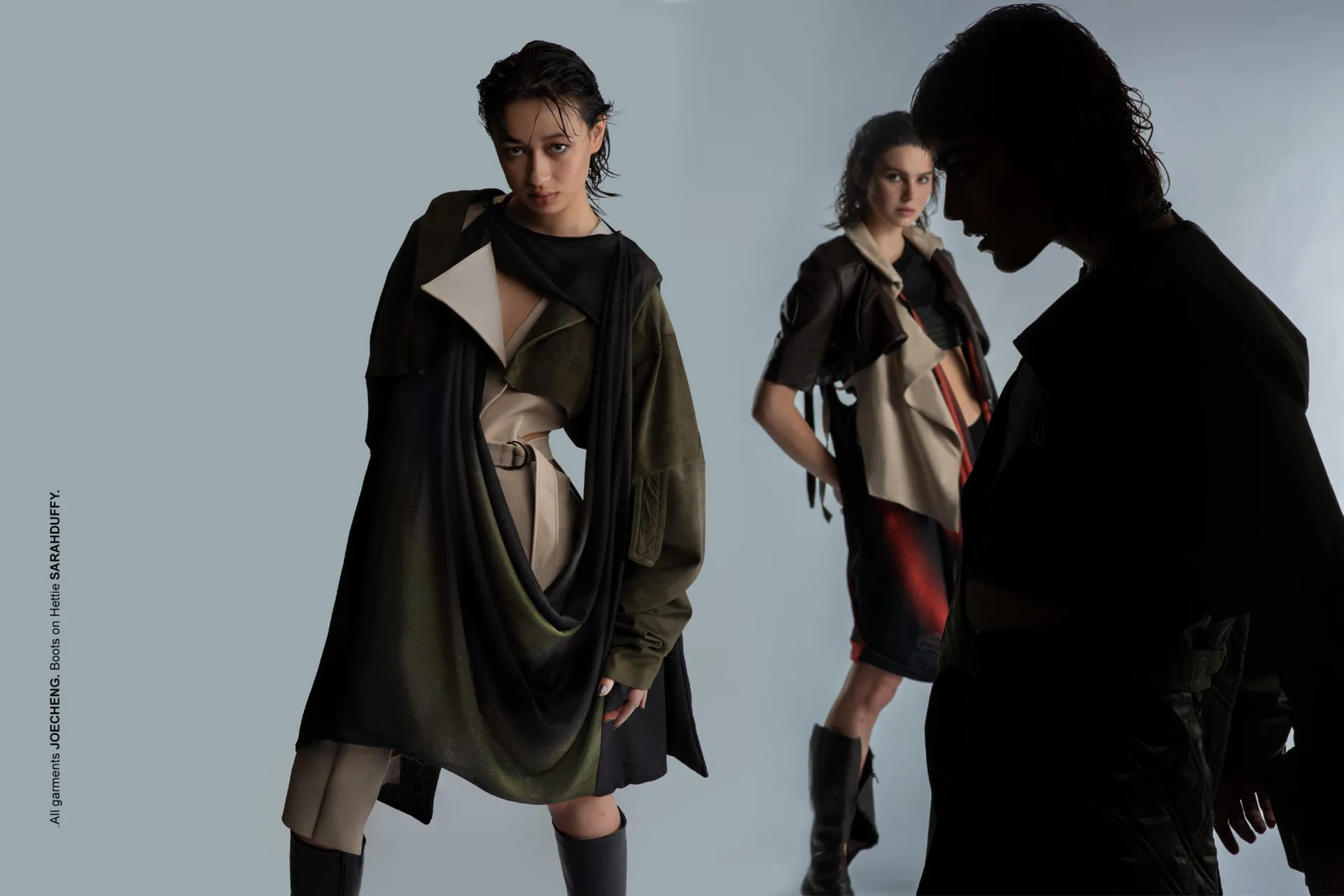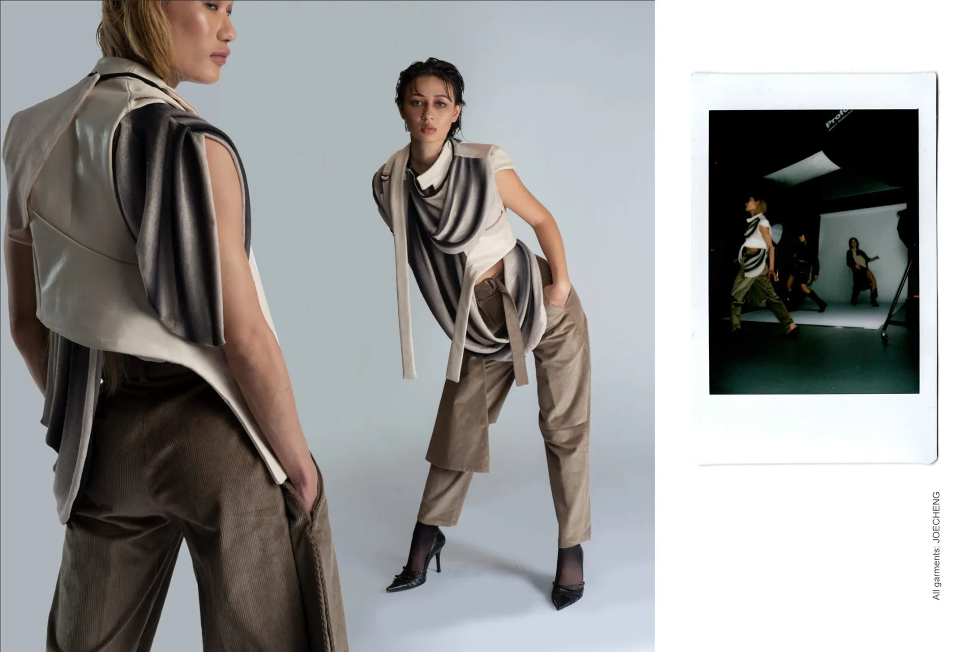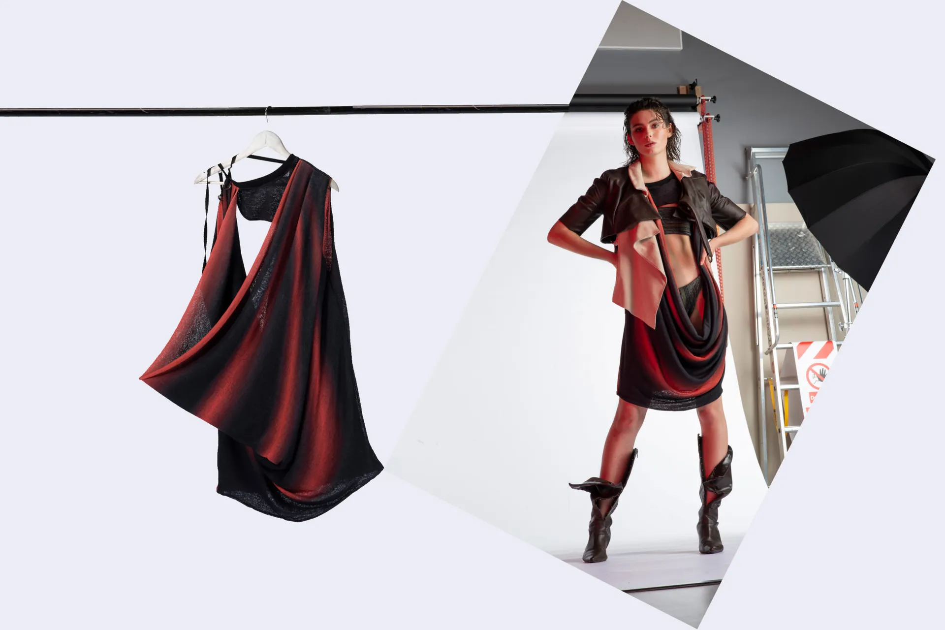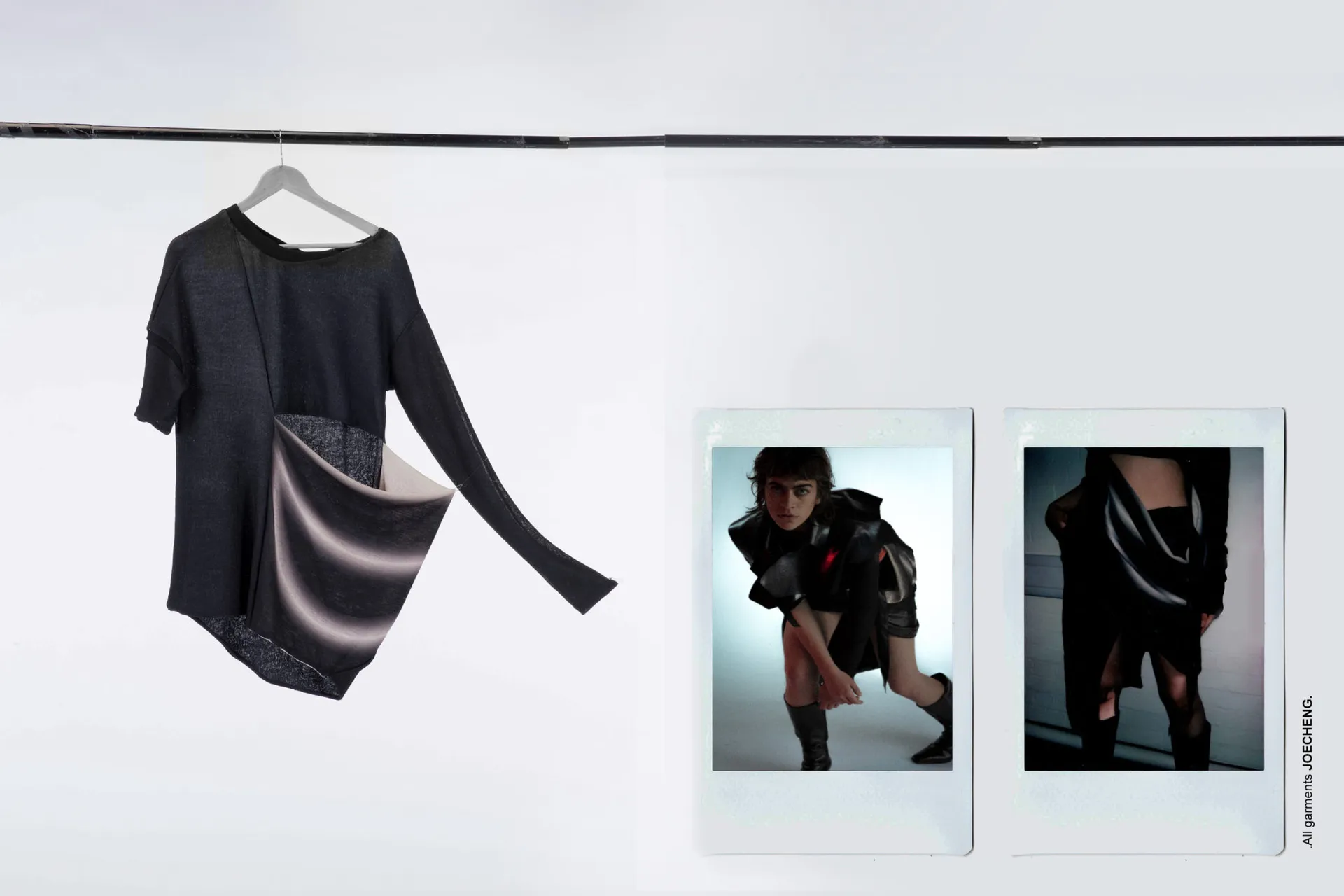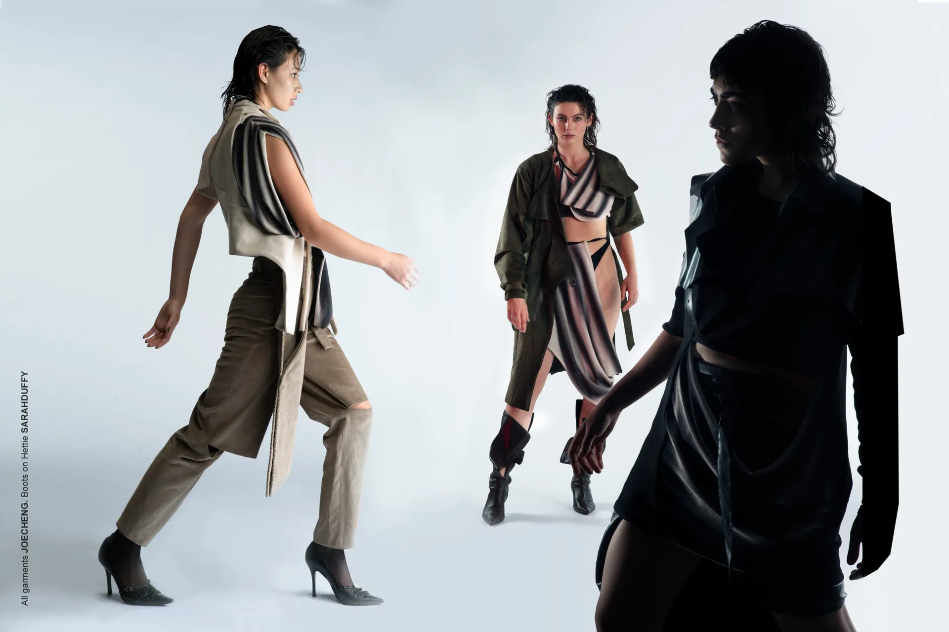 From the disfigured bodies of the nuclear power plant disaster of Chernobyl 1986, i found beauty in disintegration. I started deconstructing a baby carrier (pram) which resulted in a series of experiments using its inner foam padding. This deconstruction continues with an investigation on an easily-torn t-shirt prop. Through an imitation of the wear and tear, the highly fragile garment inspired the jersey aspect of the collection. Taking reference from the artist Lygia Clark, famous for her Obra Mole (1964), the collection focuses on creating a soft sculptural look with a juxtaposition of the ‘hard’ padded garments against the ‘soft’ jersey drapes. the theme of contrast surfaces in the prints created for the drapes. by experimenting with light and shadow, engineering the prints specifically to emphasise the shadows in the cowl drapes, depths of bright tones are revealed when in motion. This colour palette reflects better days ahead, coming out of the disaster, wishful in injecting a ray of brightness in the doom and gloom.”