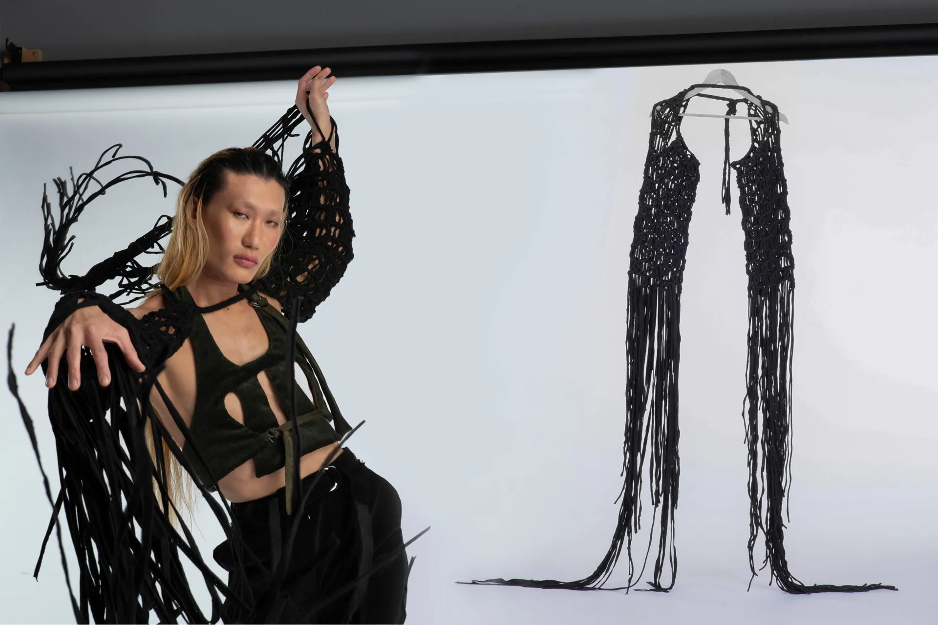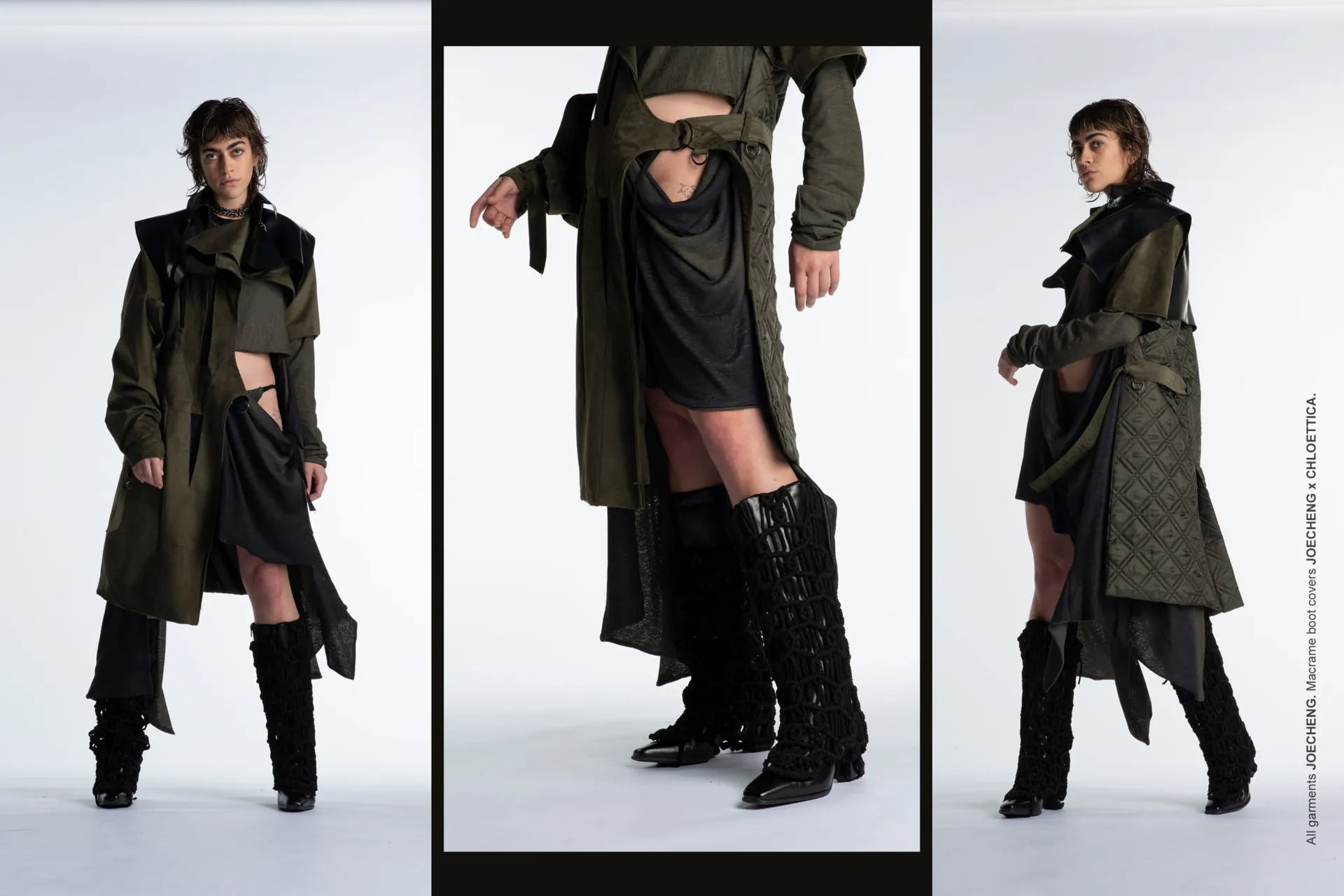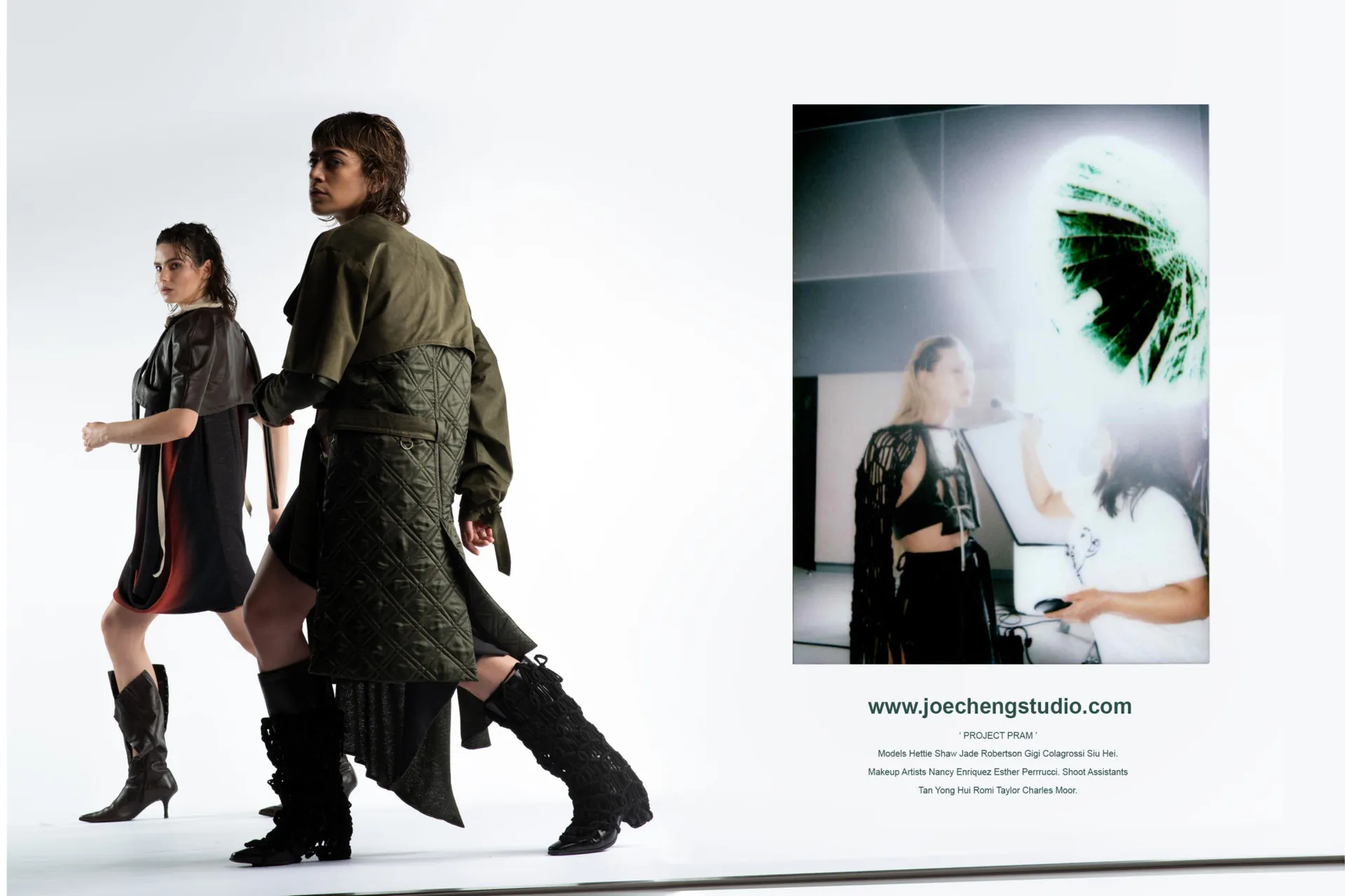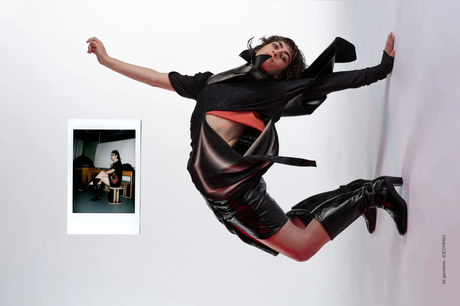 From the disfigured bodies of the nuclear power plant disaster of Chernobyl 1986, i found beauty in disintegration. I started deconstructing a baby carrier (pram) which resulted in a series of experiments using its inner foam padding. This deconstruction continues with an investigation on an easily-torn t-shirt prop. Through an imitation of the wear and tear, the highly fragile garment inspired the jersey aspect of the collection. Taking reference from the artist Lygia Clark, famous for her Obra Mole (1964), the collection focuses on creating a soft sculptural look with a juxtaposition of the ‘hard’ padded garments against the ‘soft’ jersey drapes. the theme of contrast surfaces in the prints created for the drapes. by experimenting with light and shadow, engineering the prints specifically to emphasise the shadows in the cowl drapes, depths of bright tones are revealed when in motion. This colour palette reflects better days ahead, coming out of the disaster, wishful in injecting a ray of brightness in the doom and gloom.”