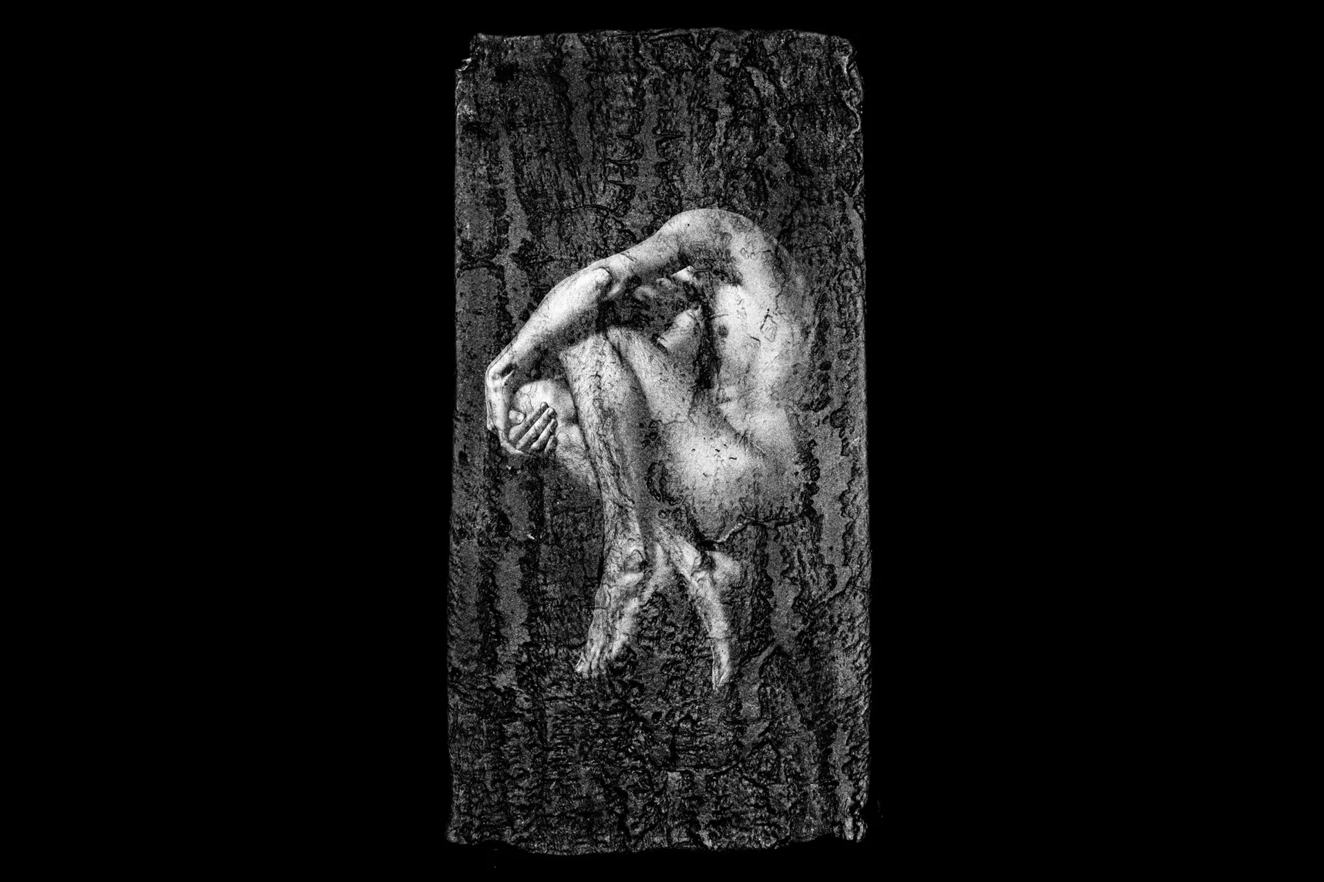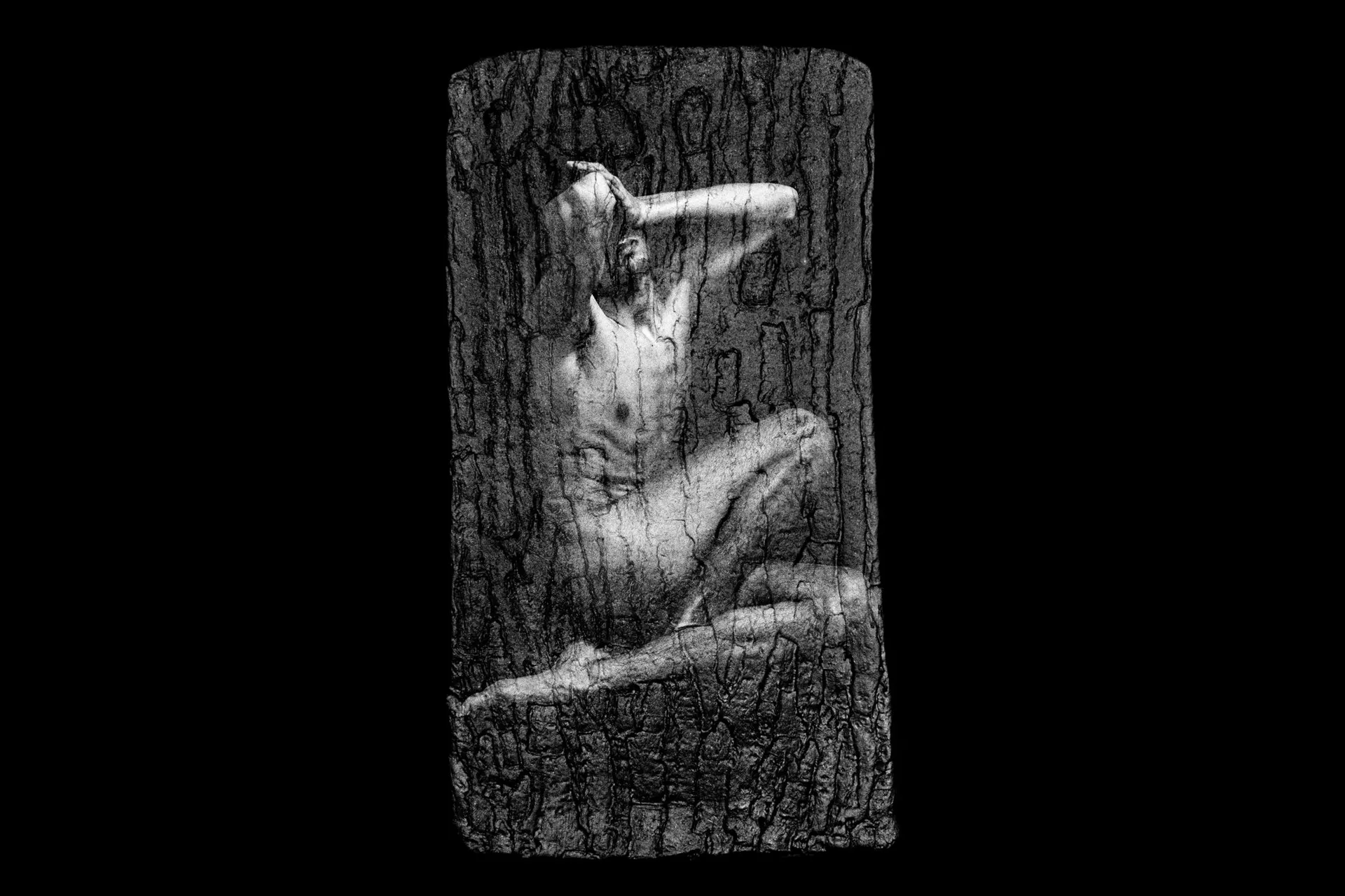 The global pandemic with the consecutive lockdowns that contributed inevitably to some people’s further isolation and introversion was a definite source of inspiration. The use of trees in this series of artwork is representative of the space where humans are trapped in. This idea is based on the ancient Greek nymphs, the Hamadryads, who lived inside the trees. Clay has been used to get the footprint of the tree trunk. The tree element is eventually presented as a petrified object that the human who lives inside is not able to escape from.