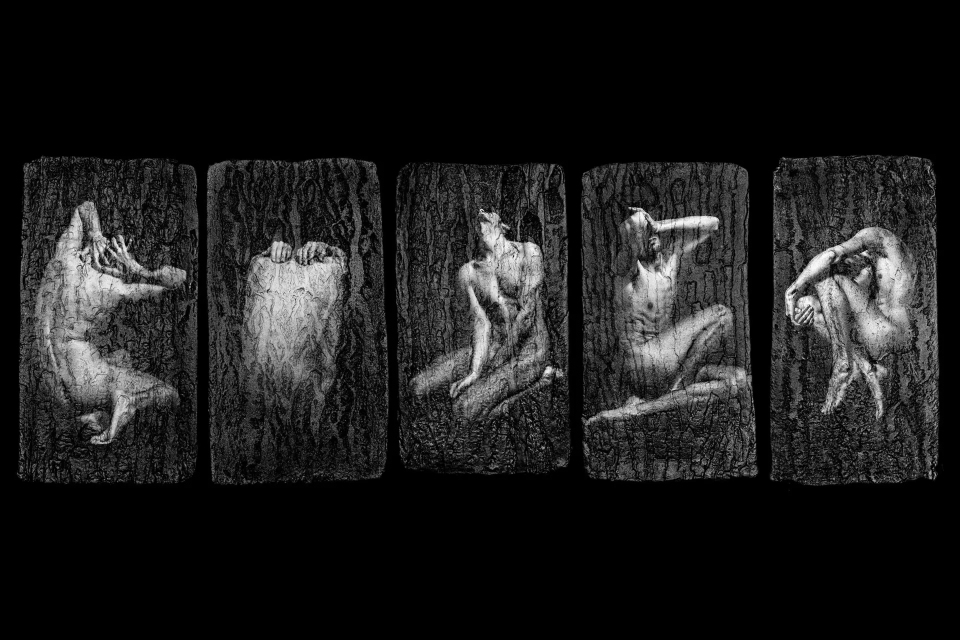 The clay ”tree masks” capture the exact moment that the human is trapped in the tree, whereas the different poses of the nude human body indicate the state of loneliness, despair and exhaustion that has reached its limits and bears no long. It’s now time to break through, time for liberation.