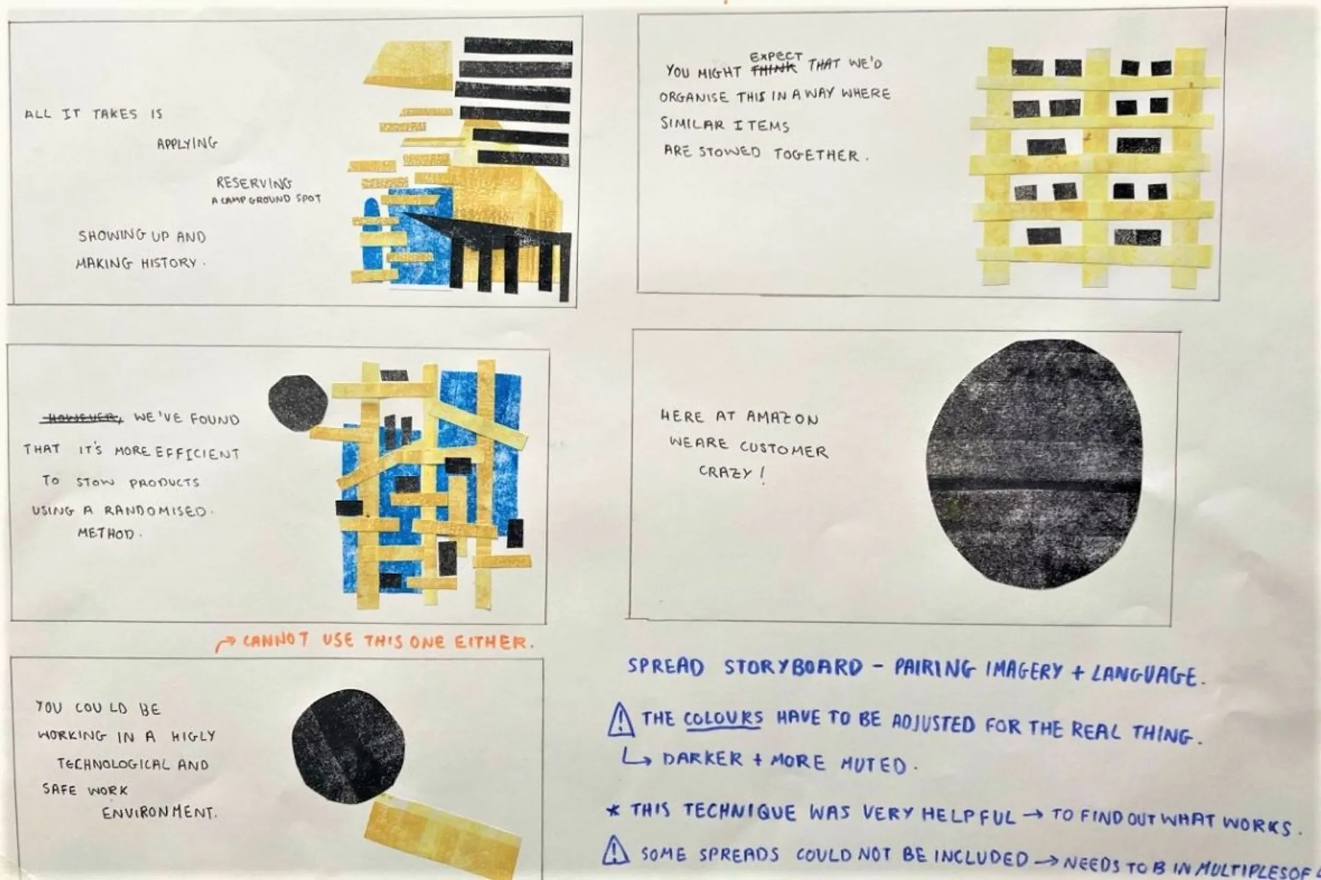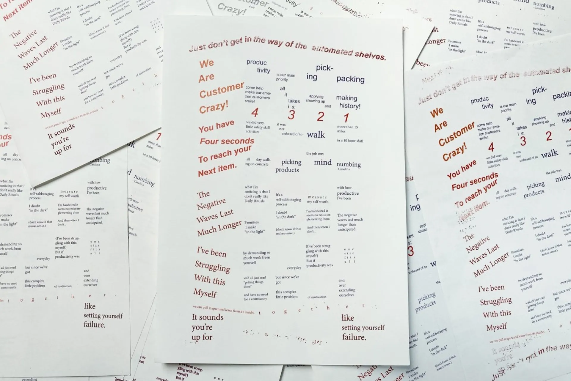 My animation scrutinises the notion that maximum productivity is always the desired outcome.The language from the voiceover is collected from personal accounts from the r/DailyRituals community and Carolina, a former employee of Amazon’s Camper Force. Alongside this, a collection of prints act as a transcript, reflecting the chaotic outcome working at peak productivity, resulting in misprints.