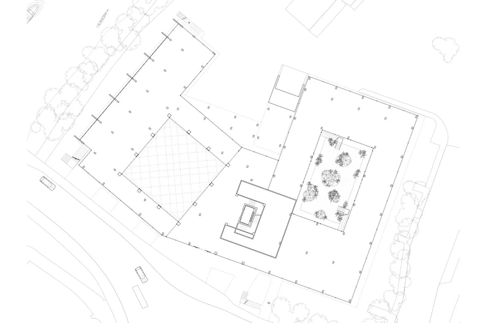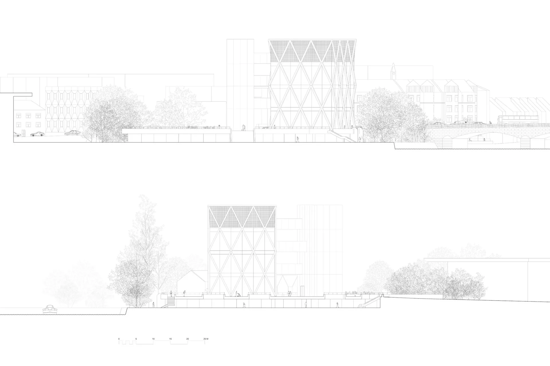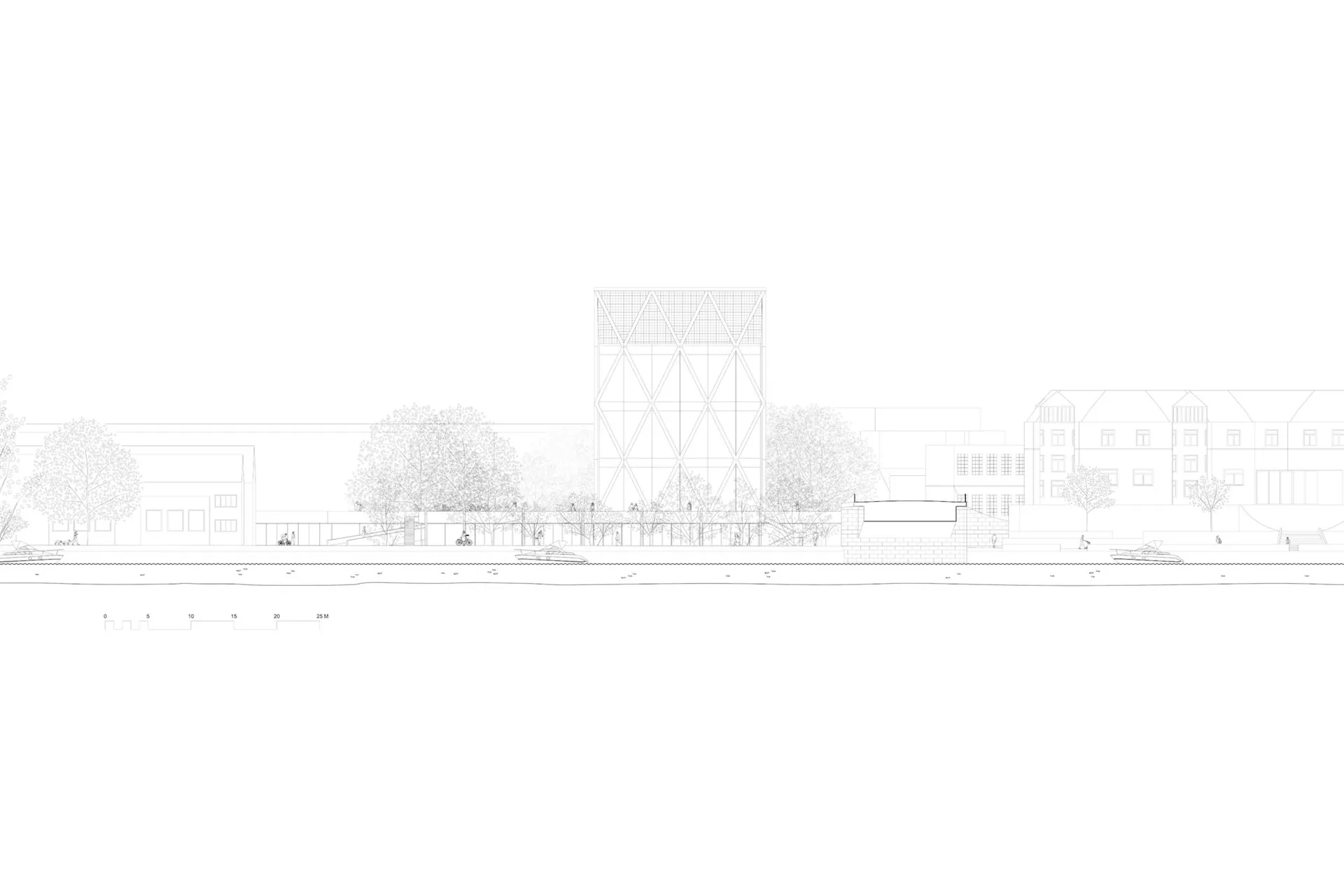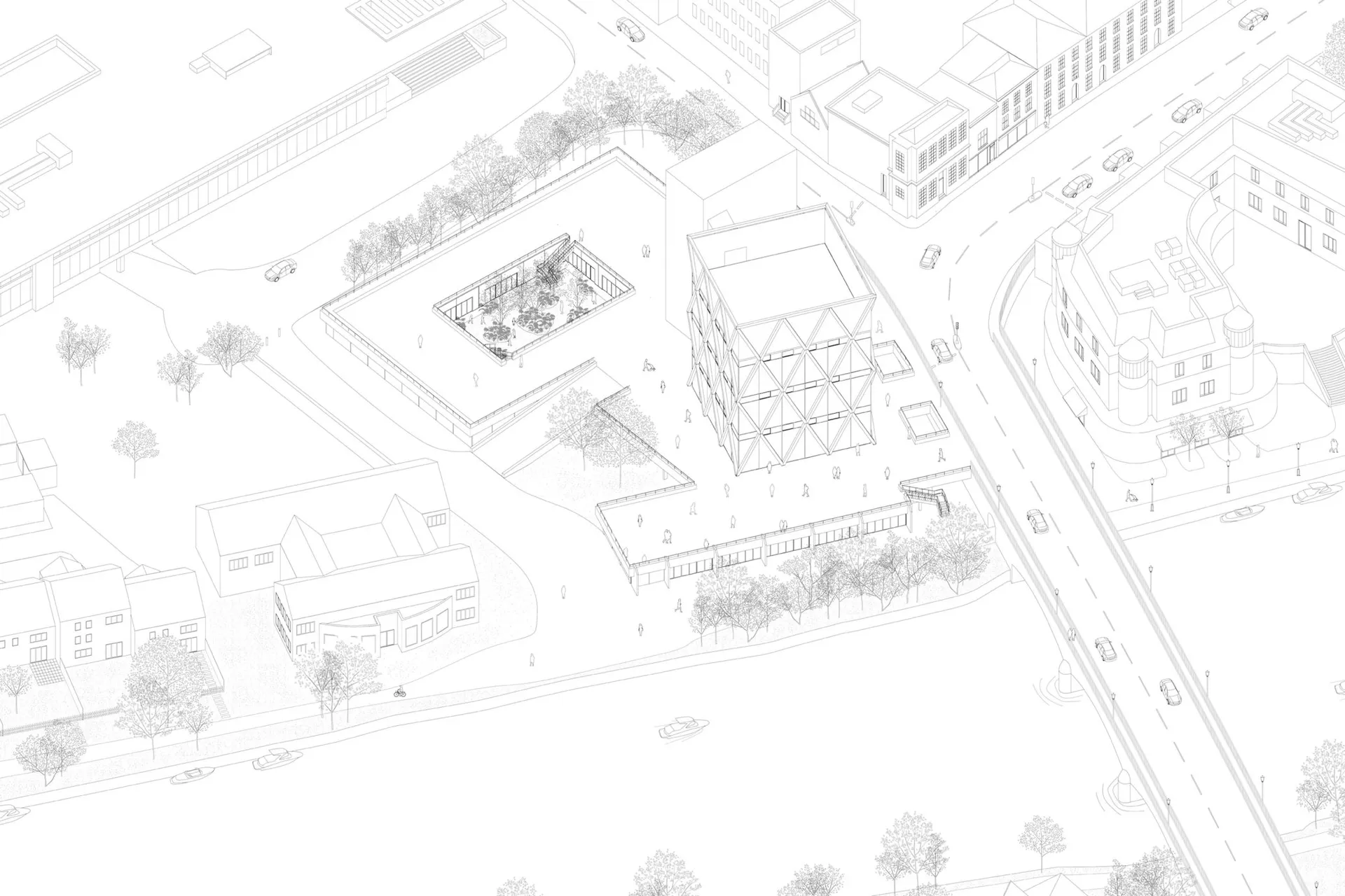 The interior of the former car park is divided into 3 zones. The north end which surrounds the courtyard is defined by the grid of the columns which support the car park. The south side addresses the river edge and can be one or two large rooms. The double-height room below the tower can be closed to create an auditorium-like room or left open as a type of public space. The roof of the car park then becomes a garden.