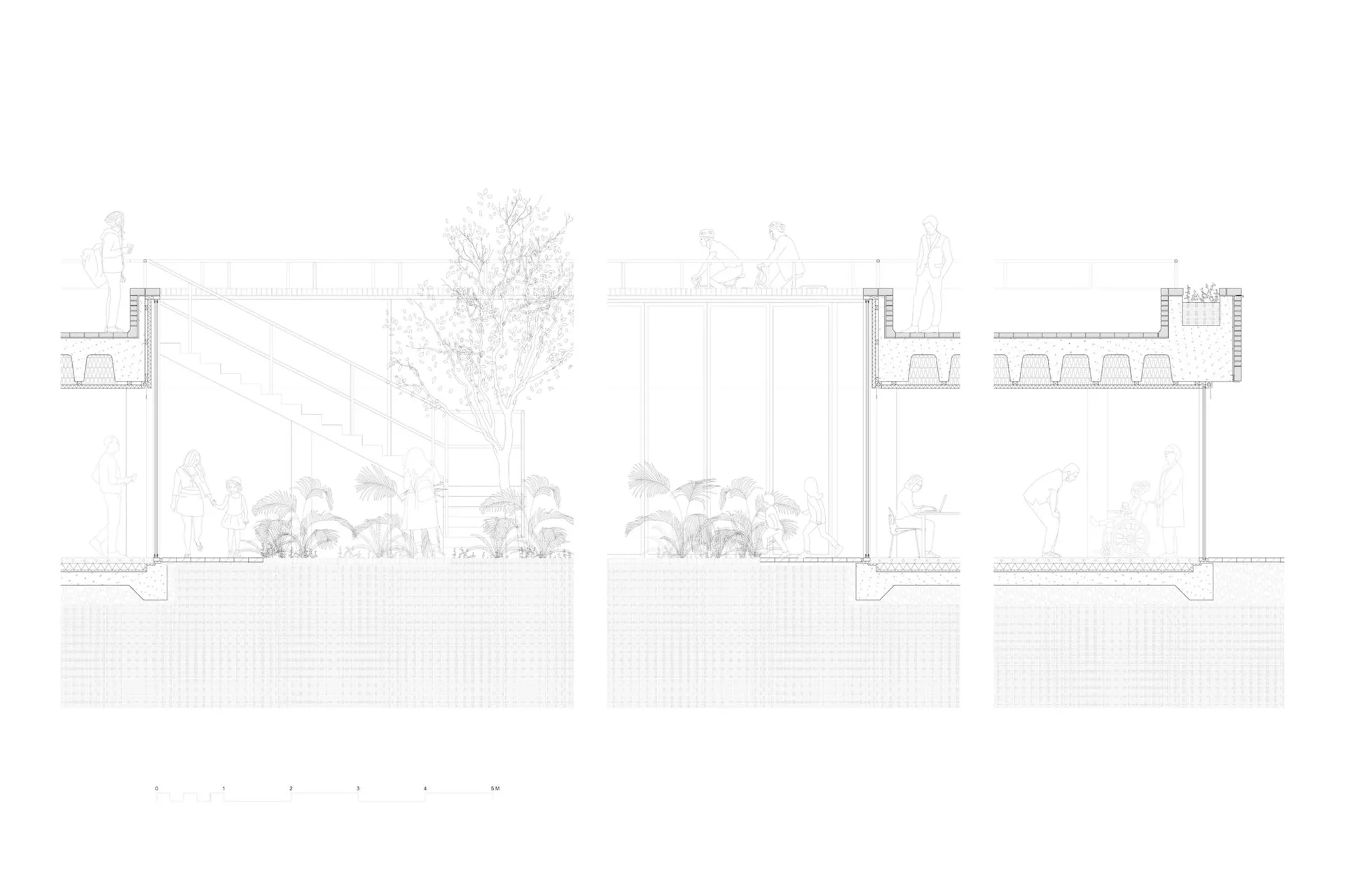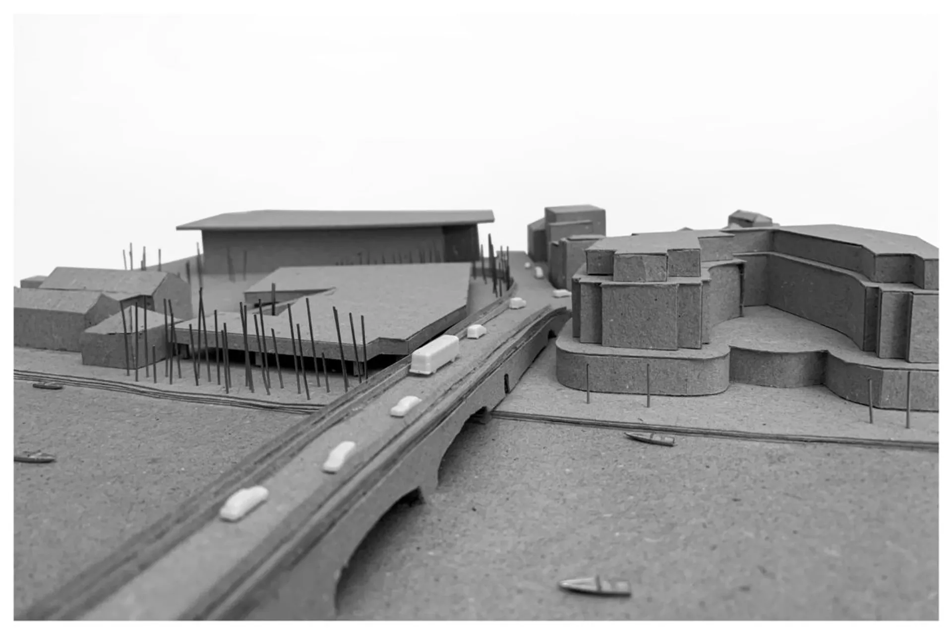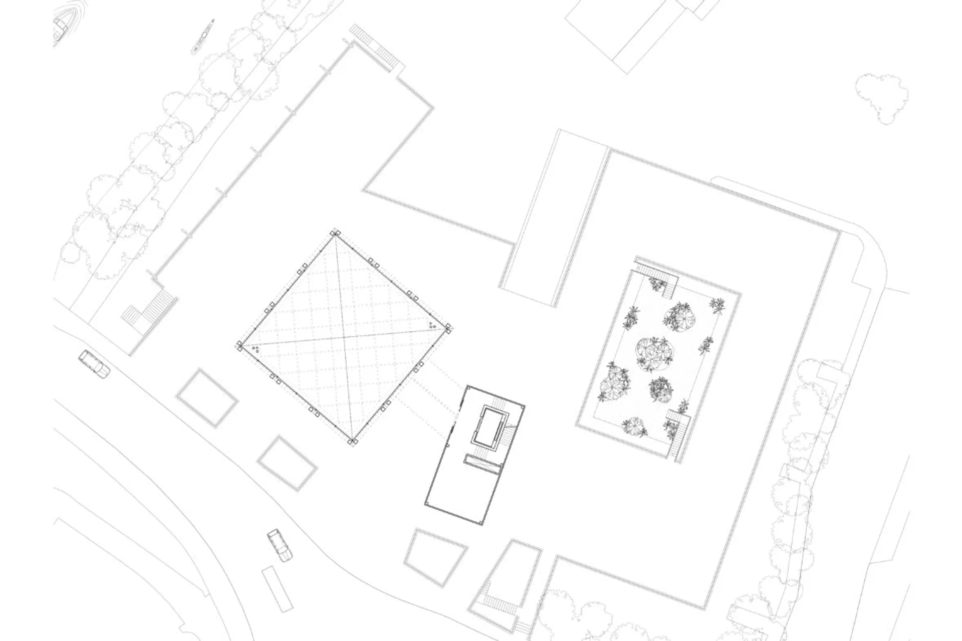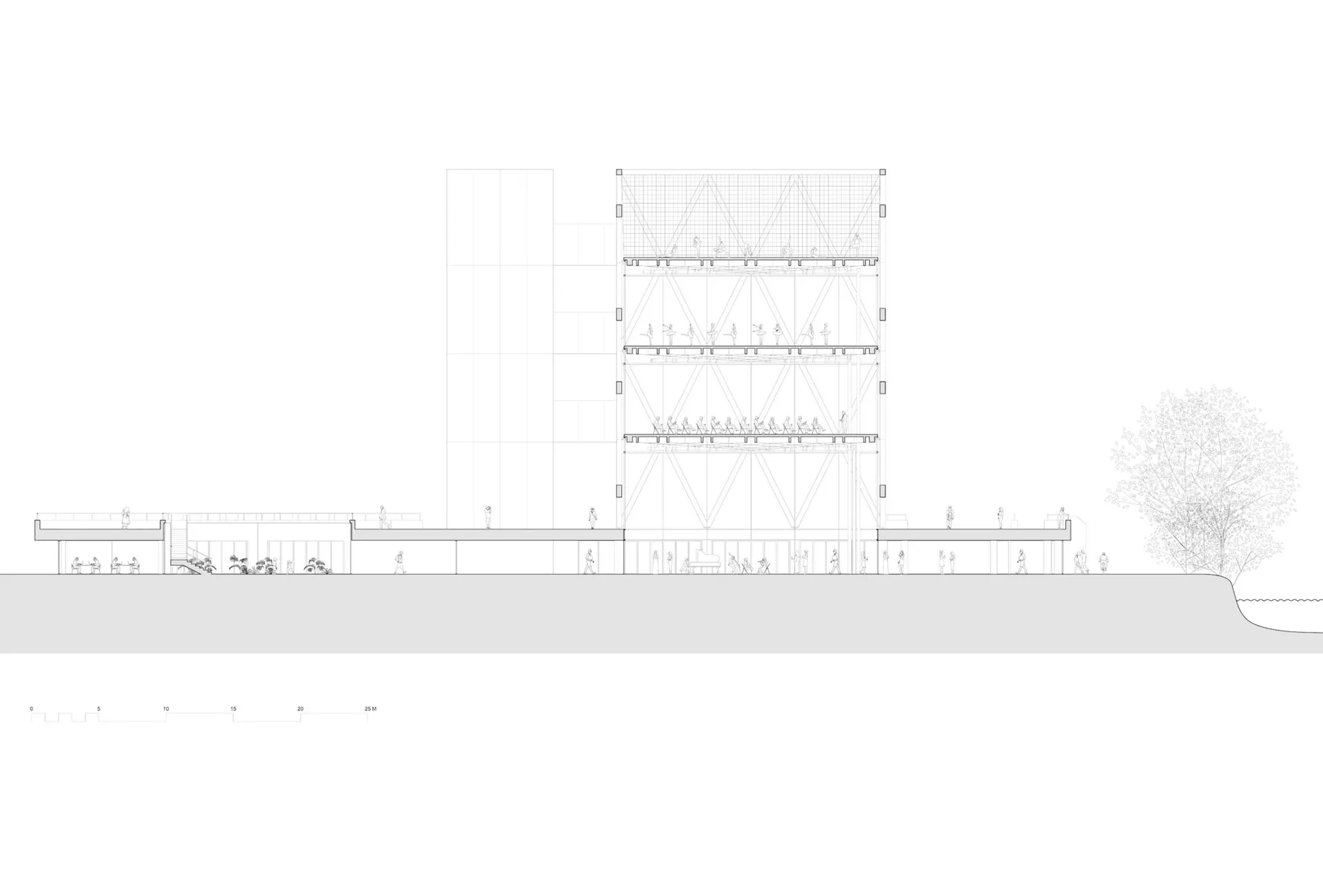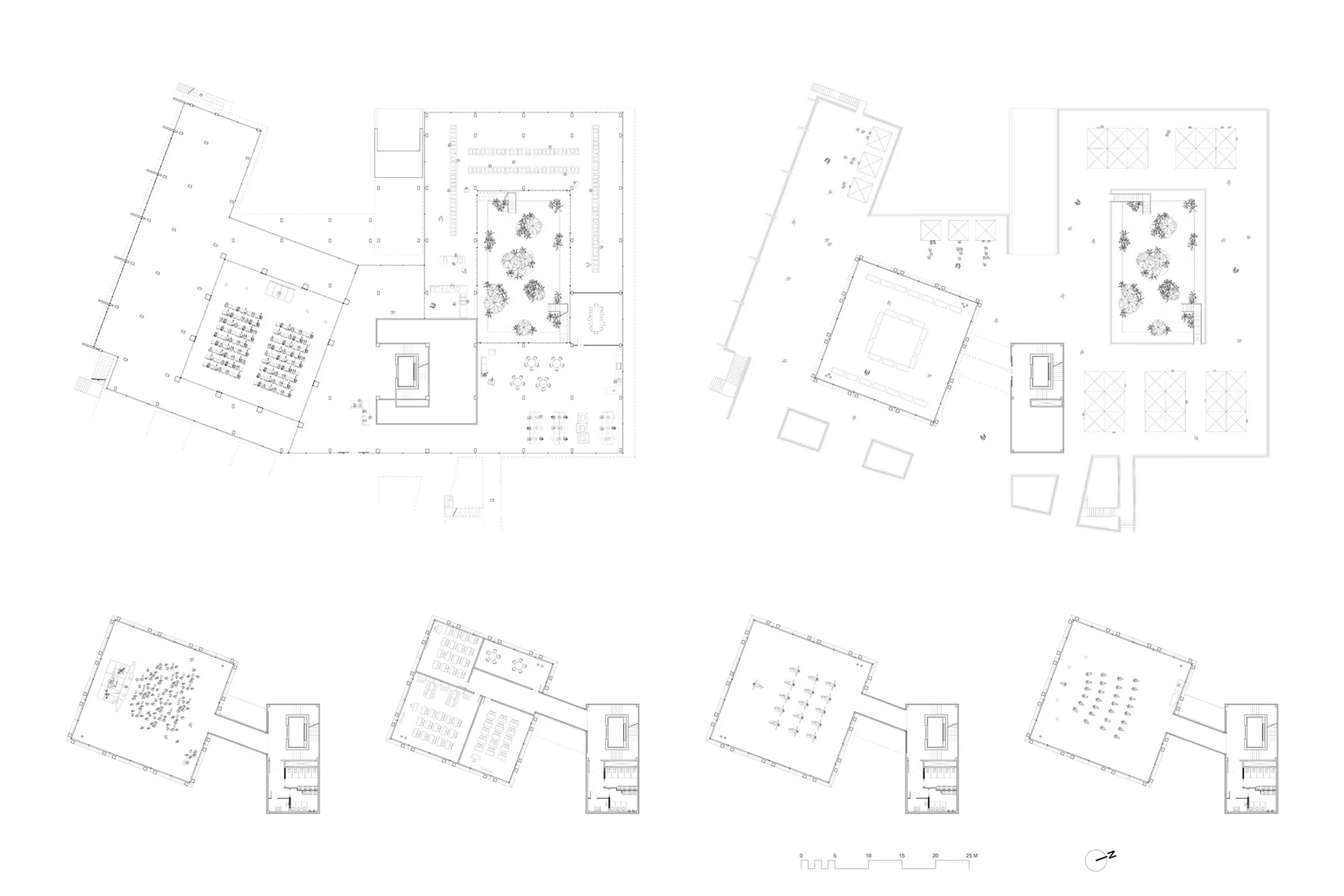 The interior of the former car park is divided into 3 zones. The north end which surrounds the courtyard is defined by the grid of the columns which support the car park. The south side addresses the river edge and can be one or two large rooms. The double-height room below the tower can be closed to create an auditorium-like room or left open as a type of public space. The roof of the car park then becomes a garden.