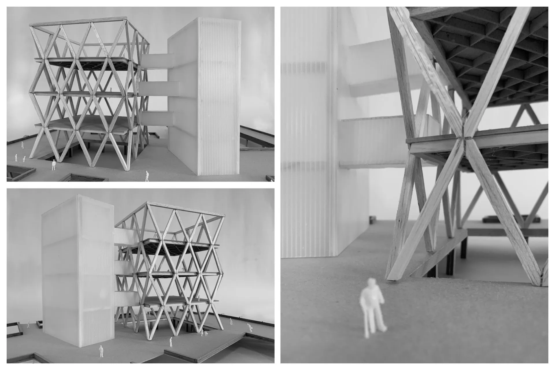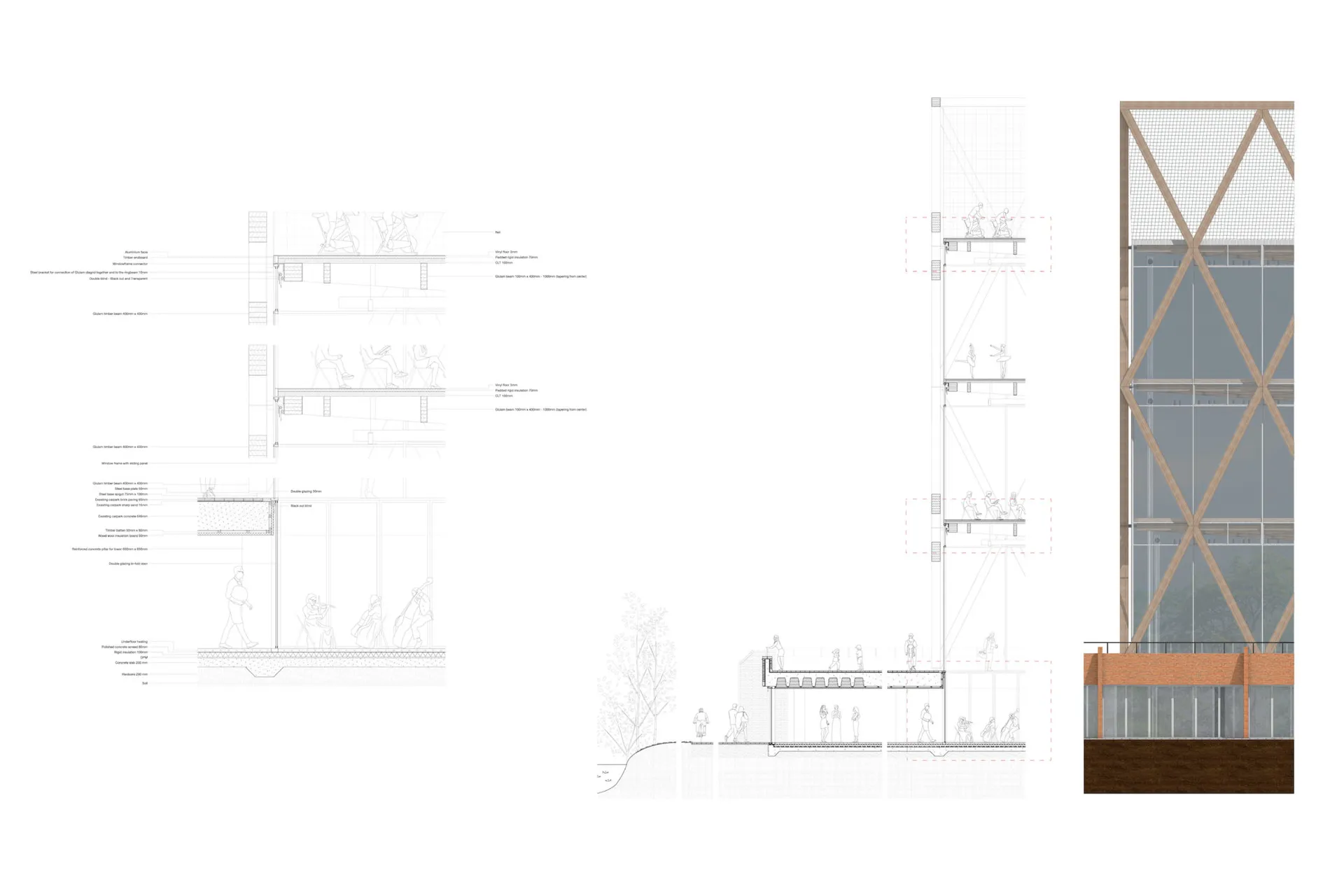The tower is a timber diagrid exoskeleton supporting timber floor plates and enclosed by a glazed curtain wall system. The floor plates of the tower are free of columns and a second tower contains circulation and services with walkways between the two.