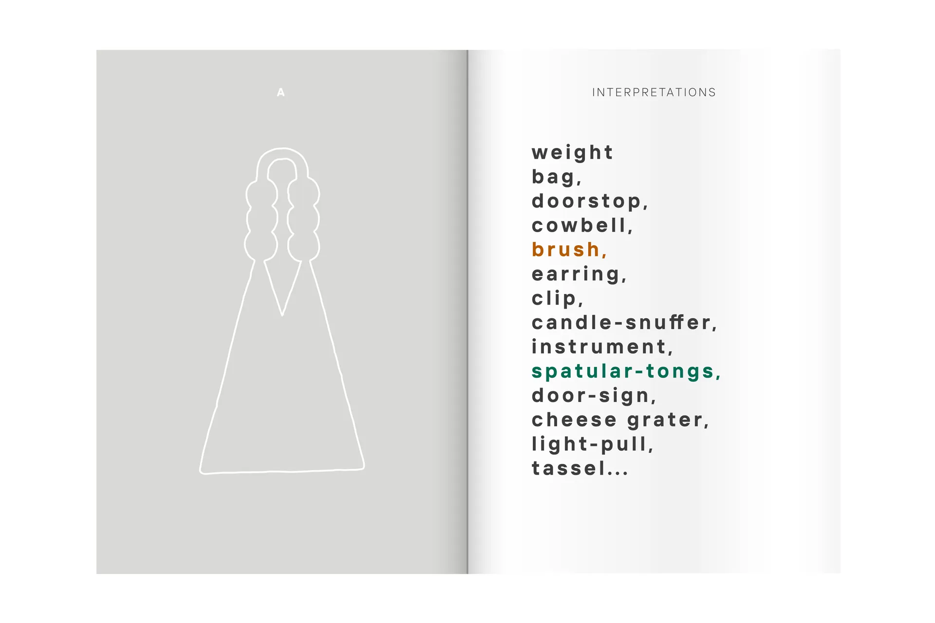 Many of the exhibited objects represent crowd-sourced interpretations of intentionally ambiguous drawings. Participants were asked to suggest possible uses for graphic forms, which later informed the development of unique and useful contemporary design objects.
