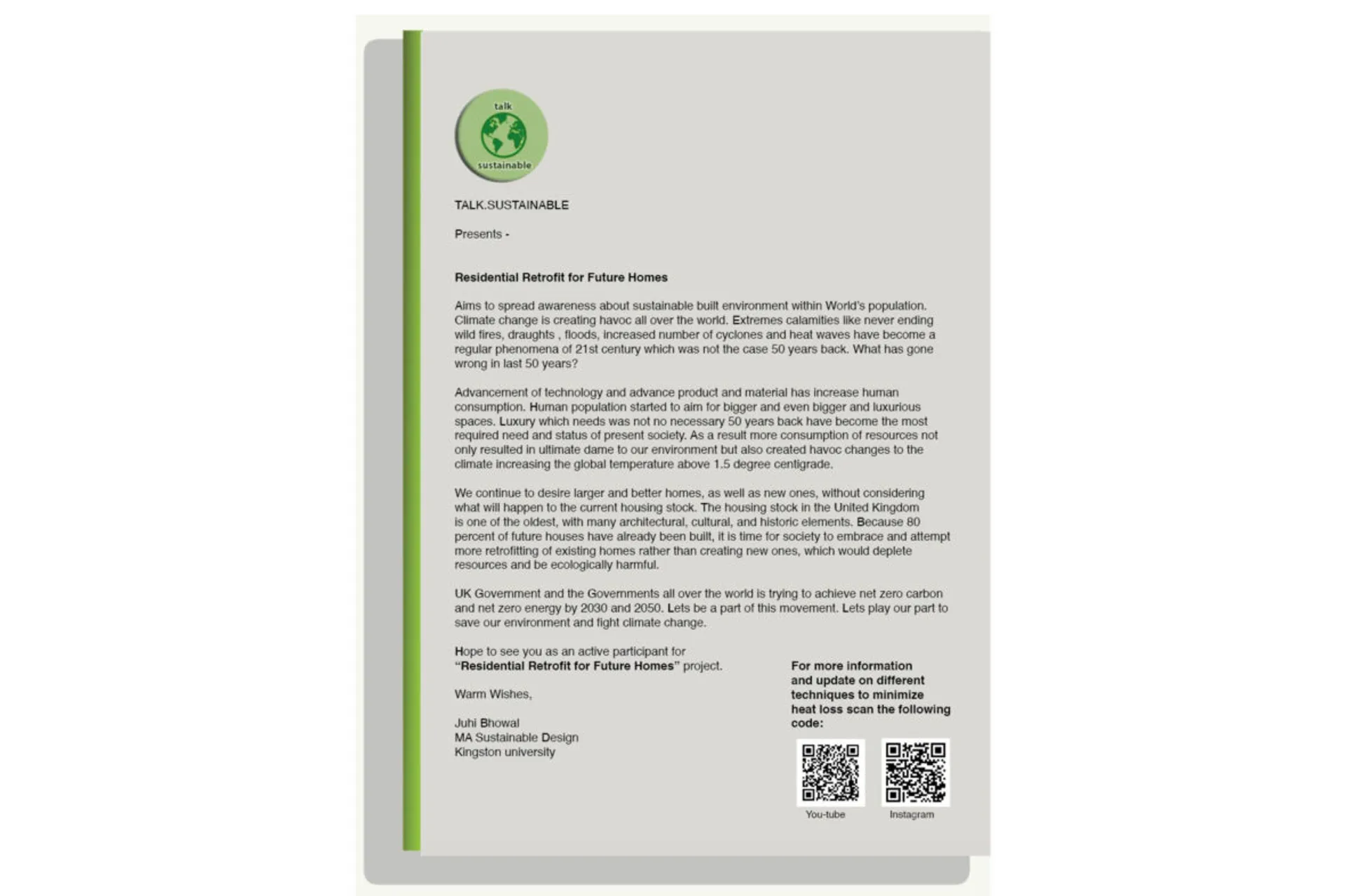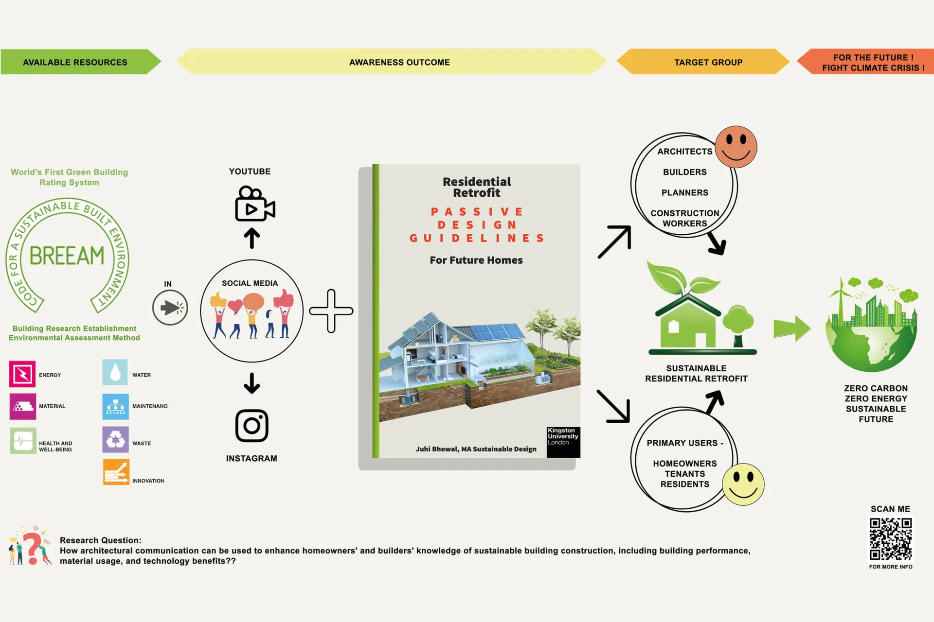 The project utilises the BREEAM sustainability guidelines to identify the most significant metrics for residential retrofit and delivers these parameters to homeowners and builders via short YouTube videos, Instagram posts, and a booklet.