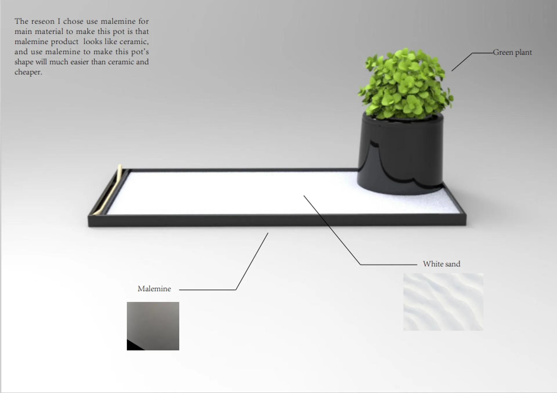 Zen garden plant pot is design for the situation that people need stay at home because of coronavirus, I want make a product which can bring nature atmosphere at home, and I also want to use this opportunity to let Westerners know more about Eastern culture, so, Zen garden plant pot burn
