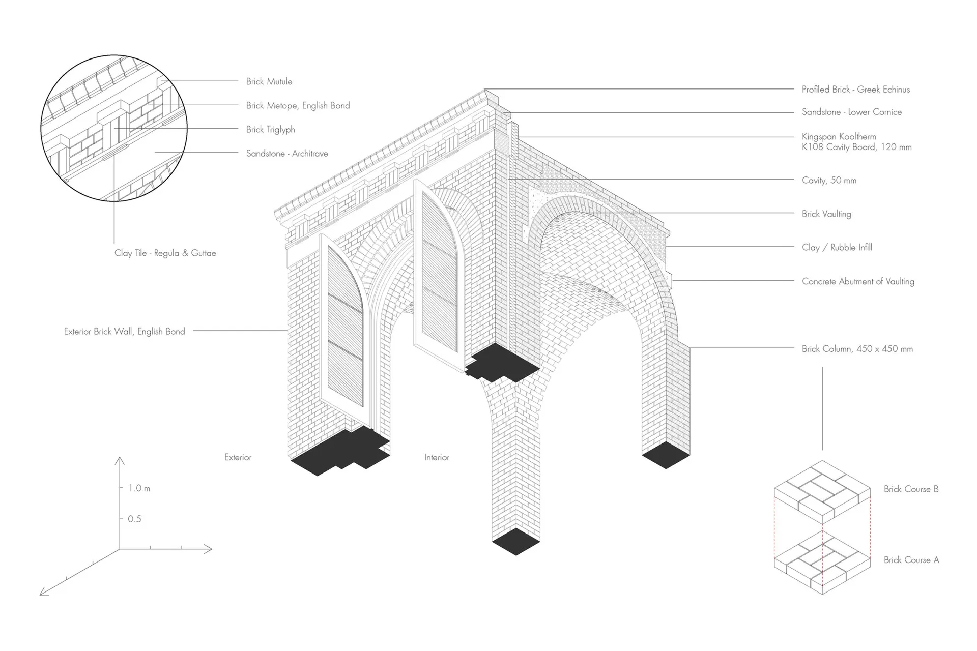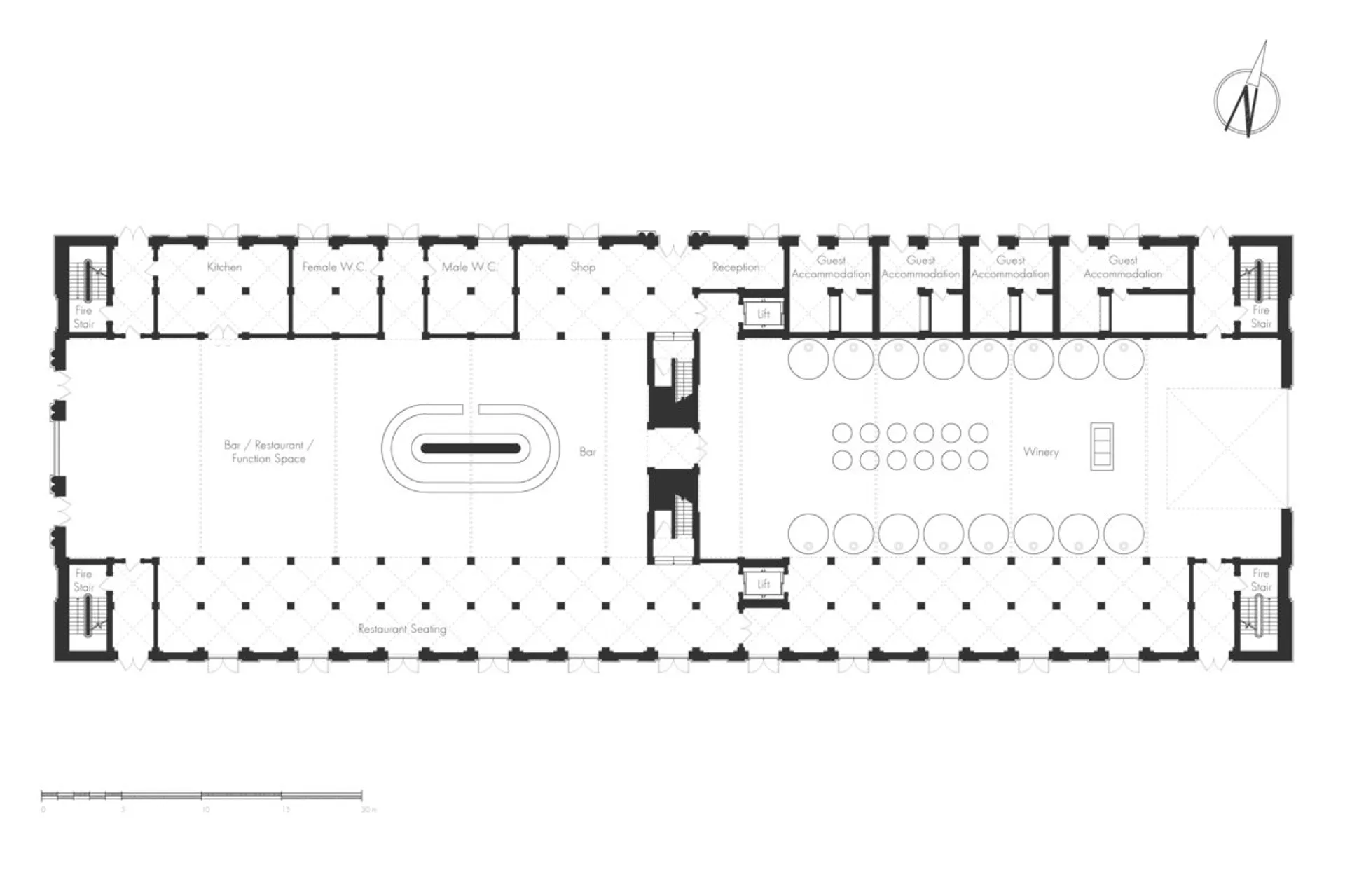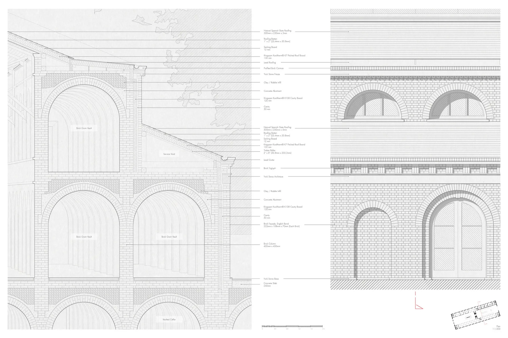 My design proposal attempts to realise tradition both in terms of construction and linguistics; in-depth studies into the Classical language of architecture and tectonic traditions in construction jointly inform a scheme for a new building at Penn Croft Winery, home to Itasca Wines Ltd. – a newly established business near Crondall, Hampshire. The proposed development will act to transform Penn Croft Winery from a purely agricultural complex into a commercial hub for the company, designed to accommodate visitors and to provide them with an involved experience in Itasca’s operation as a sustainable, yet traditional, English winery.