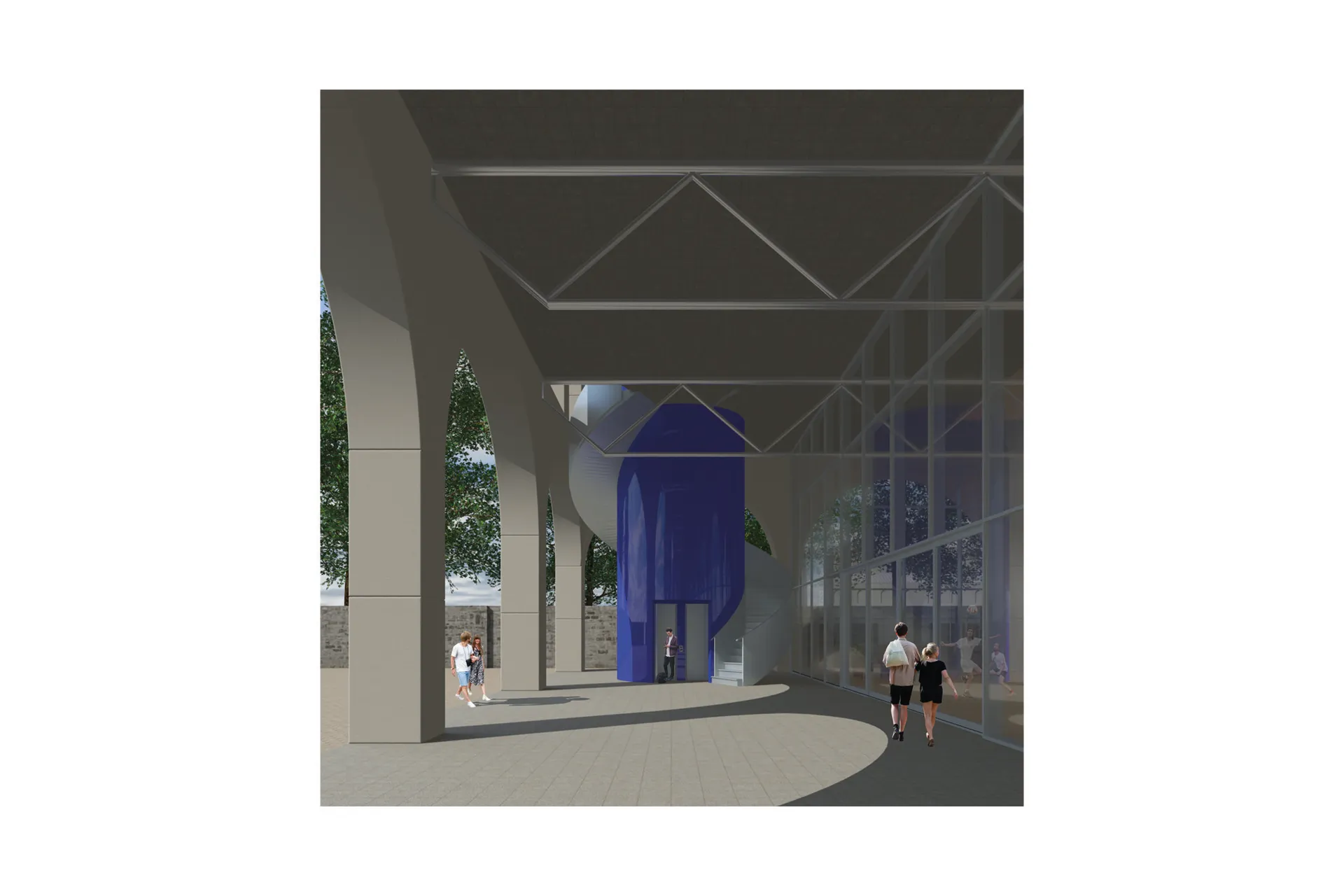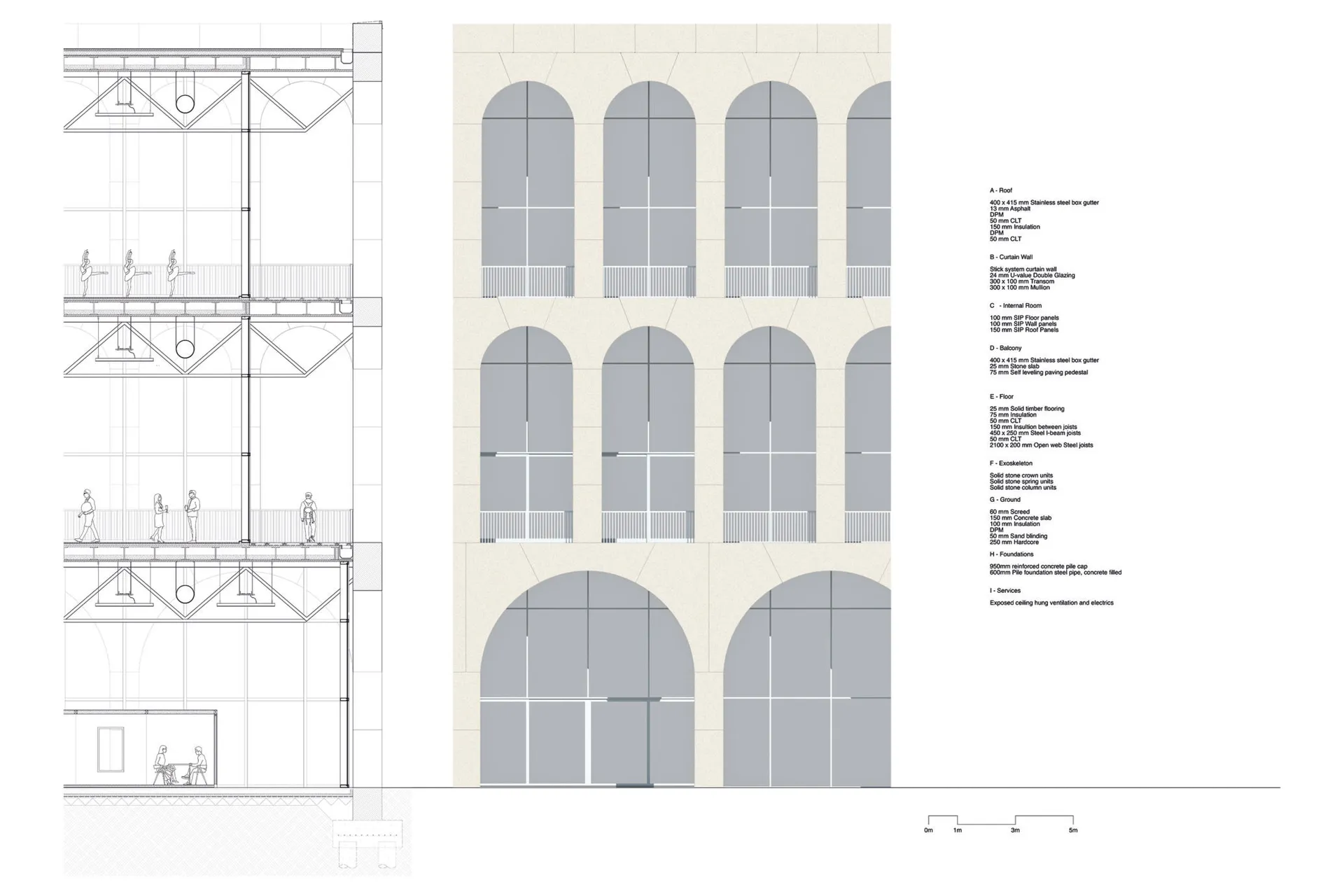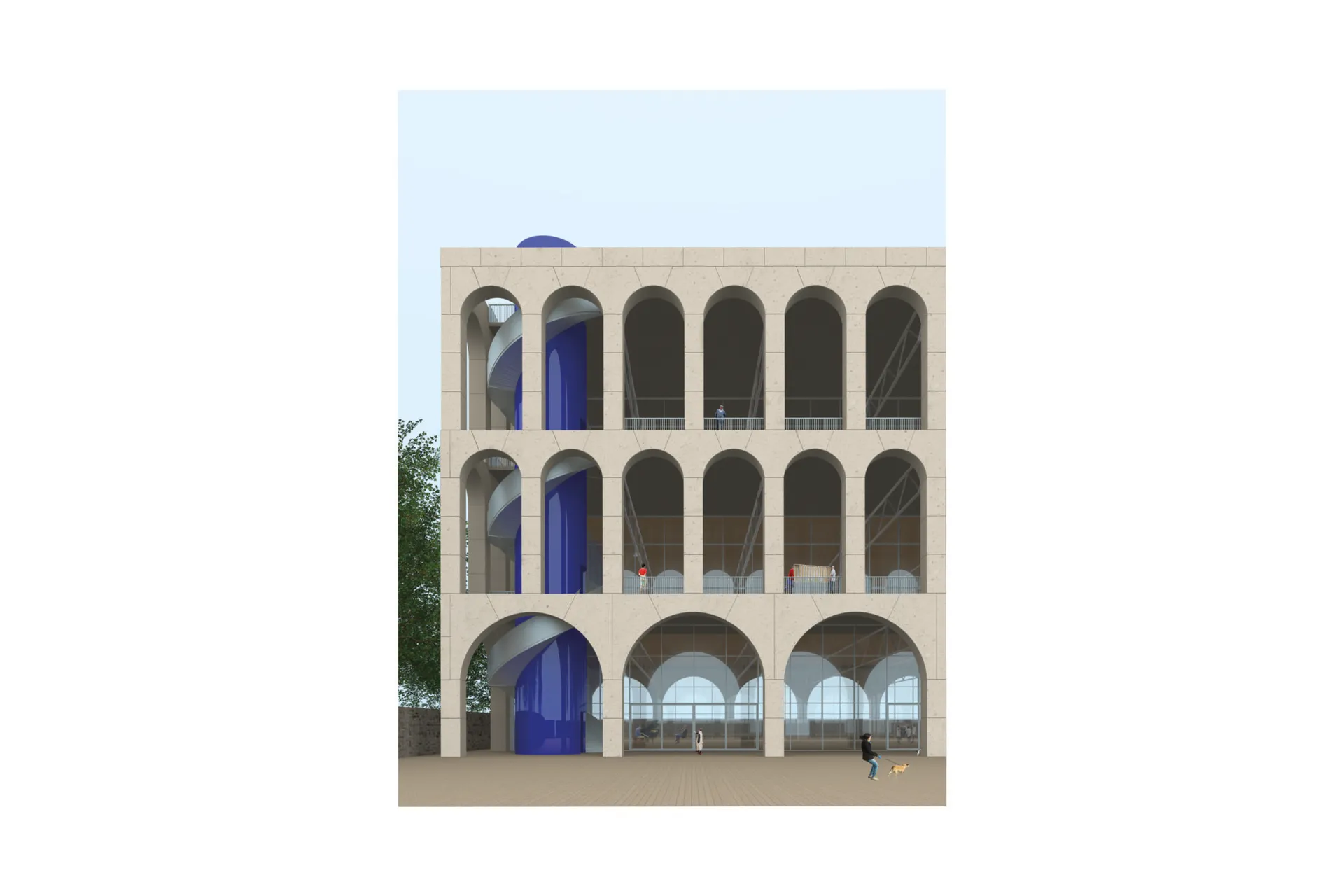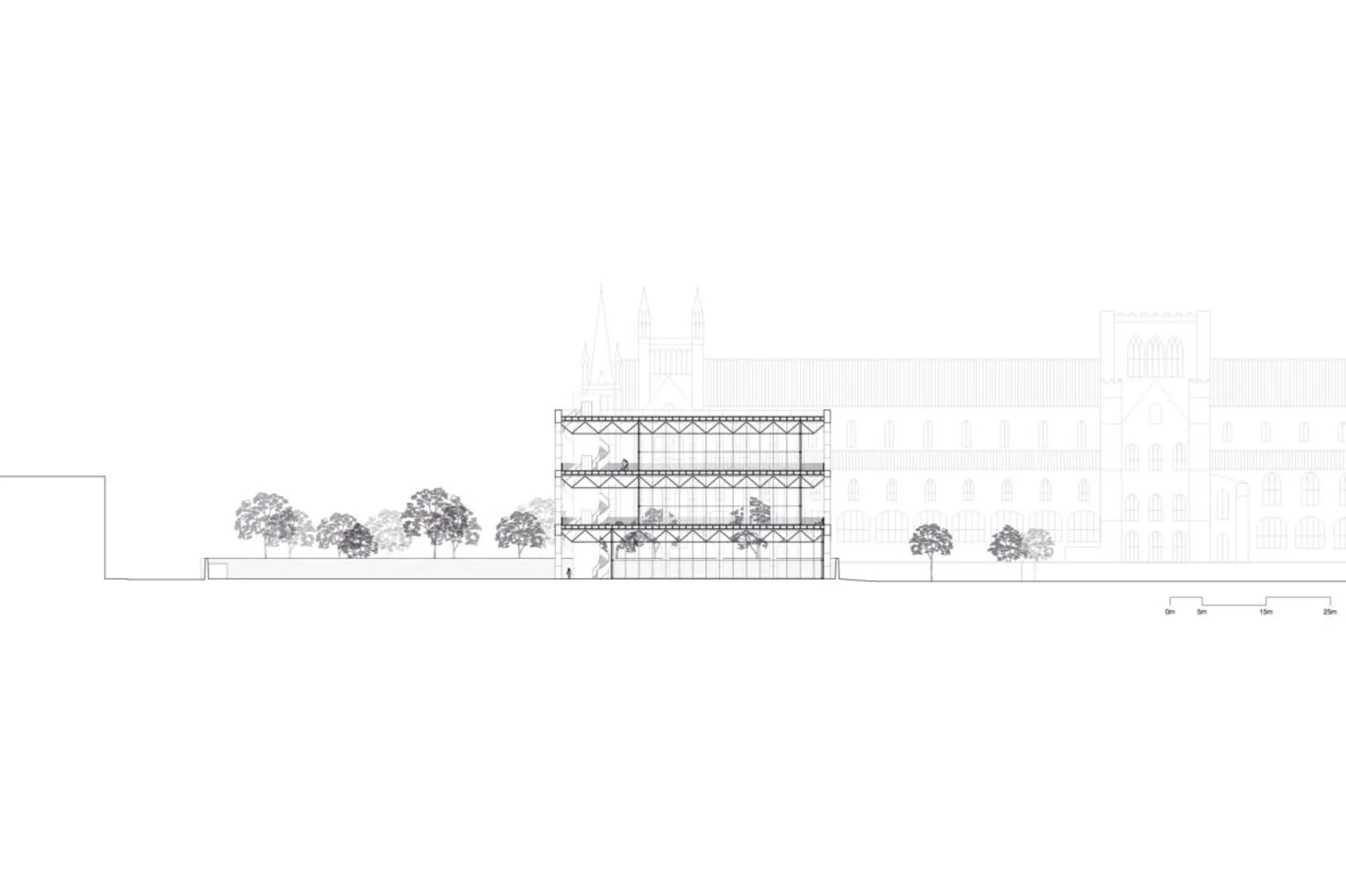 Located in my hometown of Peterborough, roughly 100 miles north of London. Peterborough has a population 203,600 people and a diverse community. This project will create a flexible space for the people of Peterborough, a buildings that can be adapted to different functions, activities and sports. Many of the civic buildings of Peterborough feature arches, from the west façade of the cathedral to the shopping centre car park and this was a theme I wanted to explore within my design. The building is located within the central ward of the city, close to the town amenities and other civic buildings such as the cathedral, public swimming pool and court houses. The structure consists of a monolithic exoskeleton of solid limestone and single span steel trusses. The stone façade is made up of a series of components similar to the works of Gilles Perraudin, the concept of components allows for a more economical approach towards the construction. Large steel open-web trusses span 41 meters across the shortest axis of the structure (east to west). These large span trusses support large open floor plates uninterrupted by any columns, this was an idea influenced by the Centre Pompidou designed by Richard Rodgers and Renzo Piano. These column free spaces enable the building to accommodate many different uses from lectures to an emergency health centre to badminton courts. A curtain wall glazing system creates the thermal envelope of the building and then internally structural insulation panels create spaces with a warmer environment and an element of privacy. Circulation and service cores are located within an open loggia where spiral staircases made of steel wrap around large cylindrical cores which house the bathrooms (south) and lift shafts and services (north). In between the cores the generous loggia is a public space where people can meet. The roof top is completely exposed which could be used for a variety of sports and events.