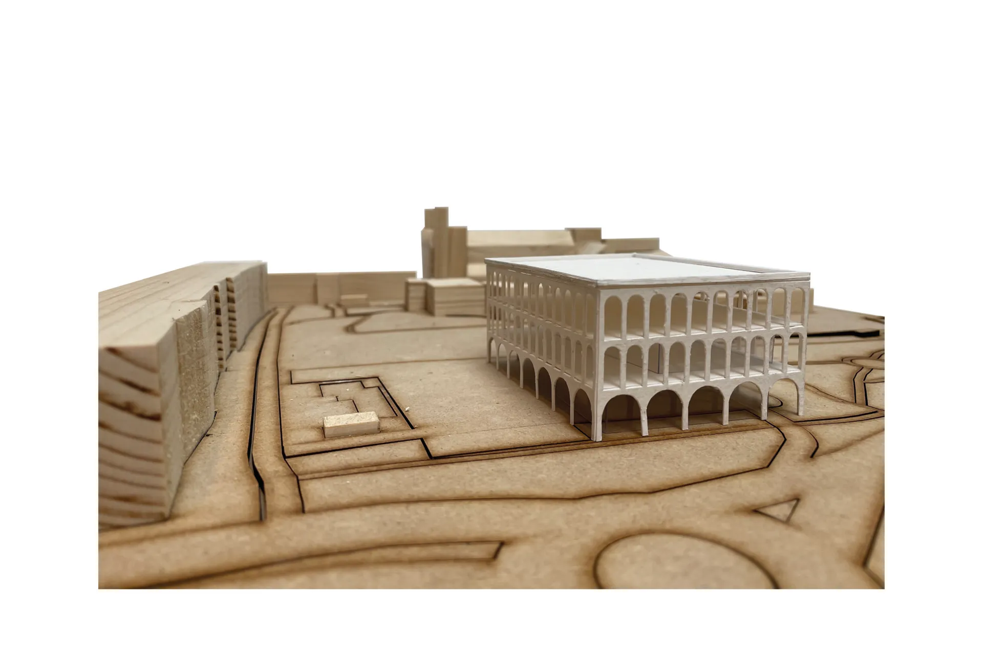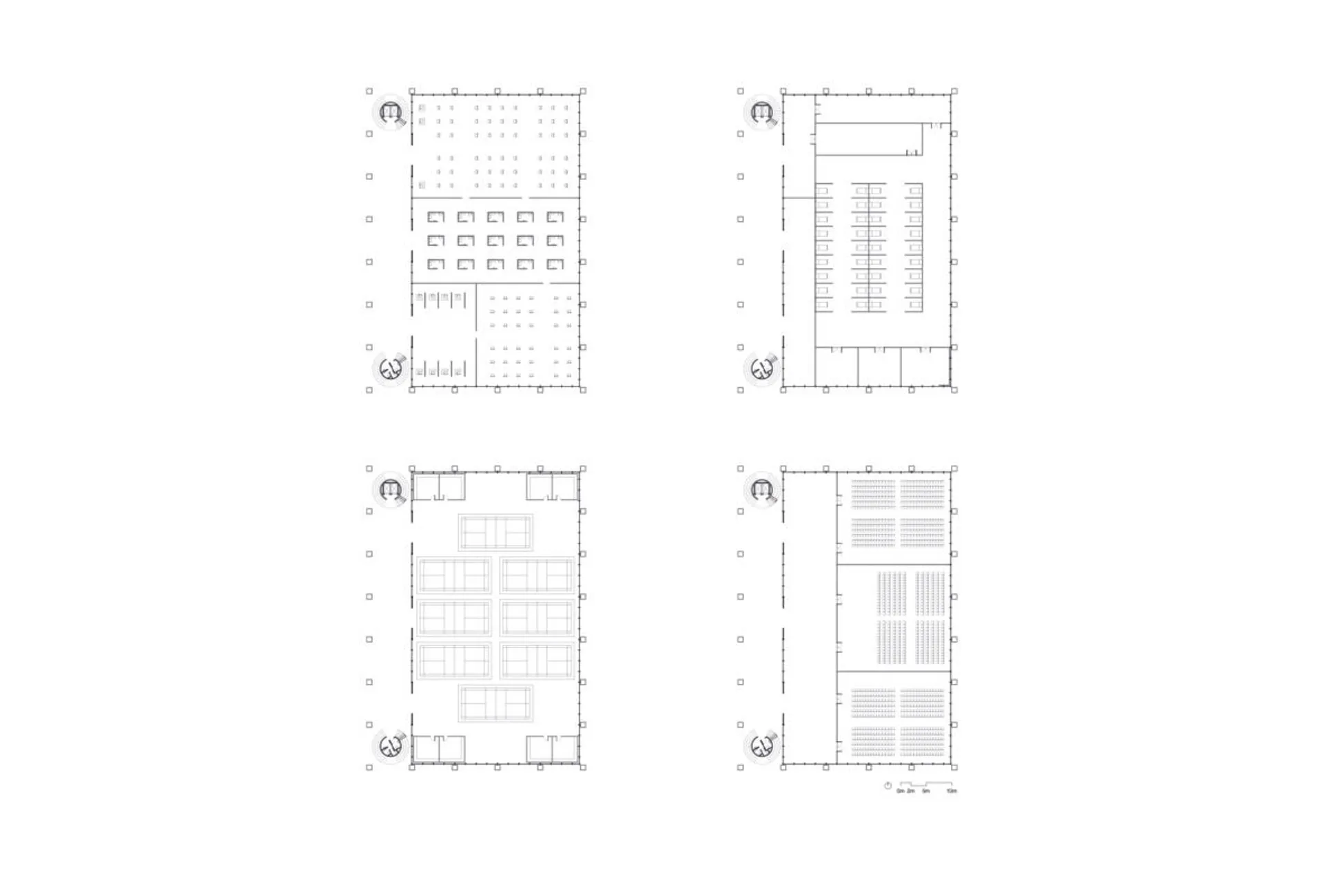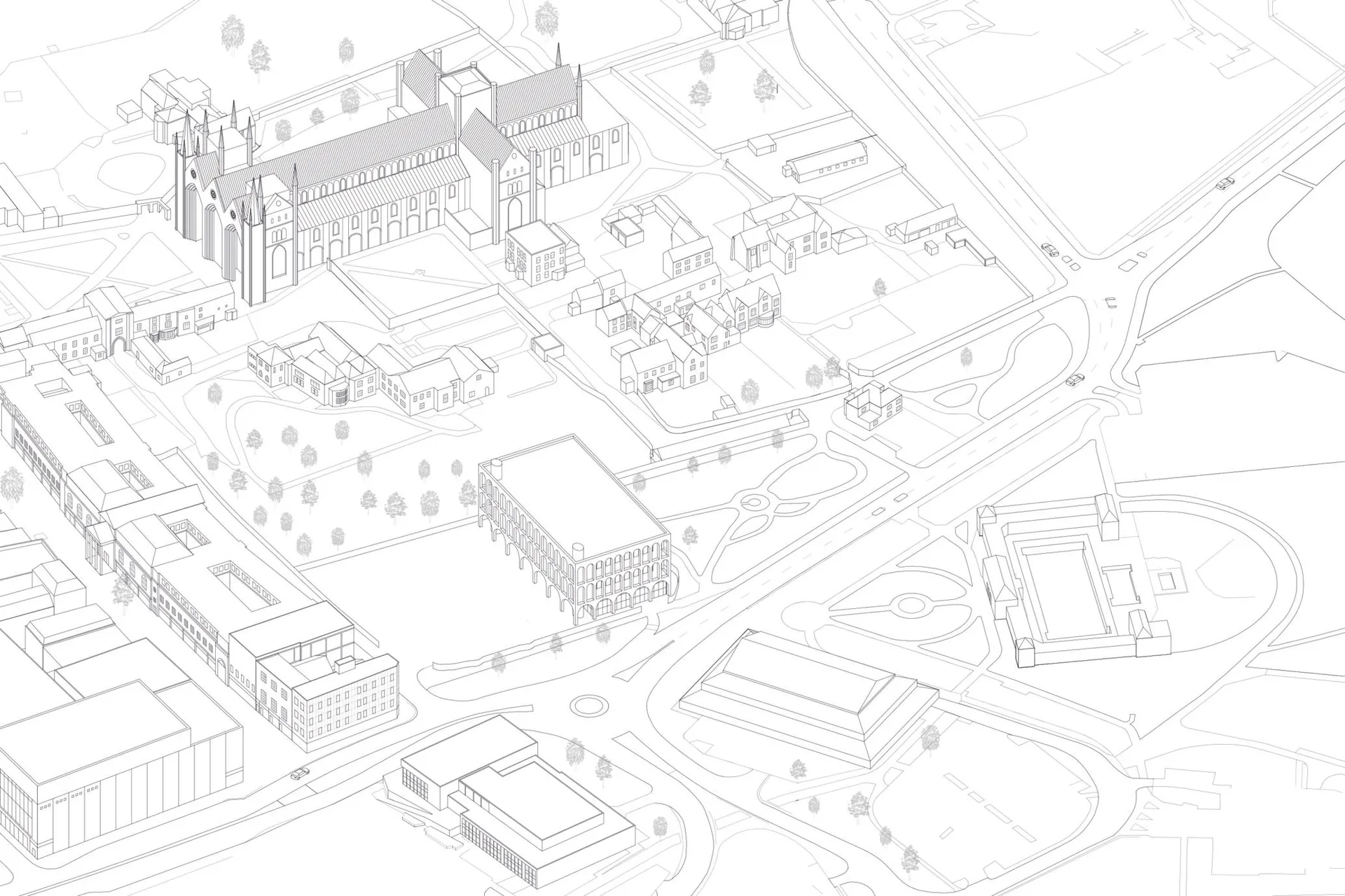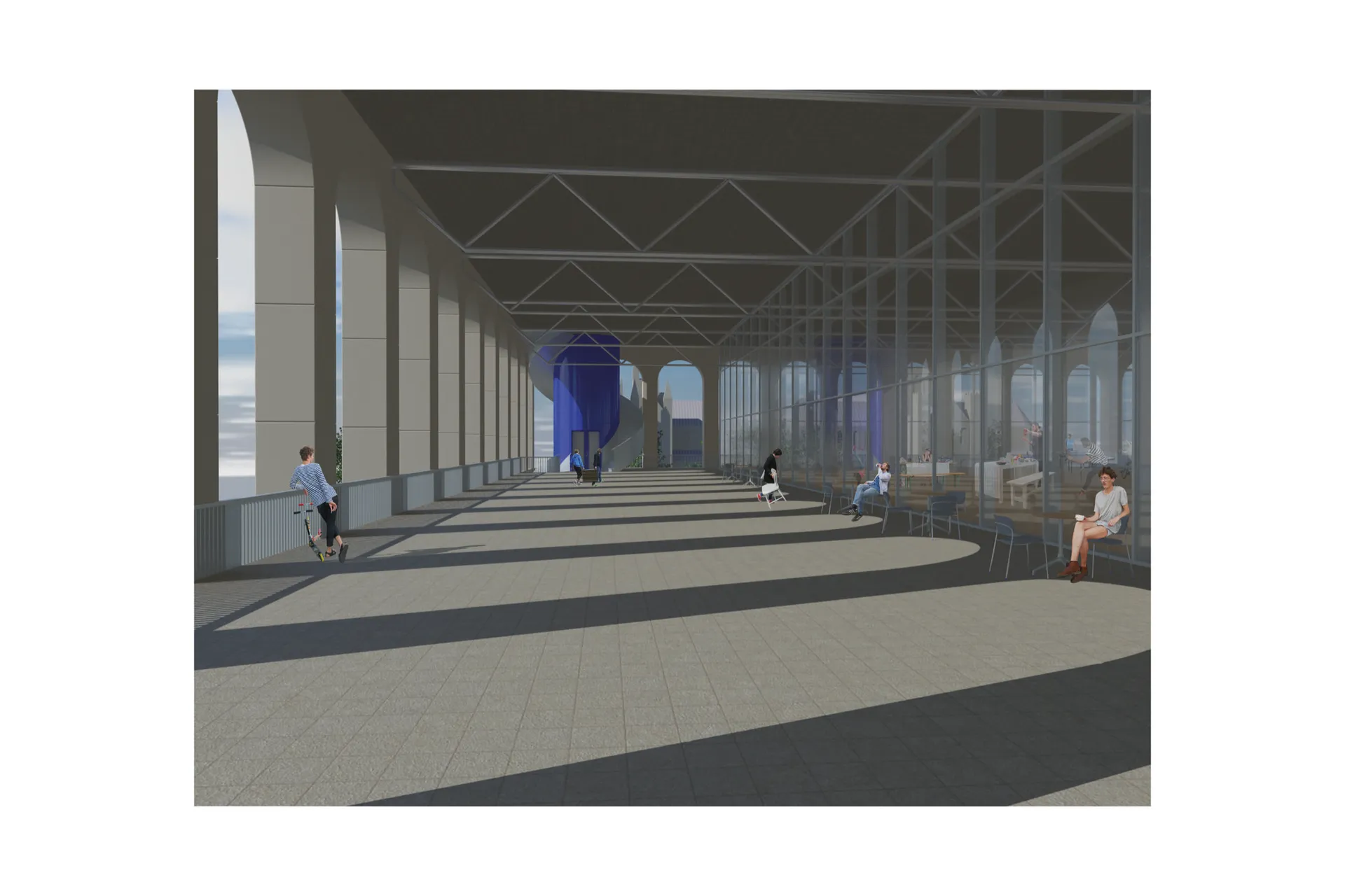Located in my hometown of Peterborough, roughly 100 miles north of London. Peterborough has a population 203,600 people and a diverse community. This project will create a flexible space for the people of Peterborough, a buildings that can be adapted to different functions, activities and sports. Many of the civic buildings of Peterborough feature arches, from the west façade of the cathedral to the shopping centre car park and this was a theme I wanted to explore within my design. The building is located within the central ward of the city, close to the town amenities and other civic buildings such as the cathedral, public swimming pool and court houses. The structure consists of a monolithic exoskeleton of solid limestone and single span steel trusses. The stone façade is made up of a series of components similar to the works of Gilles Perraudin, the concept of components allows for a more economical approach towards the construction. Large steel open-web trusses span 41 meters across the shortest axis of the structure (east to west). These large span trusses support large open floor plates uninterrupted by any columns, this was an idea influenced by the Centre Pompidou designed by Richard Rodgers and Renzo Piano. These column free spaces enable the building to accommodate many different uses from lectures to an emergency health centre to badminton courts. A curtain wall glazing system creates the thermal envelope of the building and then internally structural insulation panels create spaces with a warmer environment and an element of privacy. Circulation and service cores are located within an open loggia where spiral staircases made of steel wrap around large cylindrical cores which house the bathrooms (south) and lift shafts and services (north). In between the cores the generous loggia is a public space where people can meet. The roof top is completely exposed which could be used for a variety of sports and events.