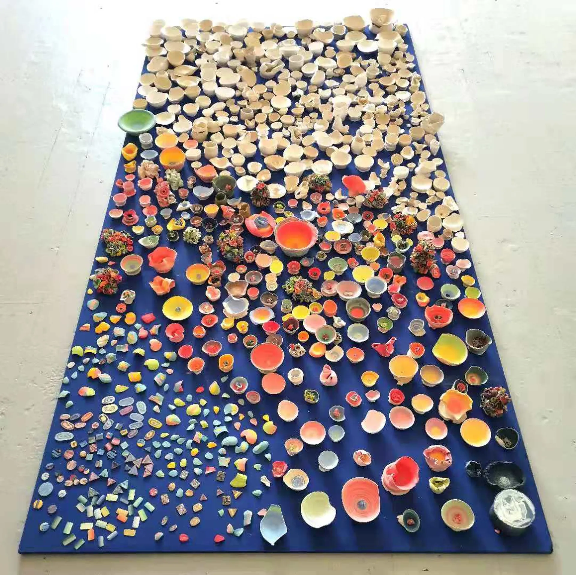 Performance art, installation, ceramics and painting are incorporated in a practice that is both durational and conceptual. In her performance entitled One Hundred Possibilities of One Hundred Things in One Hundred Days she posted one hundred updates per day over one hundred days on the social media platform WeChat. The updates recorded a completed task and included for example cooking, ceramics, digital painting and collaging pantone colour testers all as part of a process of recording life and art as a series of scripted tasks. Time and experience during the lockdown were measured out through these tasks and the recording and posting of them. The work is a means of exploring her concerns with labour, mass production and her bi-polar condition. This in turn led to her thinking about how art might be mass produced through this process of mimicking (on a small scale) the organised labour common in Chinese factories and workplaces. What results are objects such as 1,000 ceramic objects, 10,000 arrangements of pantone-testers, 100 different breakfasts and 100 different lunches. The performances are primarily concerned with process and how restrictions can give rise to calm and the potential for thought. The objects and social media posts exist as a material residue and trace of these performances in the gallery and online.
