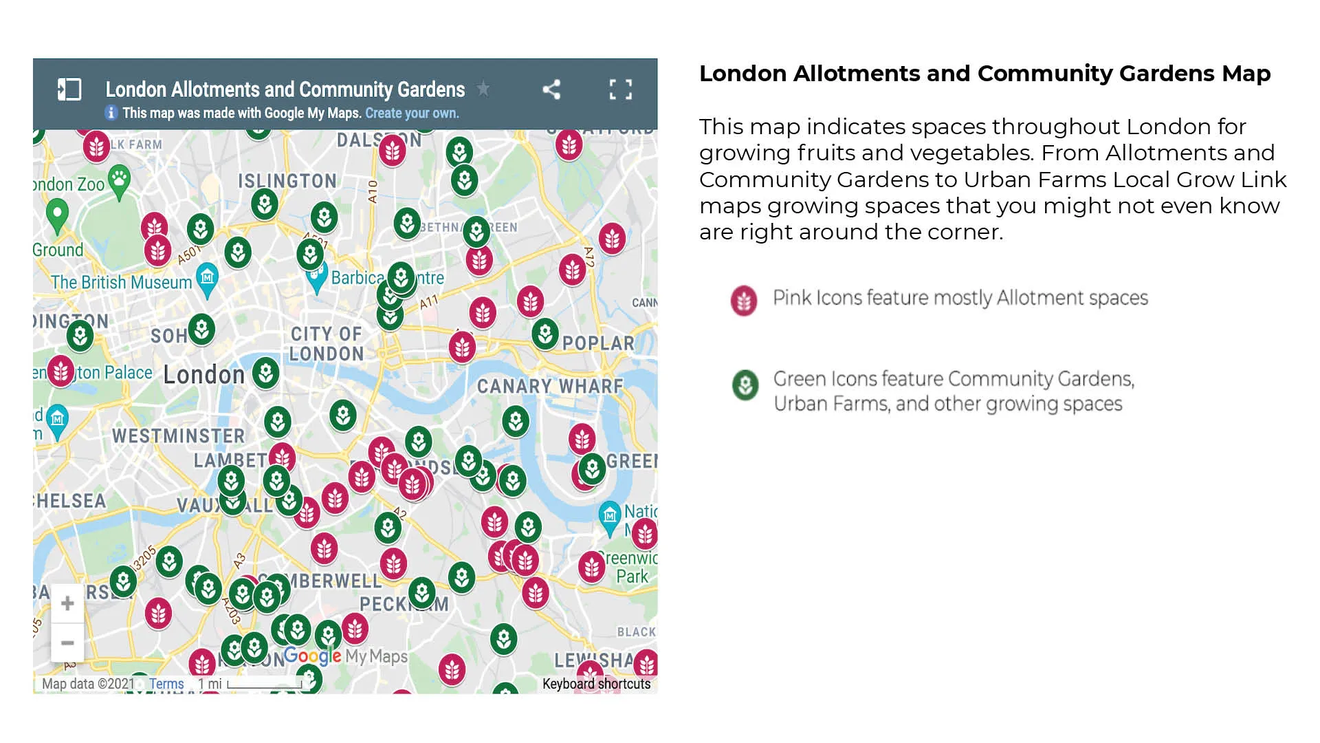 Local Grow Link is a live website that enables London residents to easily access local food and growing spaces by mapping and connecting various resources. The website features spotlight content furthering access for residents of four London food deserts and a quiz matching users to more personalised food growing guidance. By amplifying and centralising information Local Grow Link allows more people, particularly in areas that lack suitable food options, to engage with local food movements and further connect with their community while eating more sustainably.