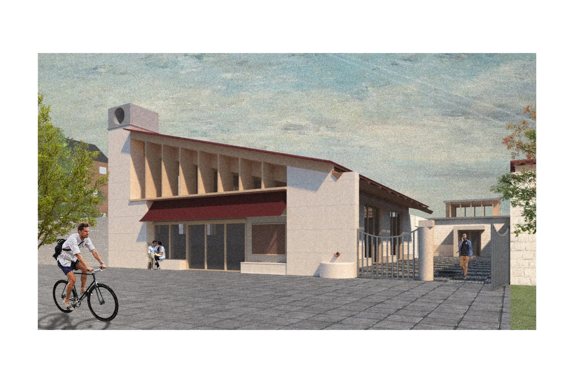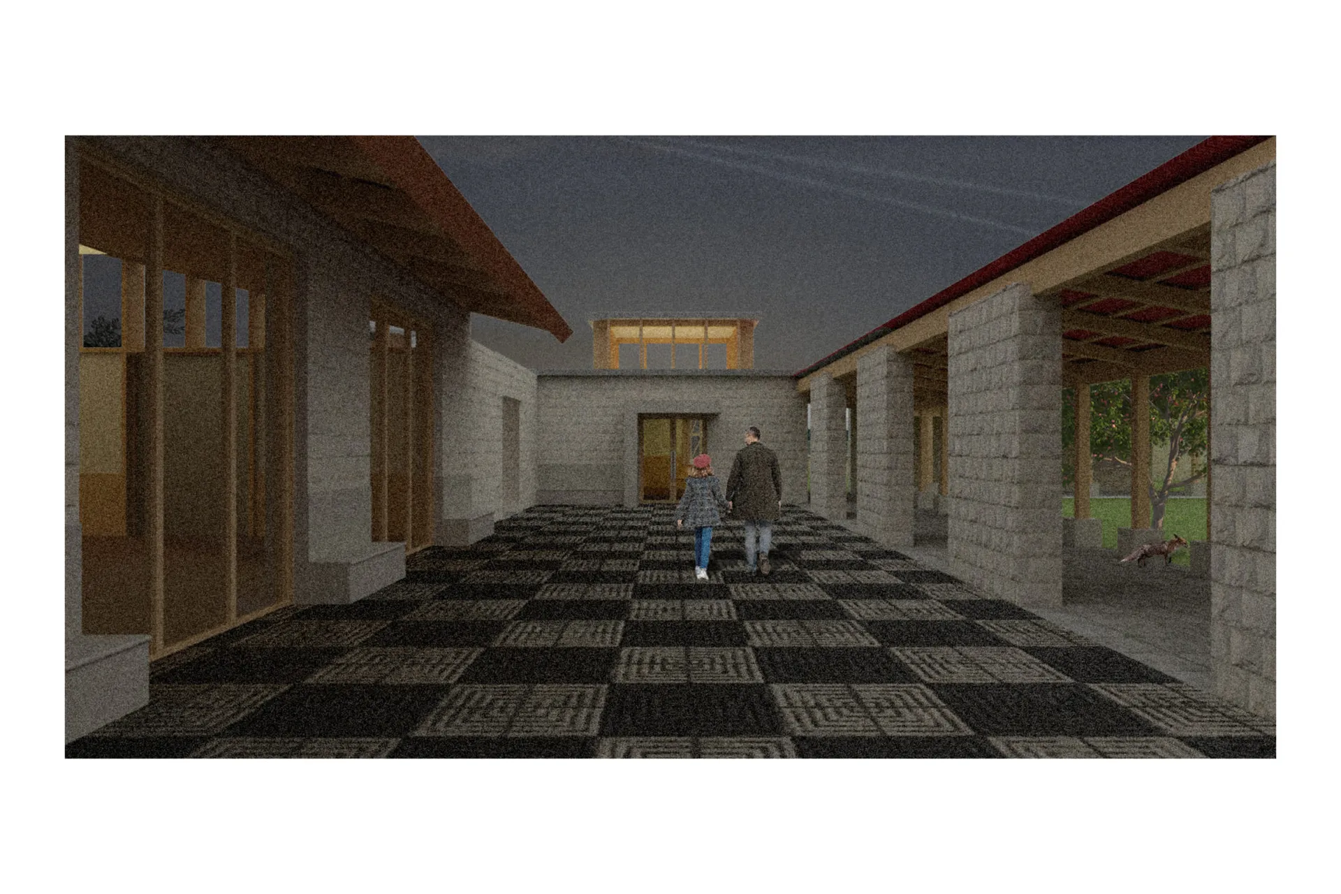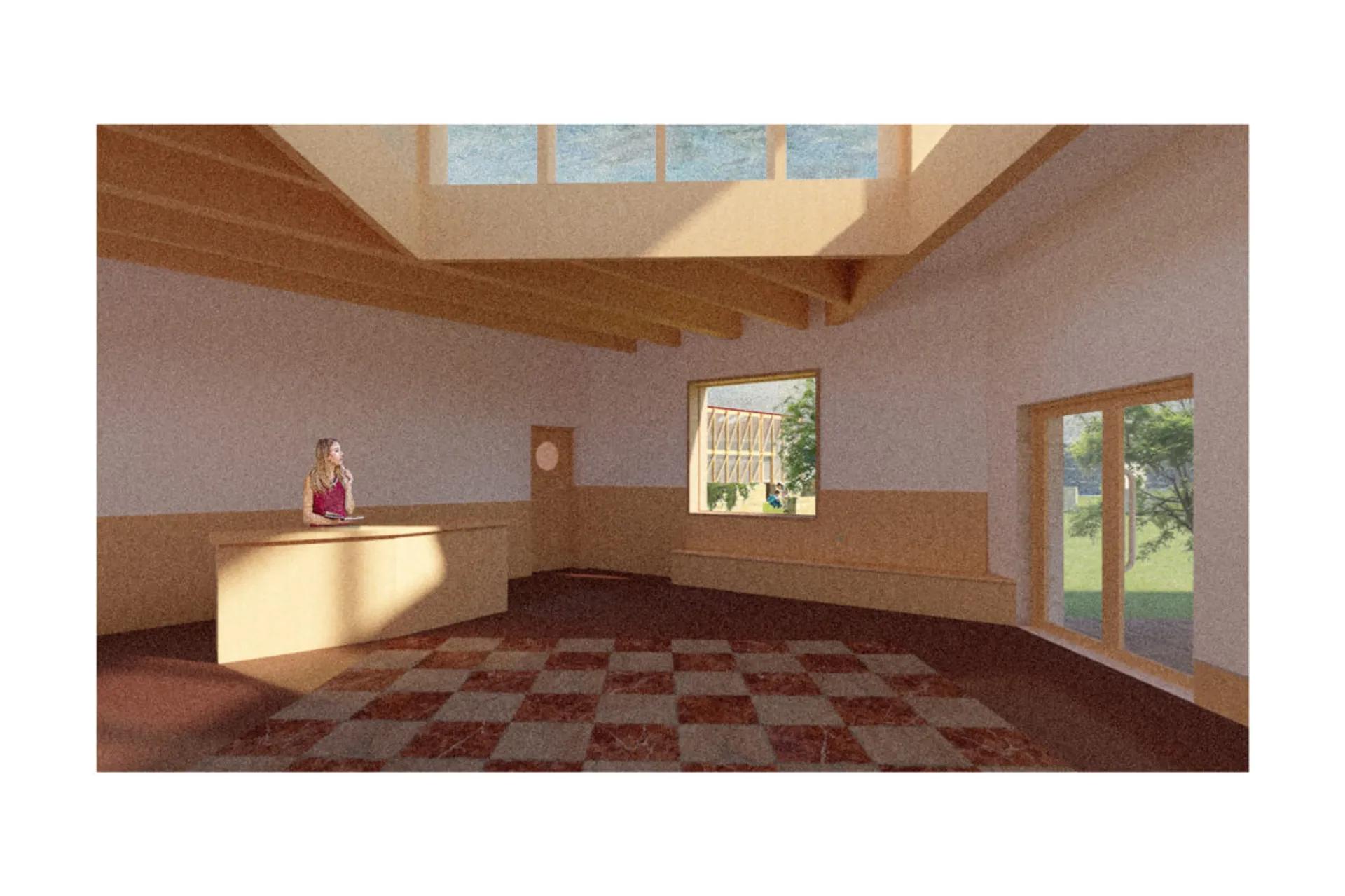 The journey from street into the school is a civic ensemble of spaces with the market hall on the left and a cloistered orchard on the right. While directly ahead is the the entrance to the foyer.