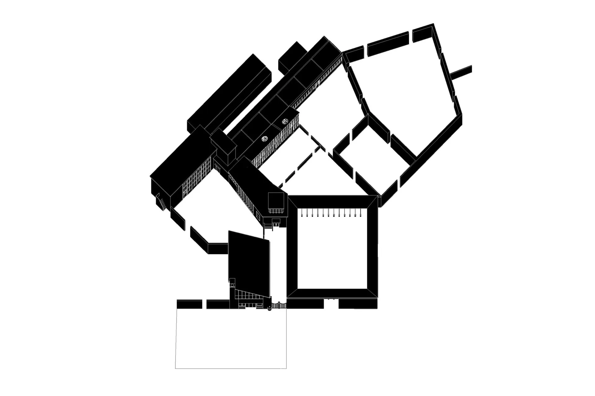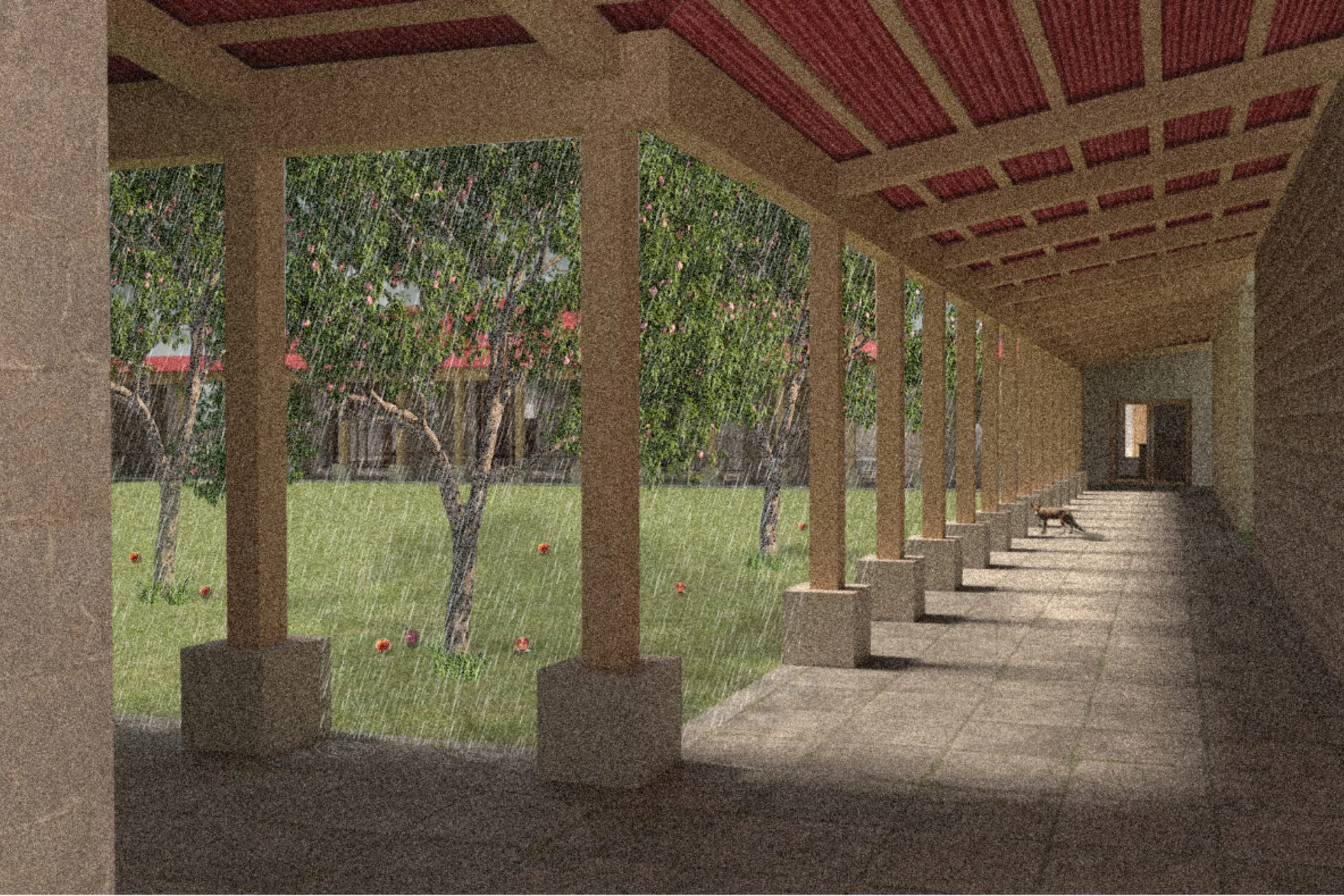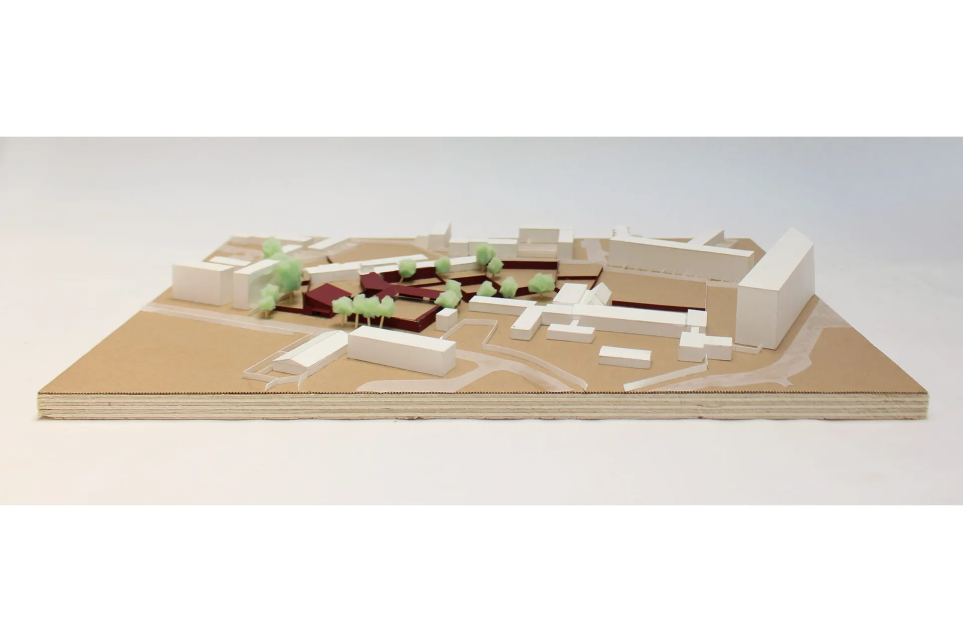 The journey from street into the school is a civic ensemble of spaces with the market hall on the left and a cloistered orchard on the right. While directly ahead is the the entrance to the foyer.