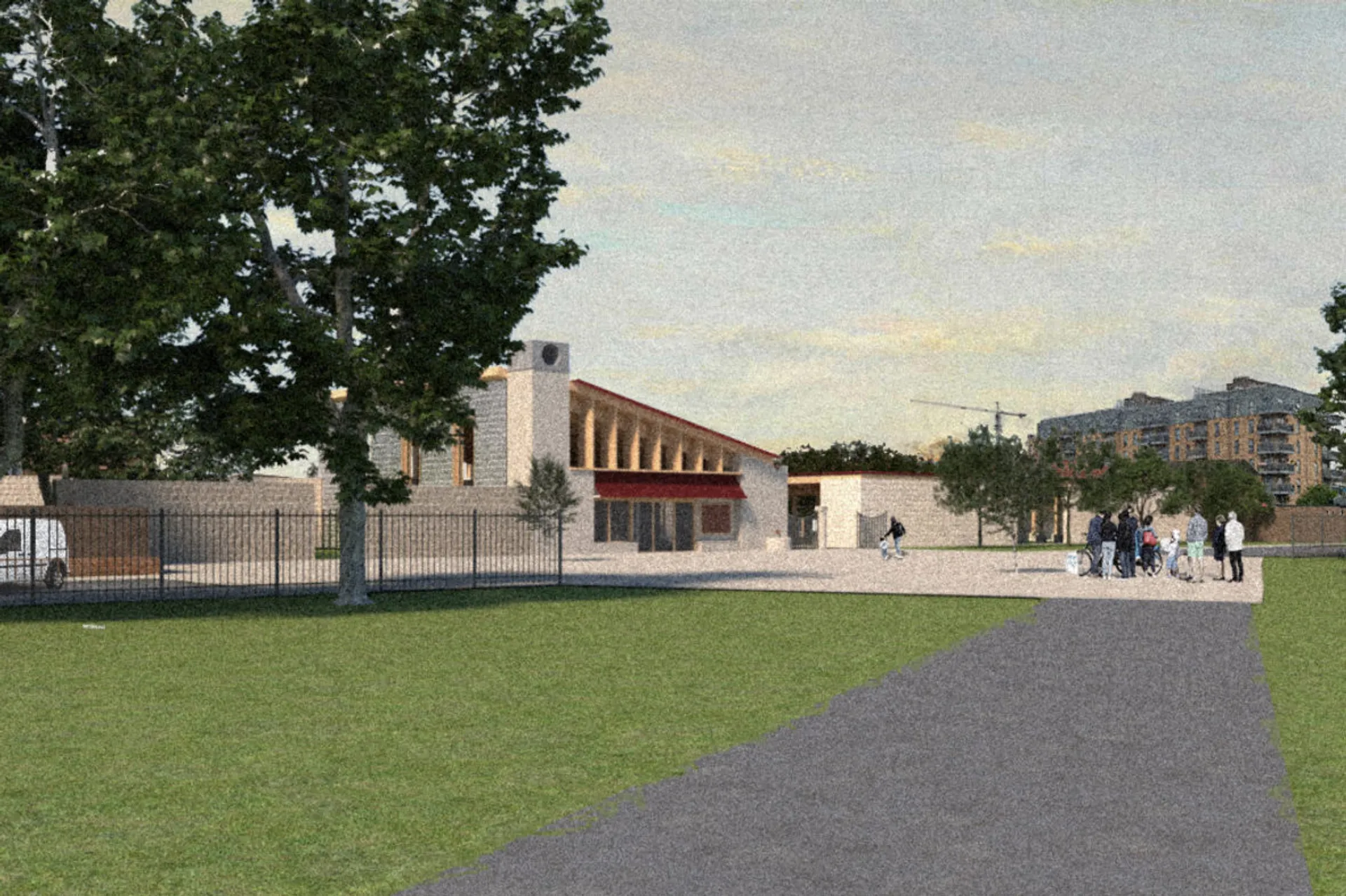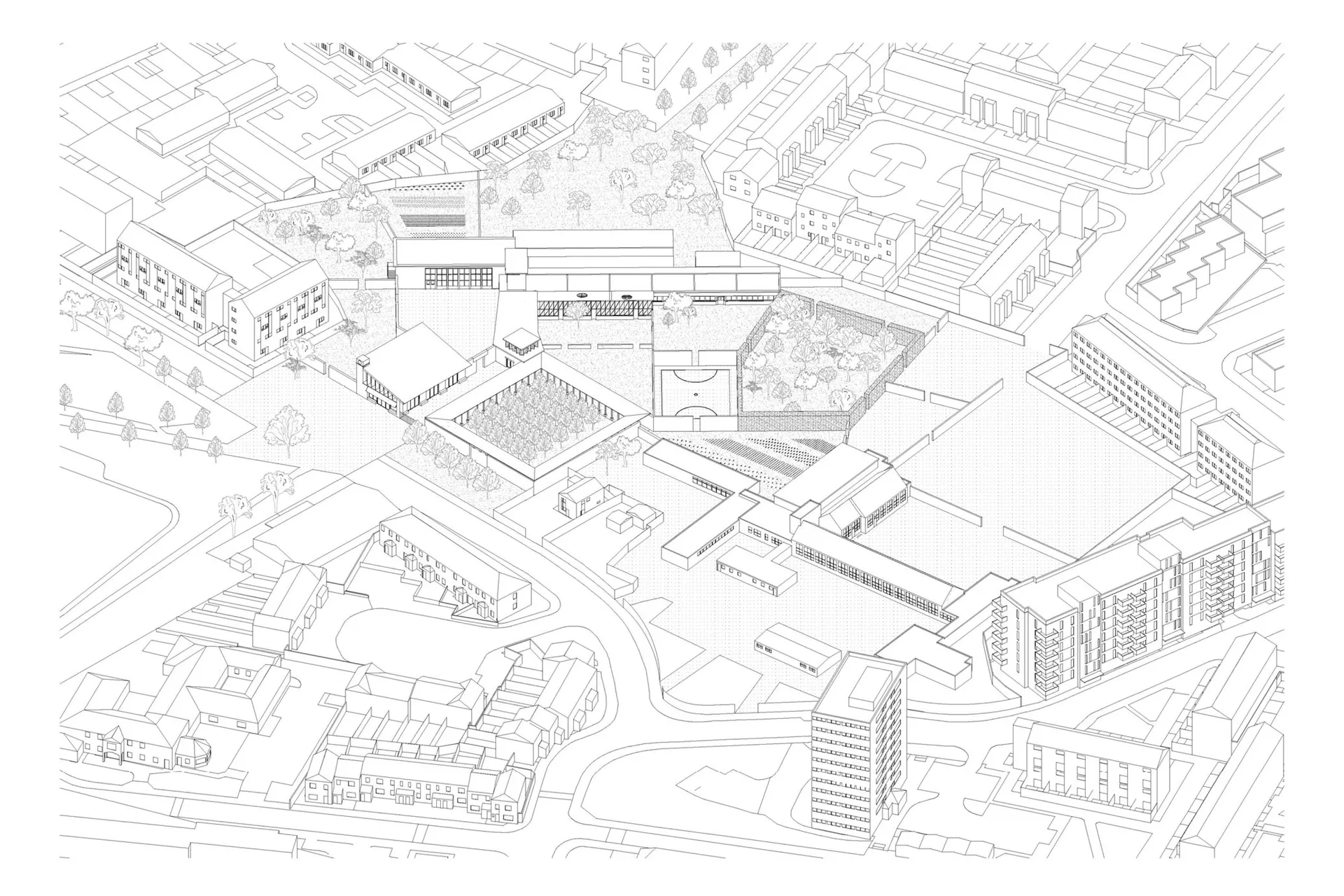 These gardens are used for meeting growing, playing and learning re-wilding and increasing biodiversity. This proposal is an extension and addition to an existing school in Newham, East London. As well as gardens, a new foyer for the school is proposed as well as a market hall that is a versatile community space that reconnects the school to the surrounding area.