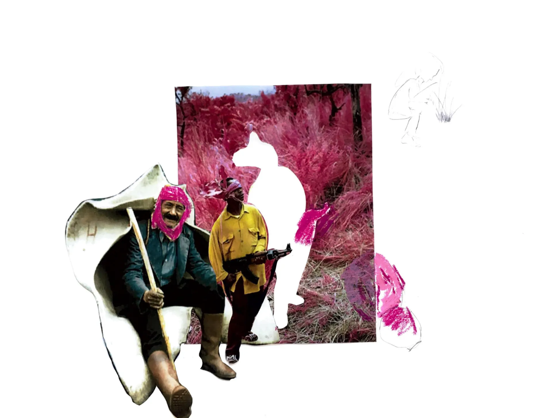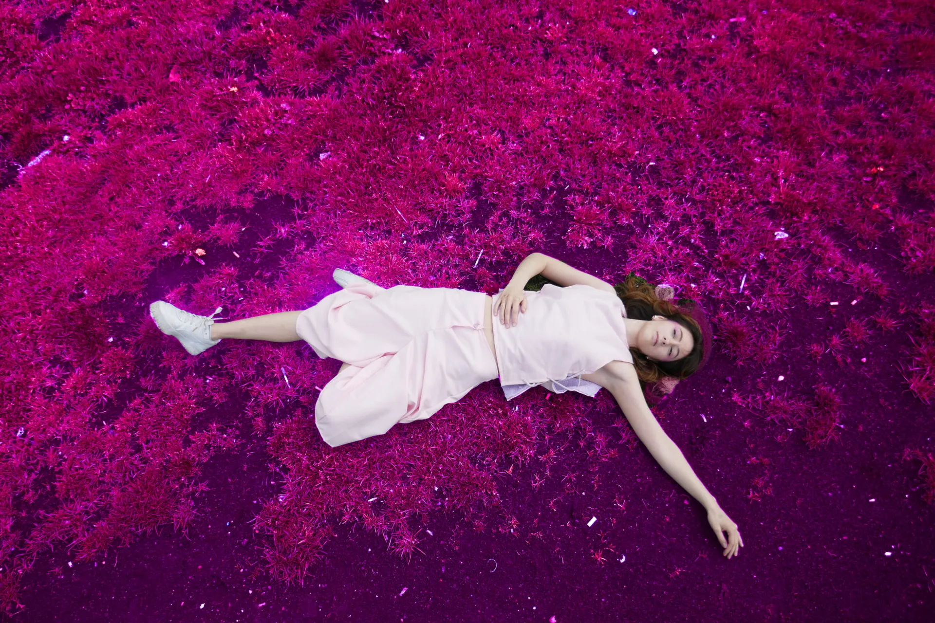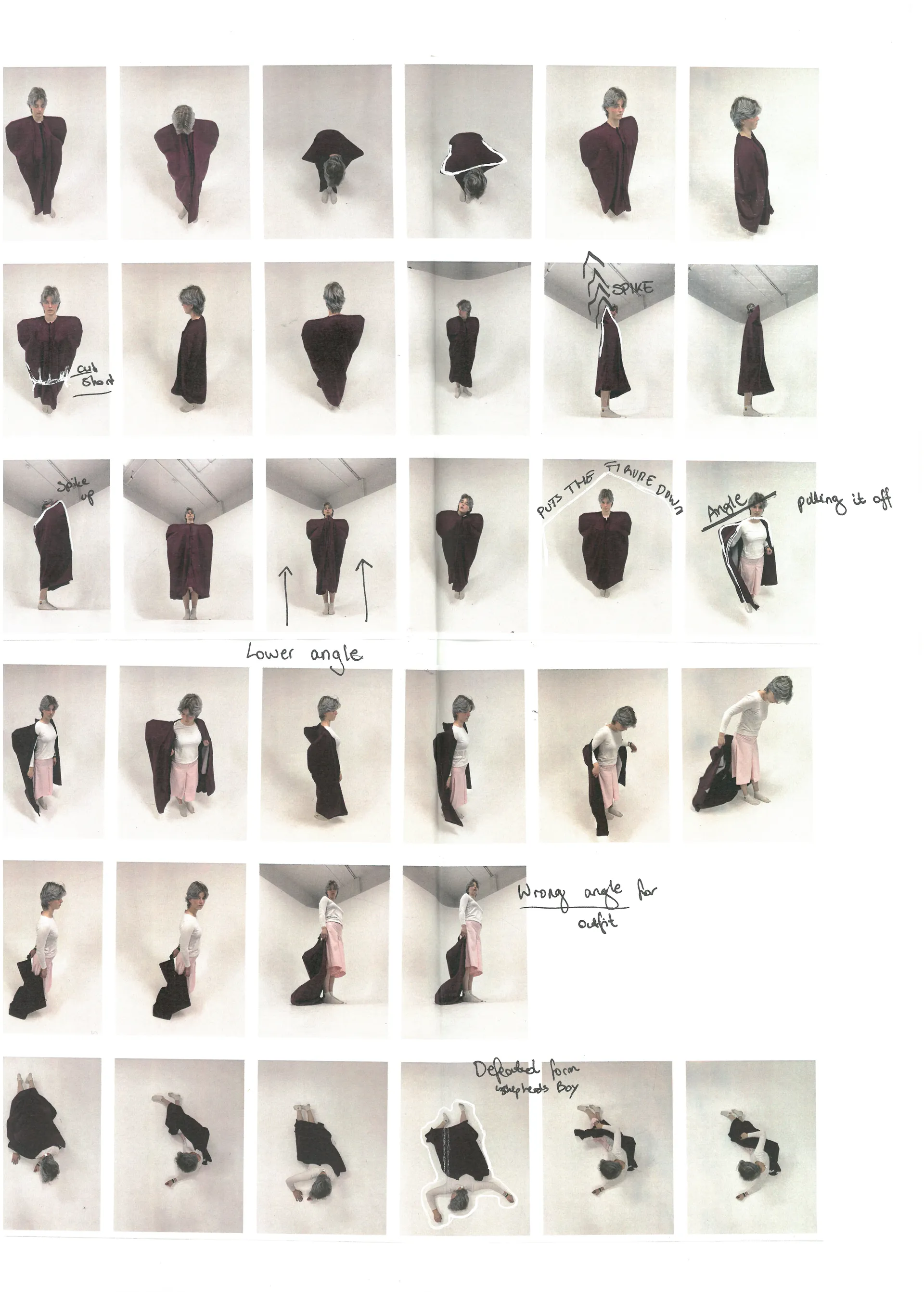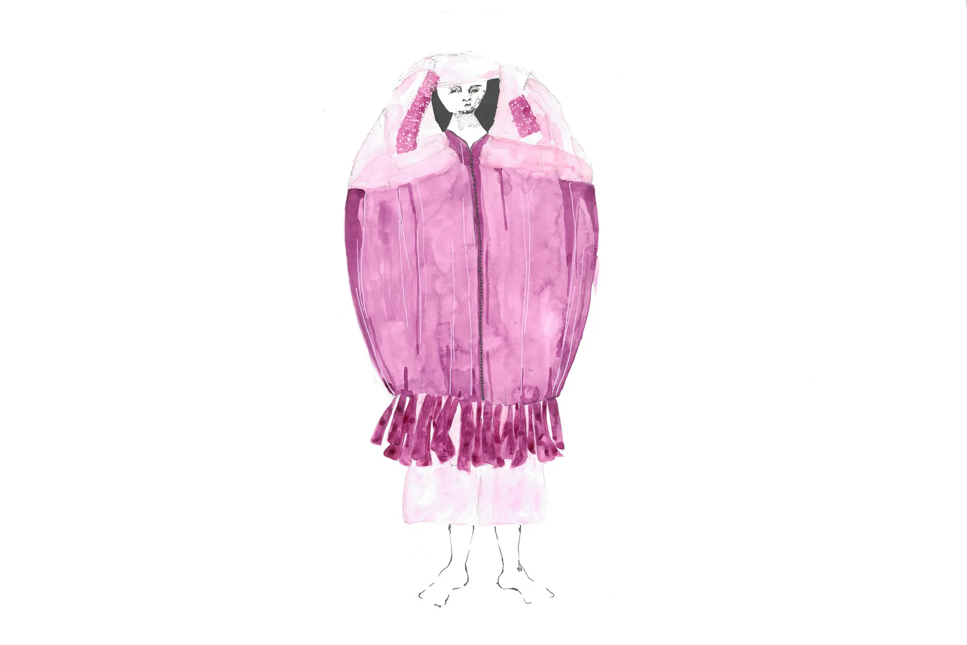 A twist on the Fable ‘the Wolf in Sheep skin’. I explore the attempt to disguise yourself in order to infiltrate an environment as seen by Shepherds, the fable and military attire. The garment’s two presentations of the cloak and shepherds boy represent the dangerous infiltrator and the innocent protagonist. Inspired by military’s use of infra-red to uncover disguised enemies, my outfit and landscape present as various shades of pink.