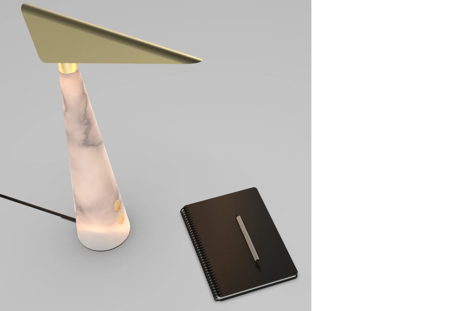 A dual functional desk lamp that consists out of a combination of prestige materials such as Alabaster stone and solid Brass. The lamp functions as a classic desk lamp but also has a ambient light inside of the Alabaster stone that lets the light shine out through its translucent quality.