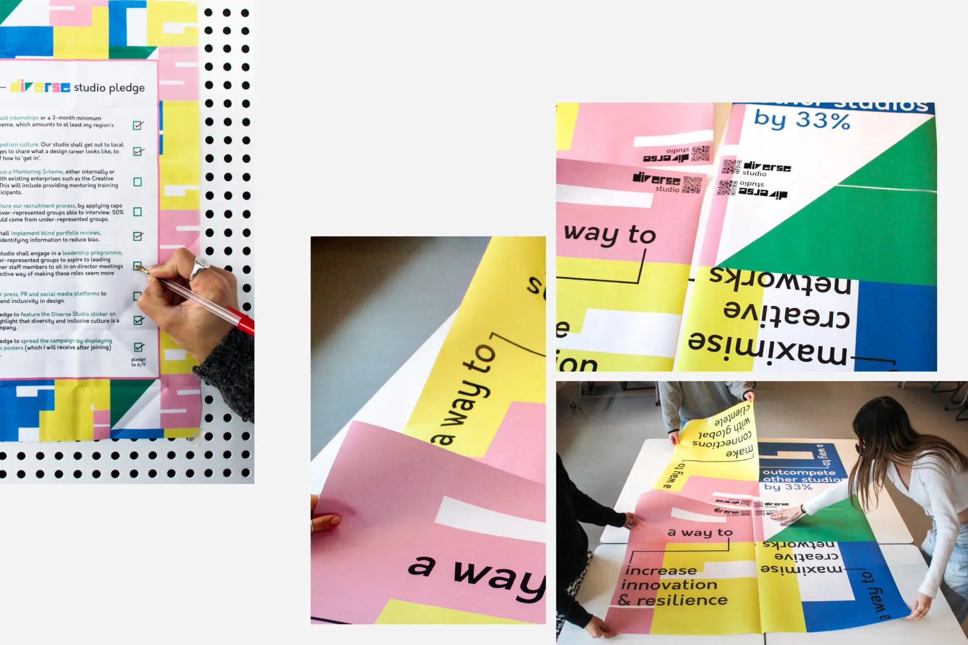 Diverse Studio is an initiative which advocates for gender and cultural diversity within the Graphic Design Industry. Defined by nine pledges which promises to diversify any London-based studio, its accompanying media and poster campaign aims to attract studios who could be doing more to adopt an inclusive ethos.