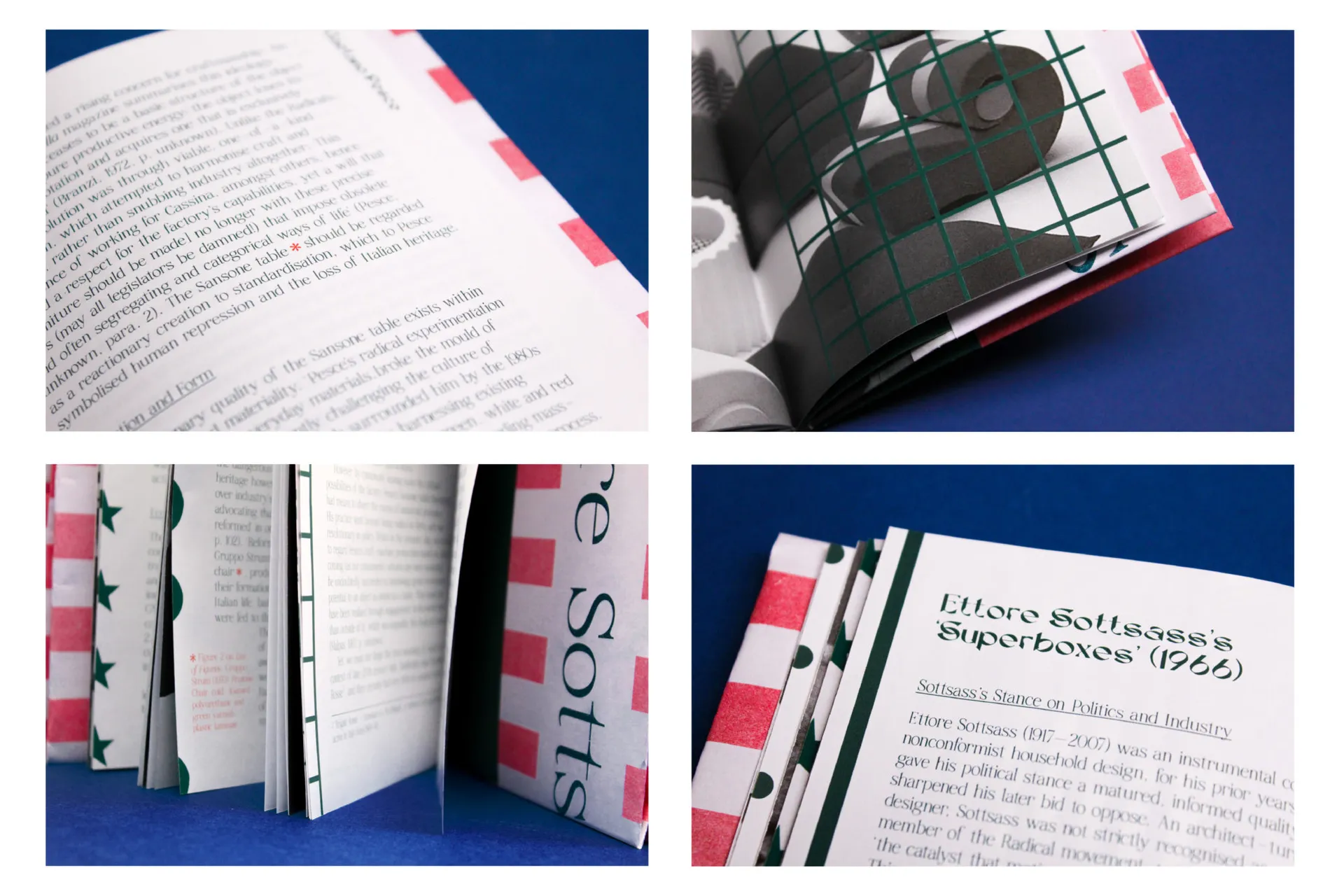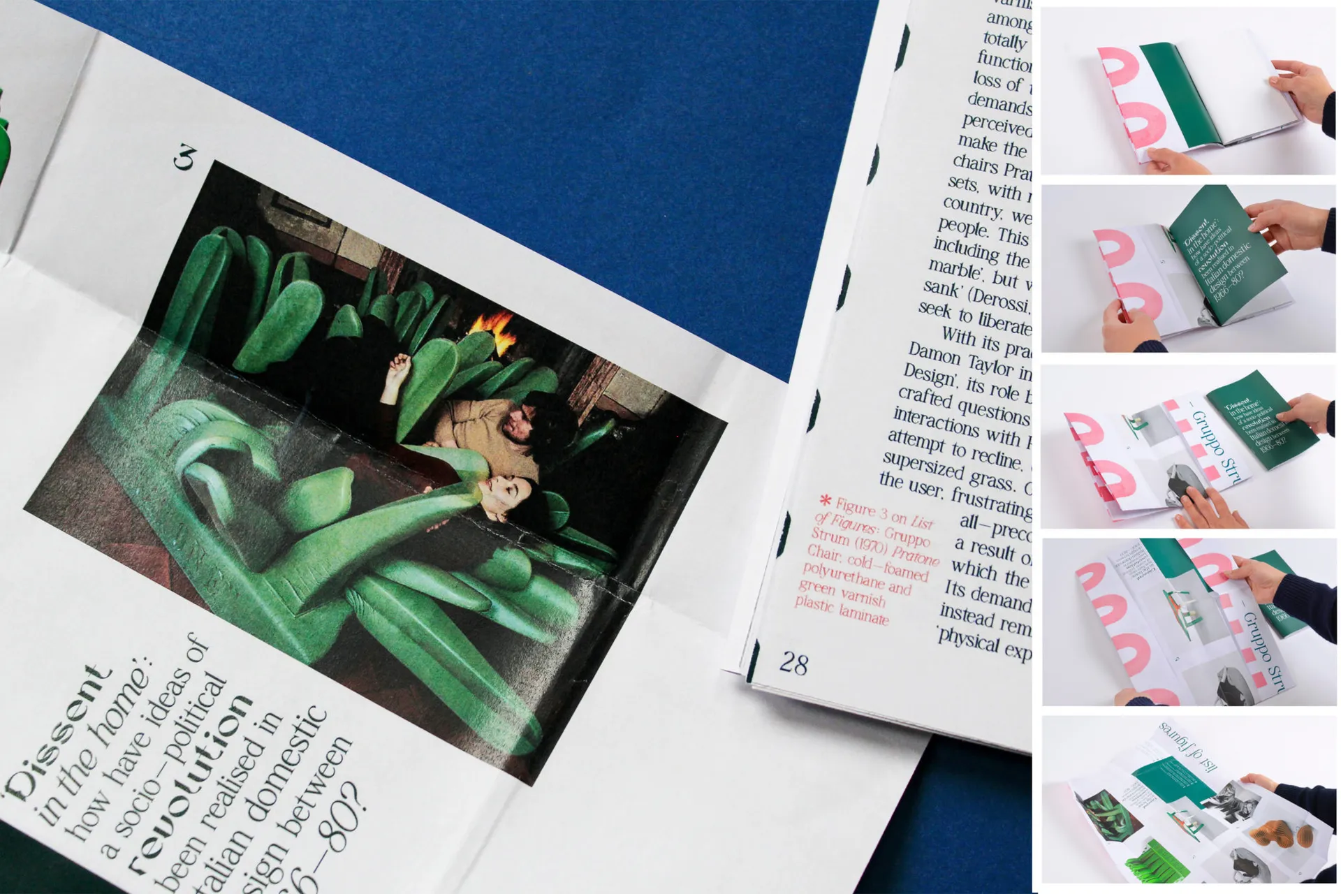 The dissertation ‘Dissent in the home’; how have ideas of a socio-political revolution been realised in Italian domestic design between 1966-80?’ is an examination and celebration of the Radical design movement. Inspired by the dissemination of Communist print in the period, the designed publication is cheaply produced, easily transportable and politically active. It hopes to epitomise the provocative intent of the Italian designers Ettore Sottsass, Gaetano Pesce and Gruppo Strum through its three editions.