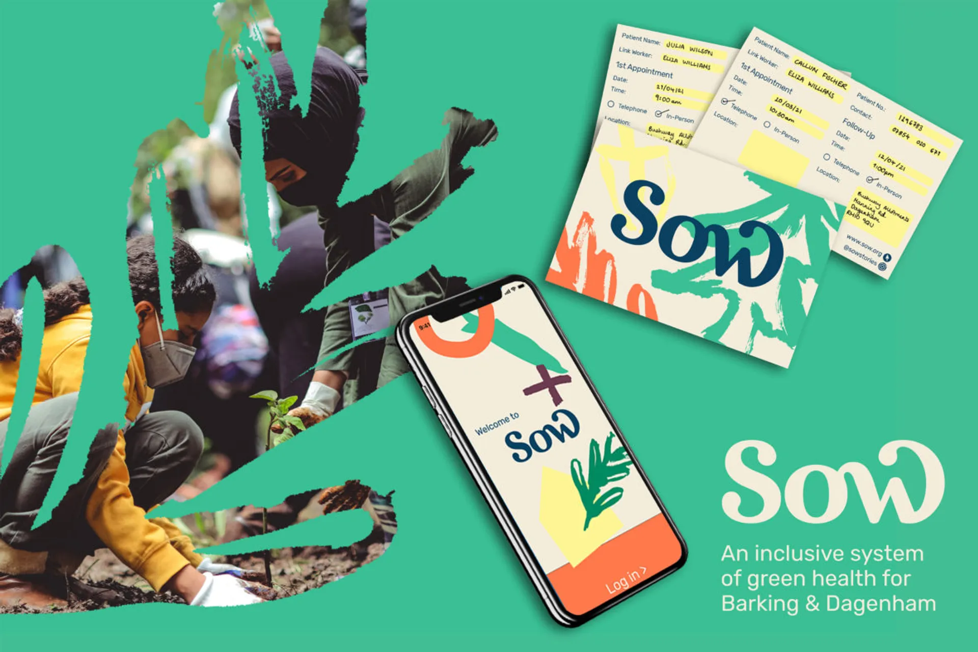 Sow is a health service for Barking & Dagenham, a borough with the highest childhood obesity rate and a lower life expectancy than the London average. Harnessing the huge health benefits of the great outdoors, Sow includes an app or alternative non-tech user journey, through which users can access outdoor community activities. It provides preventative and curative interventions for the long-term health of the entire community. (Please find out more on the Sow page).