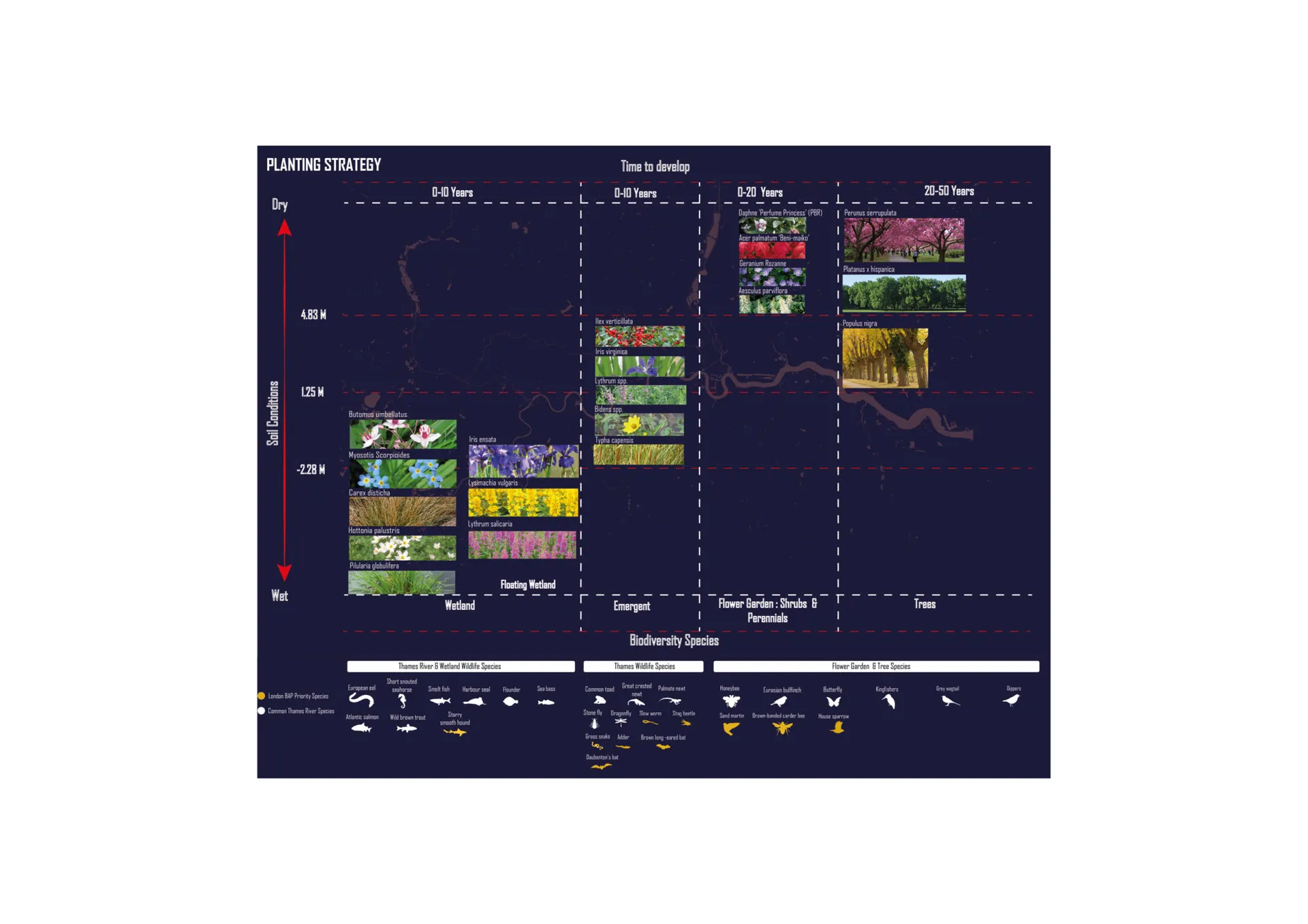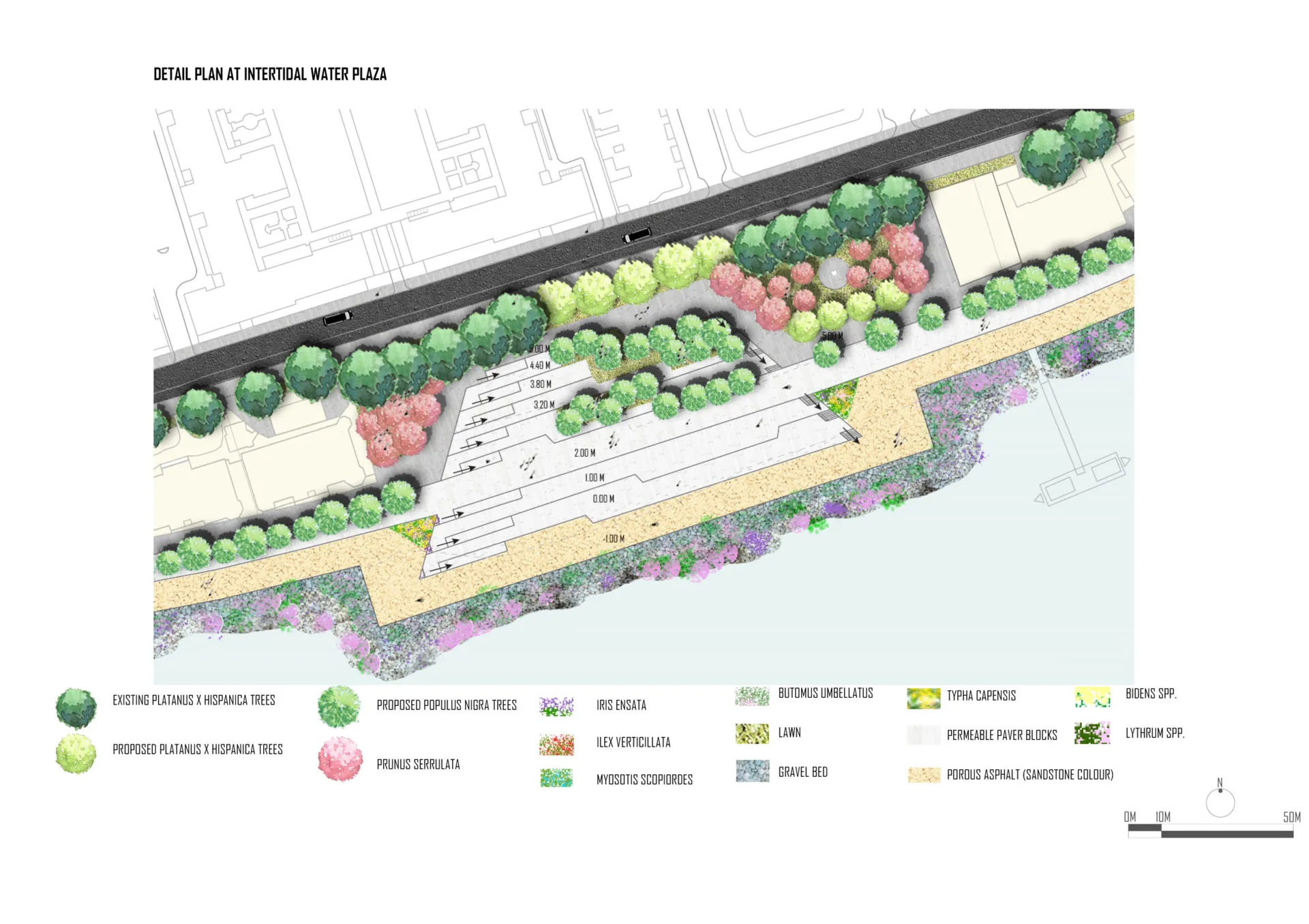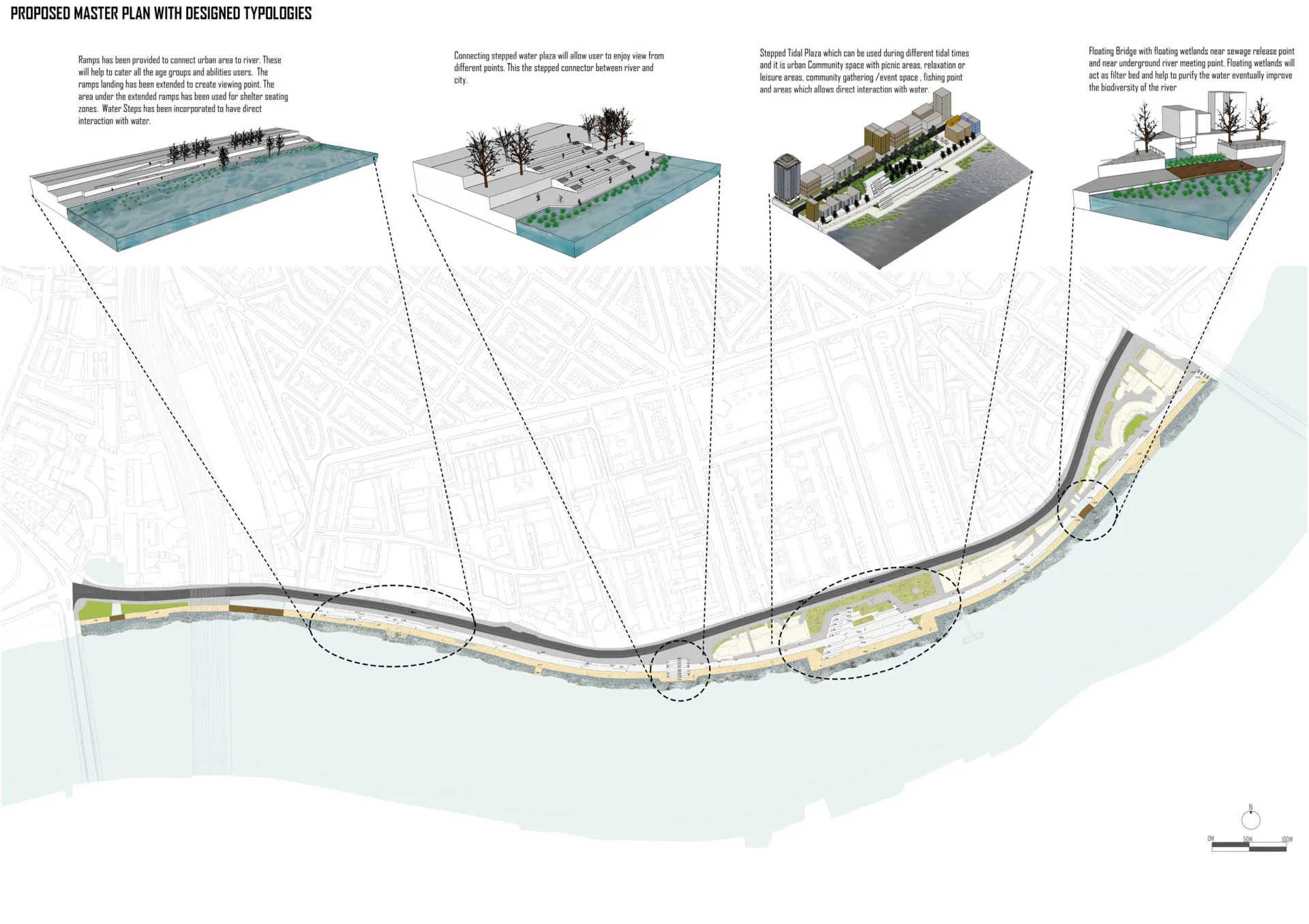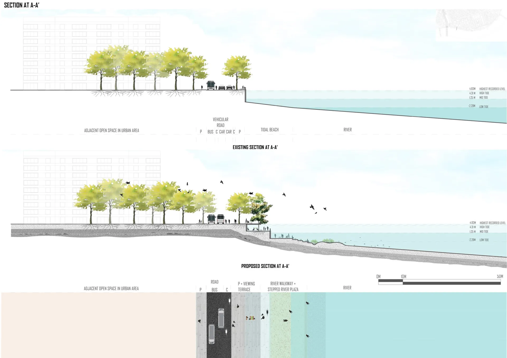 Ecological conditions will be enhanced by connecting existing open spaces near the river bank by allowing water to come inside the open spaces and by using the tidal zones for creating interactive spaces. The incorporation of floating wetlands near the mouth of underground rivers, canals and sewage release points will help to filter the water and to eventually improve the water quality and biodiversity.