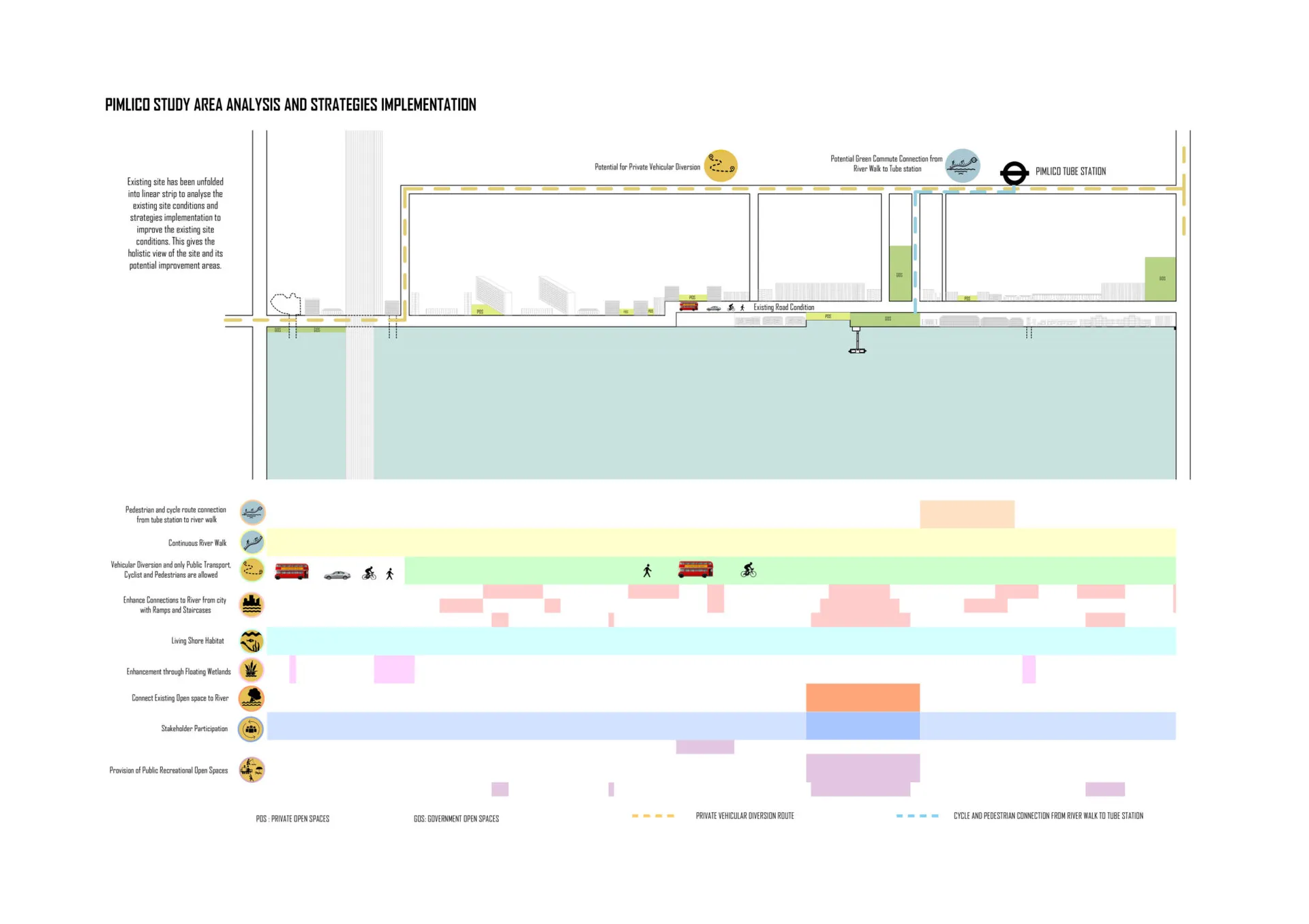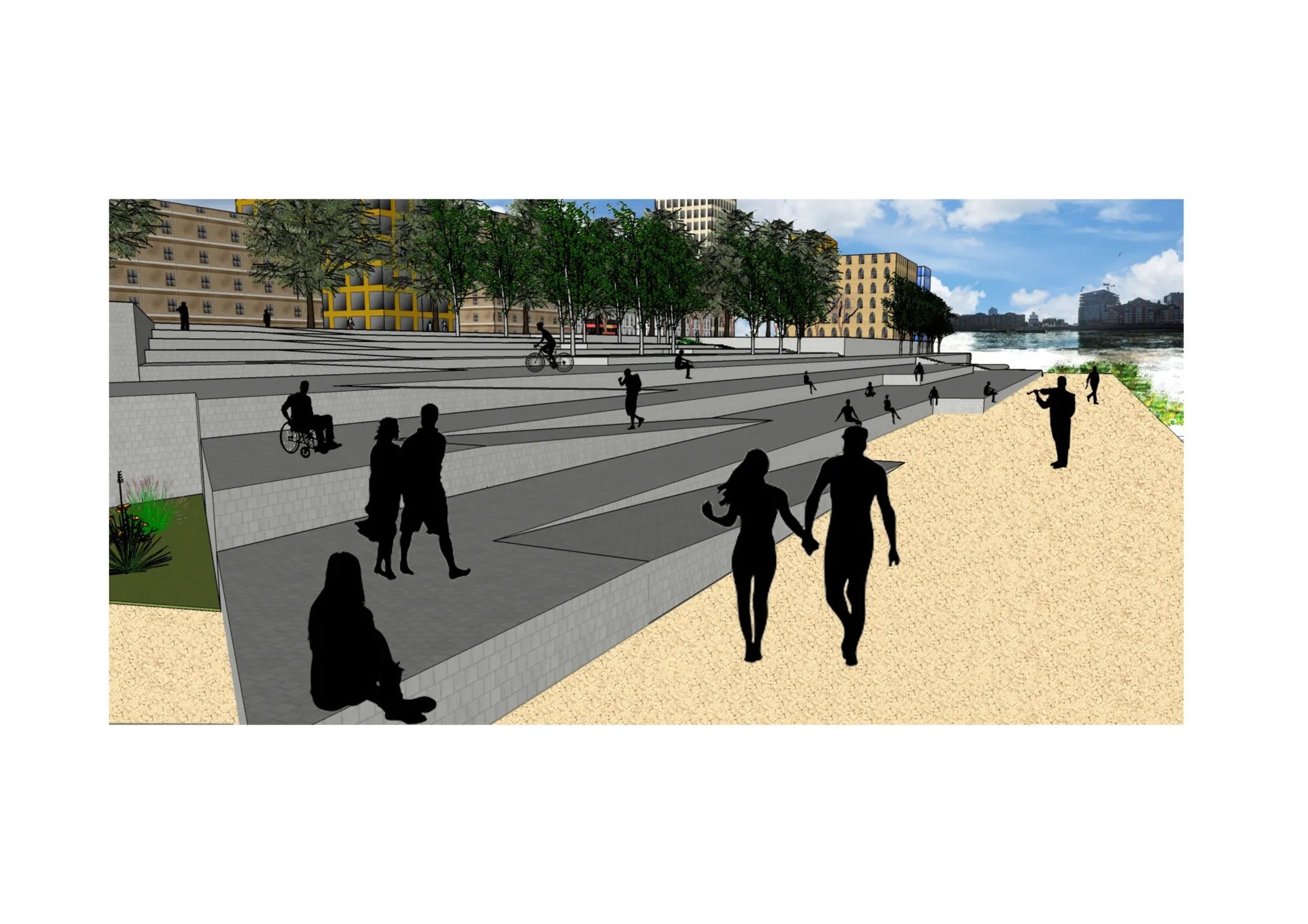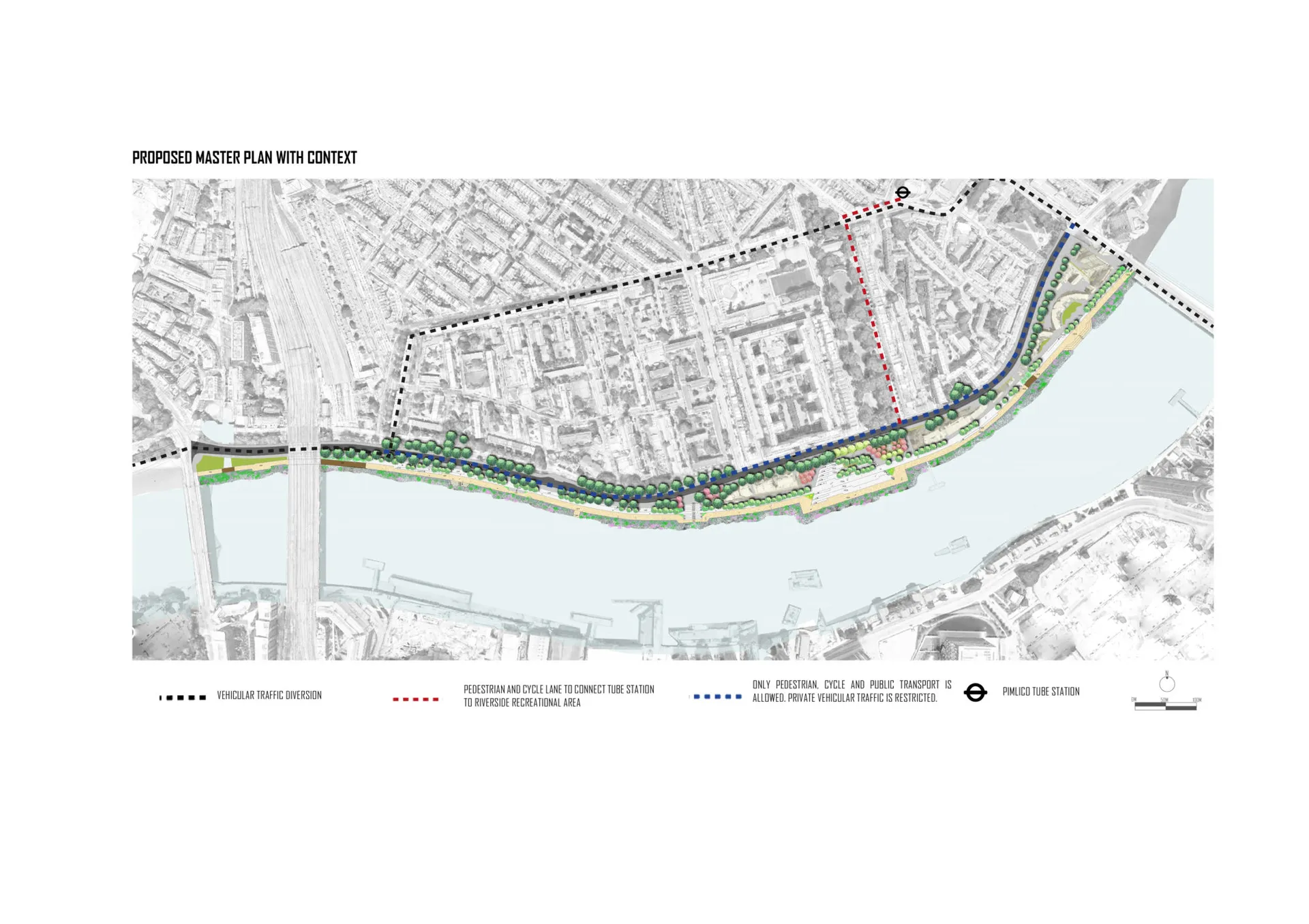Reconnecting the Links: how to reconnect people with the river and with nature is a landscape project that aims to transform the Thames Riverside in London from Chelsea Bridge to Vauxhall Bridge. The project aims to address the issues of pedestrian and cycle accessibility to the riverside walk from tube stations, improving the interaction with the river while enhancing biodiversity with introduction of the Living Shorelines concept.