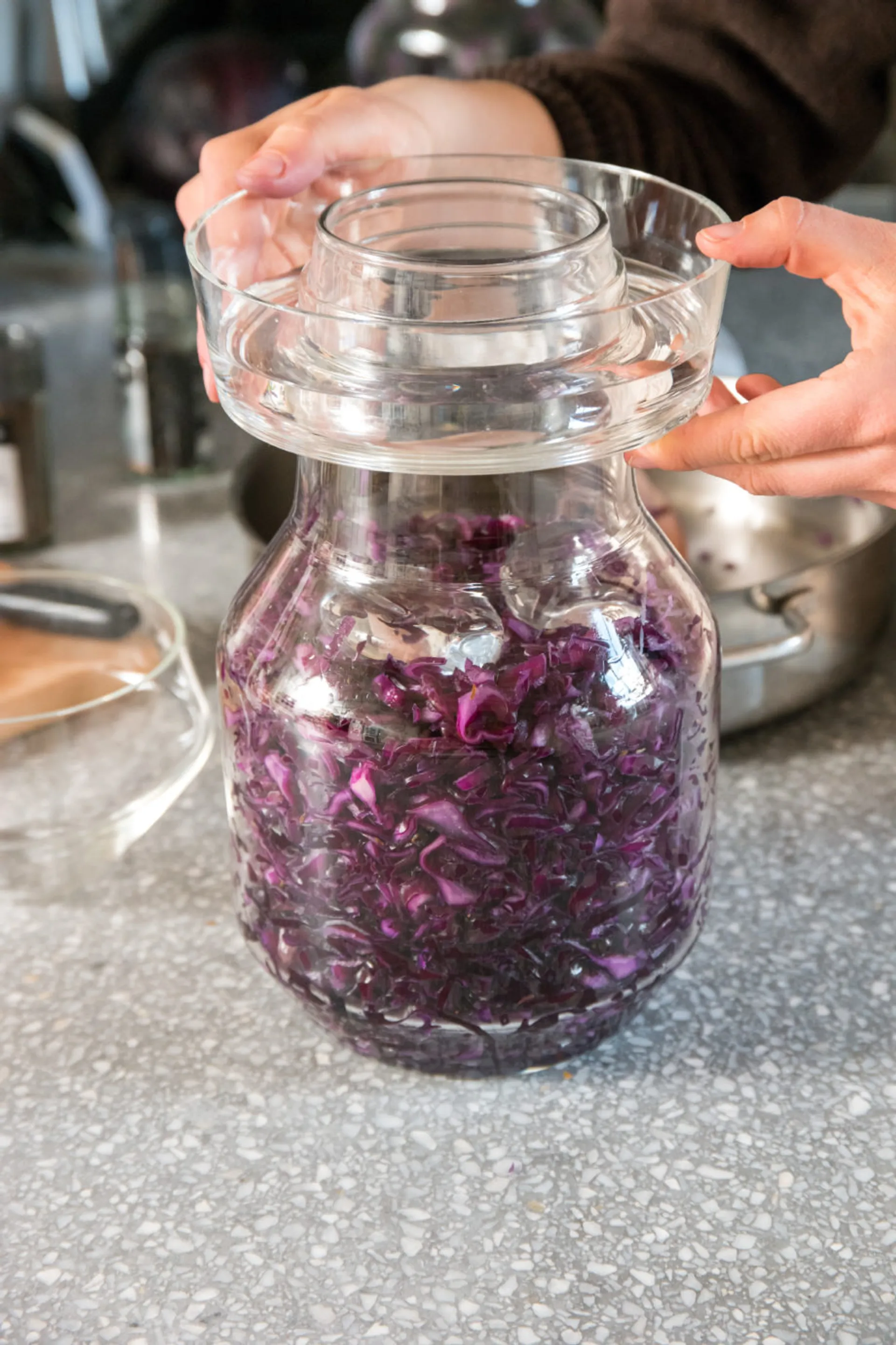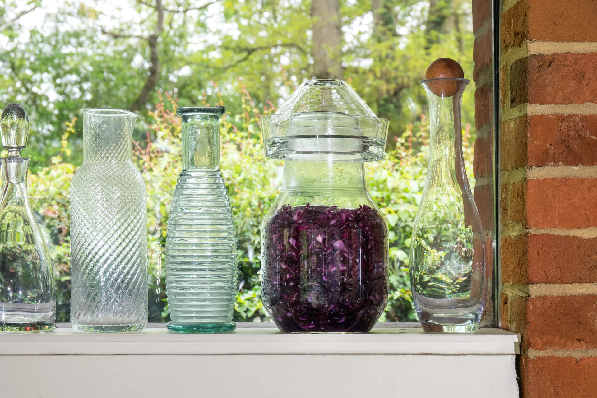 Each fermentation jar consists of three pieces; the main body, the collar and the hat as well as two glass weights. The main body holds the ferment, the collar slide onto the neck of the body and holds the moat of water, the hat sits in the moat of water and allows gas to escape but also seals the jar. Each part is functional but also builds the ornamental silhouette.