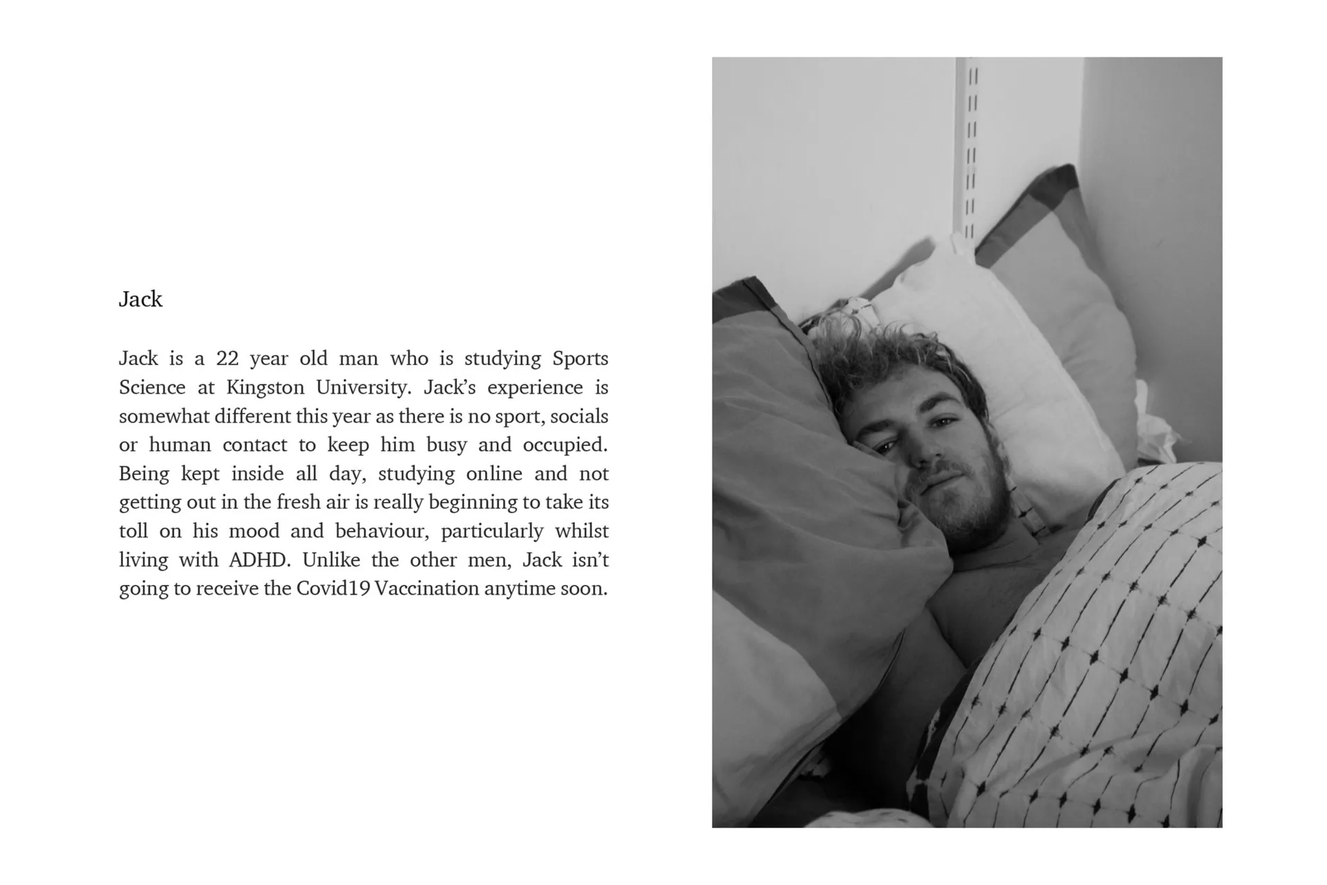 There is a stigma surrounding men’s mental health, which is something I believe shouldn’t be ignored in today’s society. To raise awareness, I have recorded the honest everyday of these individuals during the global pandemic, capturing my subjects through a banal representation, conforming to the effects of lockdown.