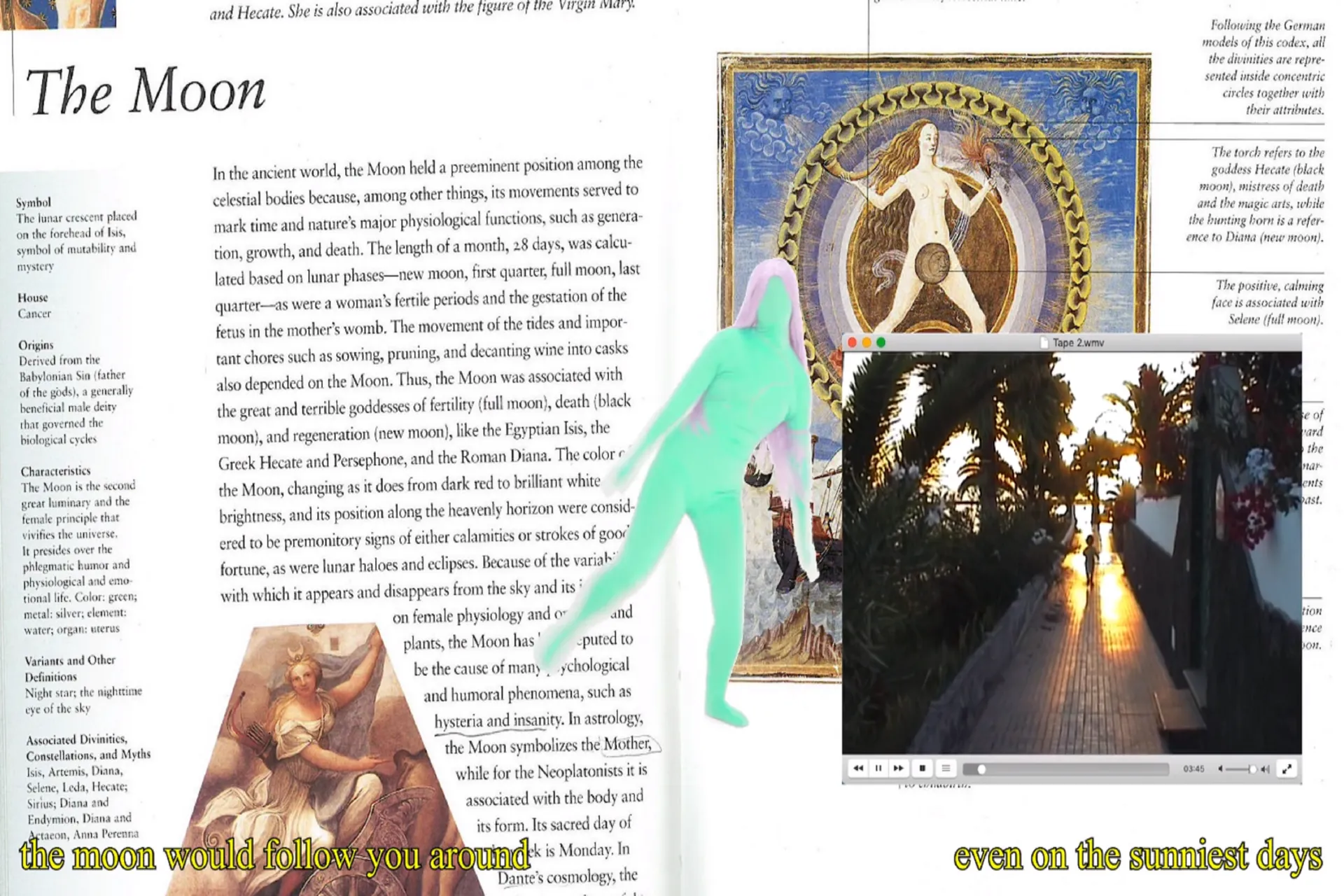I explore a variety of themes in my practice; it changes according to daily influences. More recently, I’ve been interested in astrology for example and so, it has made its in my work. However, there is always some form of absurdity in what I do; whether it is in the silliness of my actions, or in the questioning of life’s meaning. In thinking about meaning, I was led to explore the creation of my own through video making and post-production. Editing is just as important as the content of my work because it is what allows me to make sense of nonsense, improvisation, random thoughts and fragmented memories.