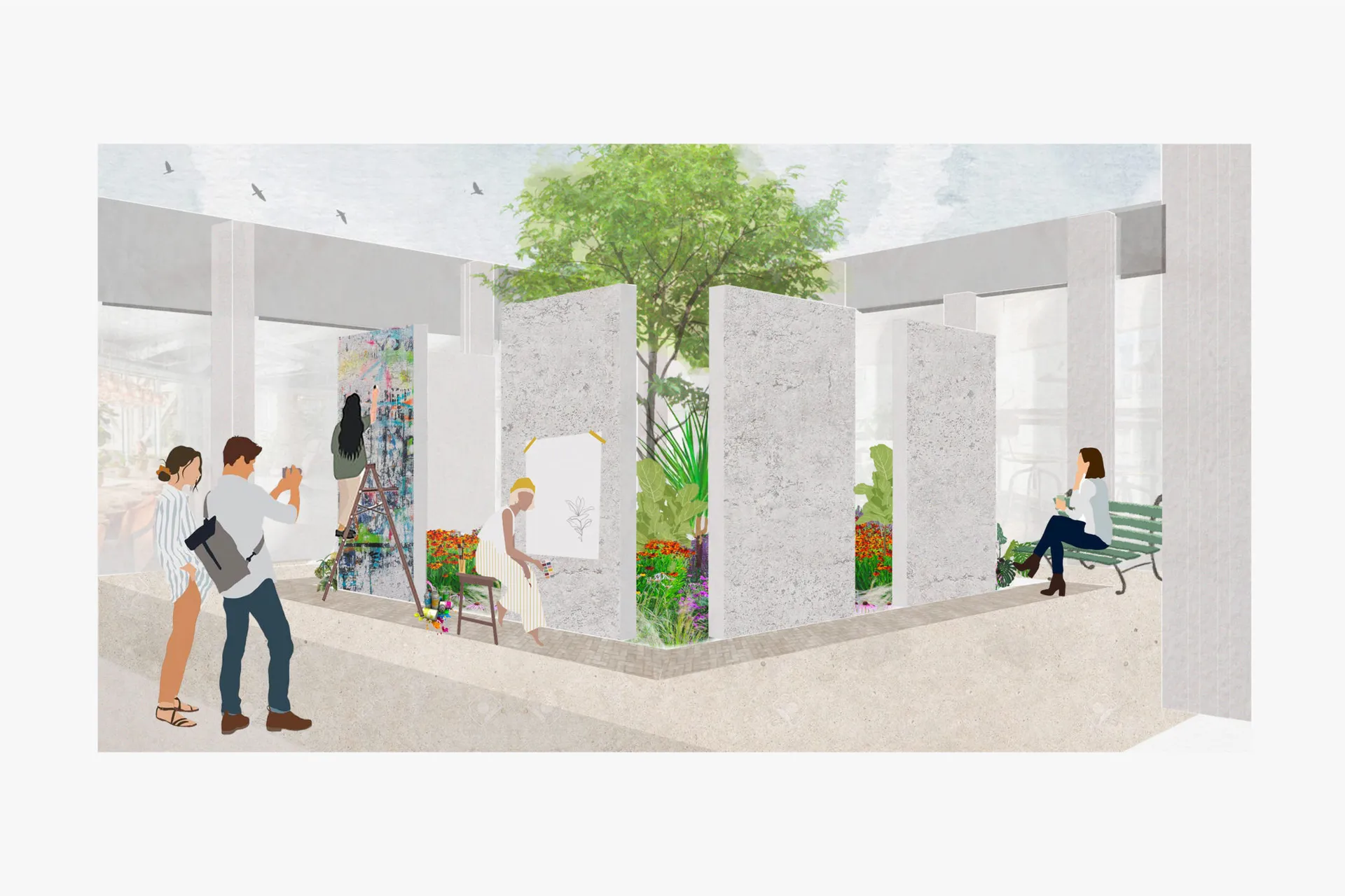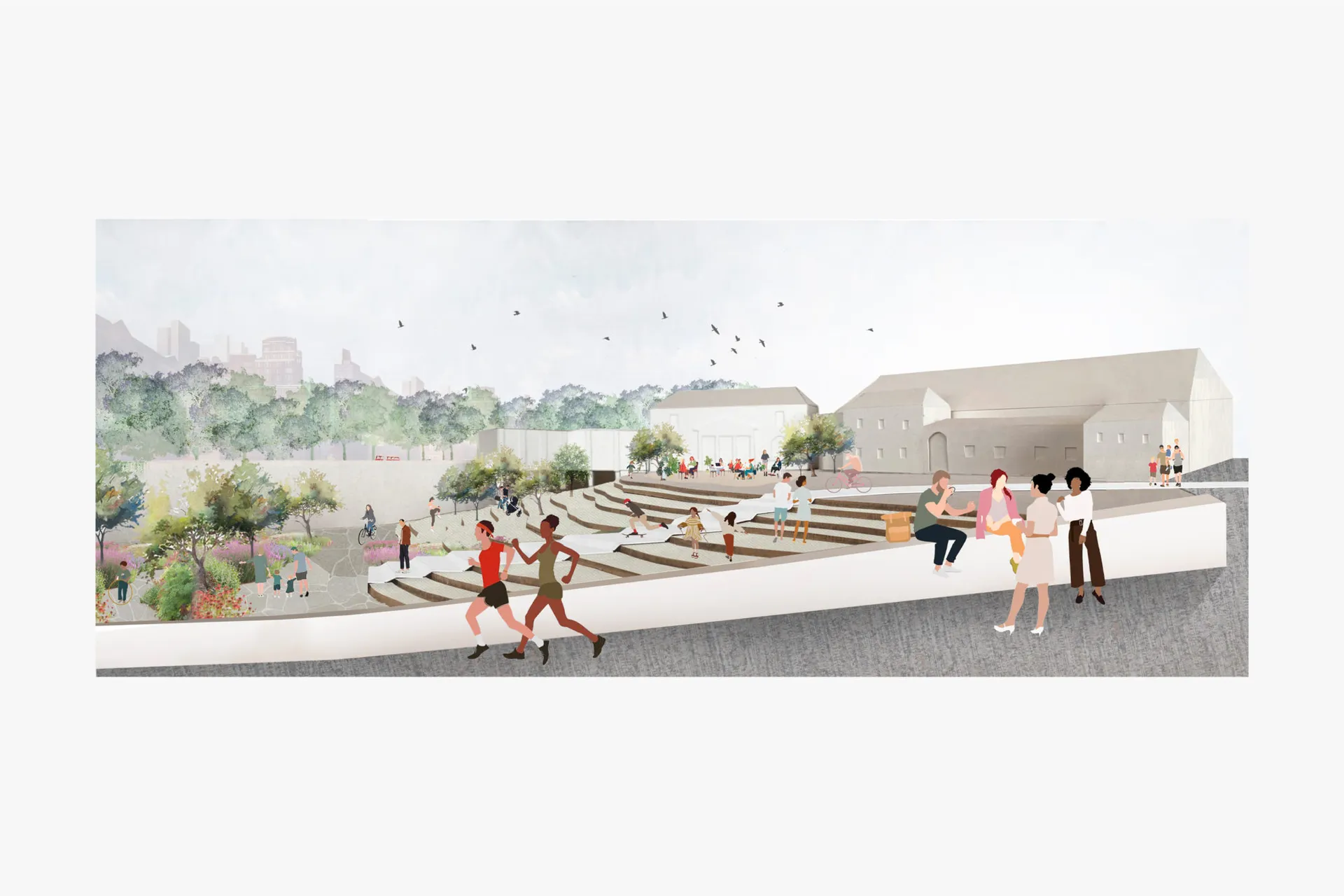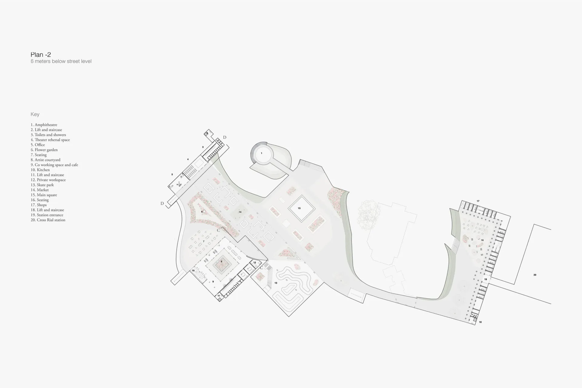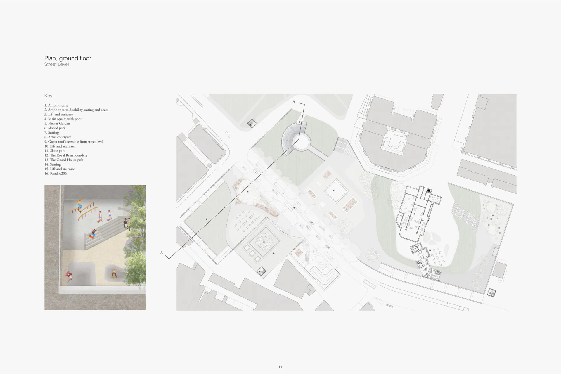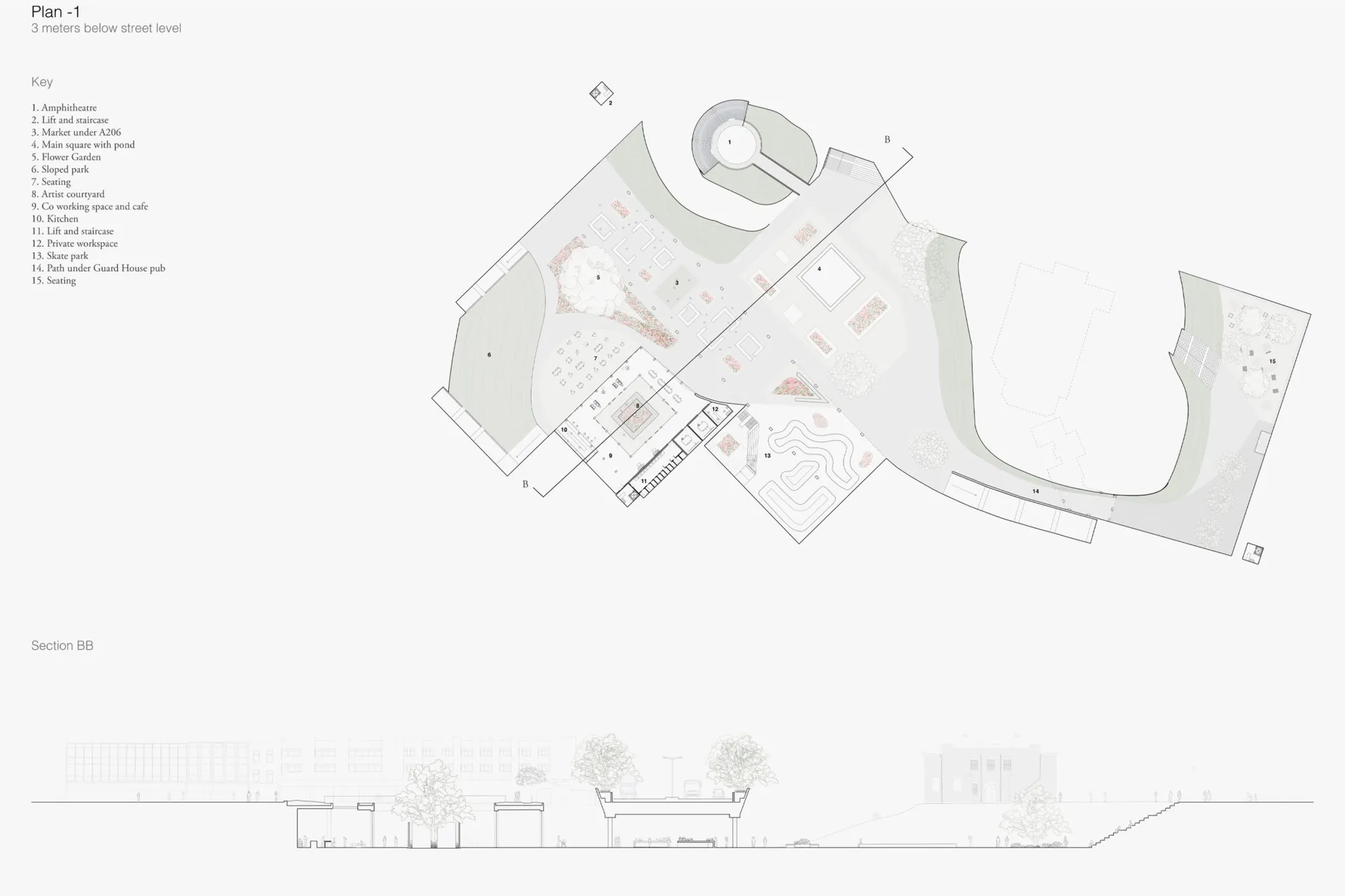 “Fragile City” expresses the struggle of the broken town. The Royal Arsenal holds the majority of pedestrian streets and green spaces. Currently a Crossrail station is being built in the Royal Arsenal, and although beneficial, its location will ultimately divide Woolwich further and reinforce the hierarchy of the Royal Arsenal. My proposal is to redefine and recreate the public realm in the centre of Woolwich, using social and green infrastructure to stitch the town back together. The project is subterranean, creating an underpass below the A206 which holds a market, multiple green spaces with a dense biodiversity, an amphitheatre, theatre, co-working spaces, courtyard gallery, restaurants and shops. The site named “Patchwork Park” offers a truly public realm catered to neither side, it will physically bring the community together giving them back some ownership and control to their town. ‘Patchwork Park’ is designed to make Woolwich more accessible and integrate people back into the fabric of the urban city.