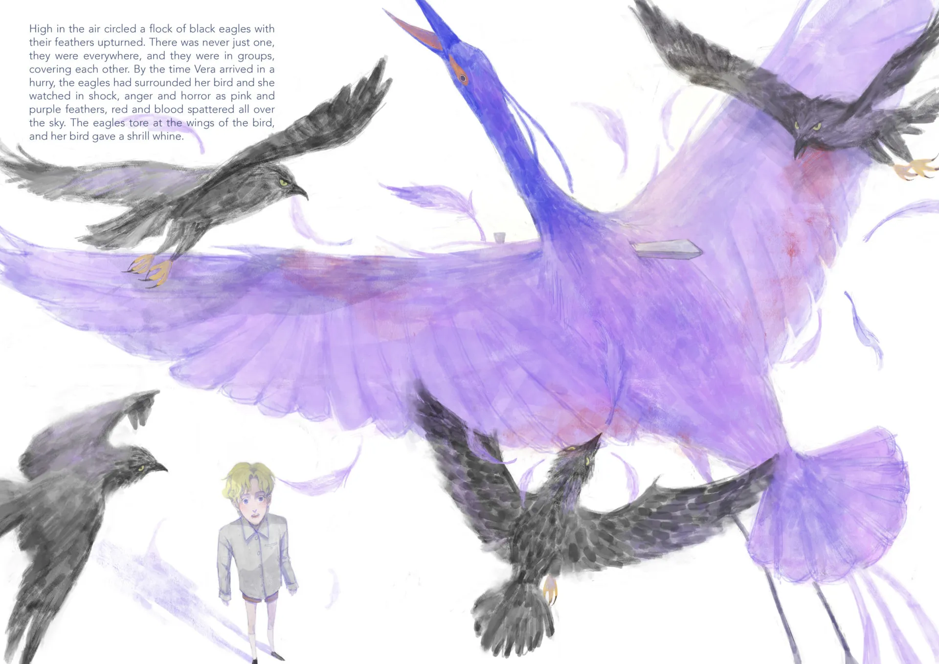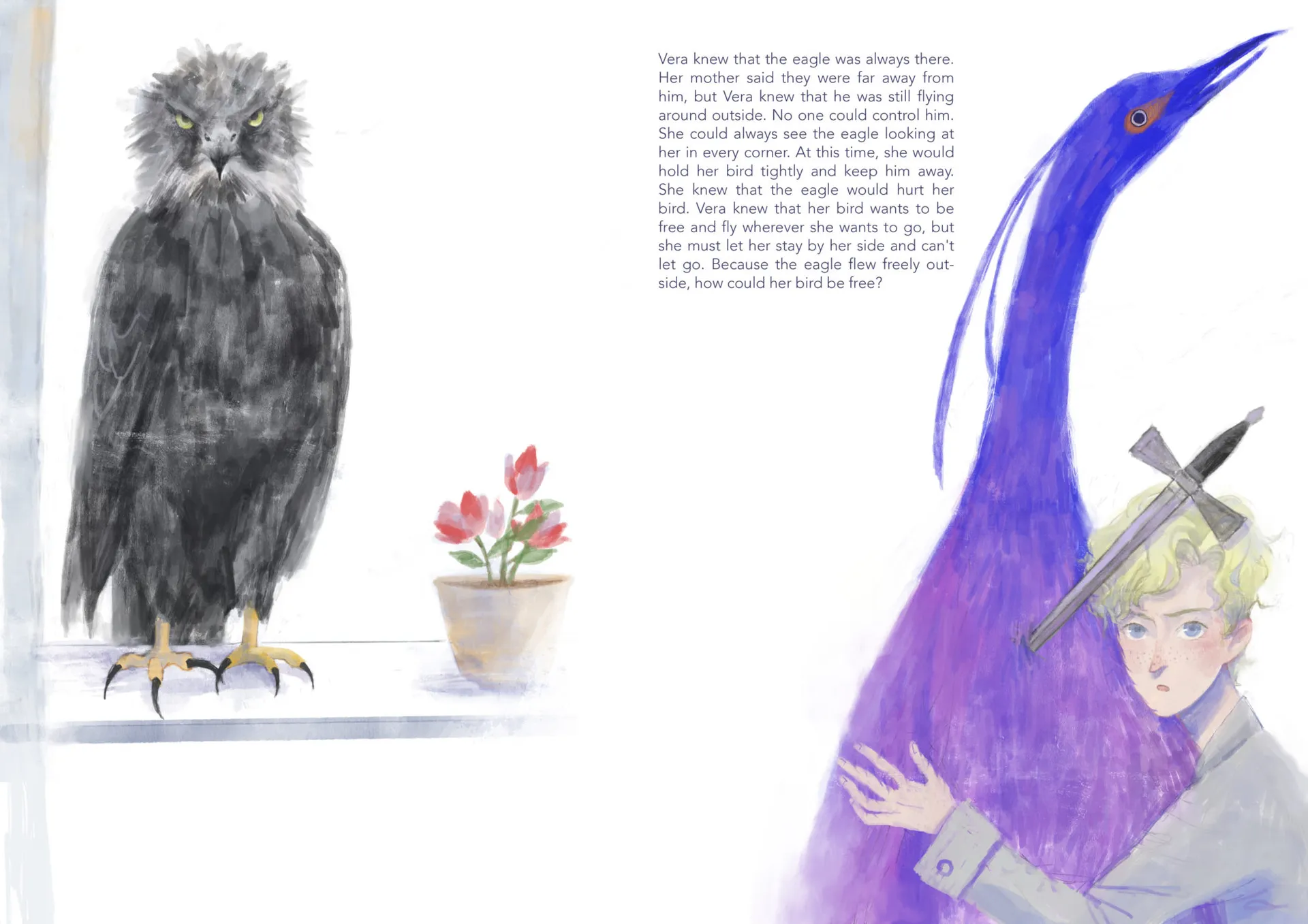 The black eagle was a memory of her past, a pattern on the man’s T-shirt and it represents the person who had hurt the girl. No matter where the girl went, he seemed to be everywhere. The eagle can fly freely like her bird and because of it the girl locked her bird to keep the bird safe from the eagles.