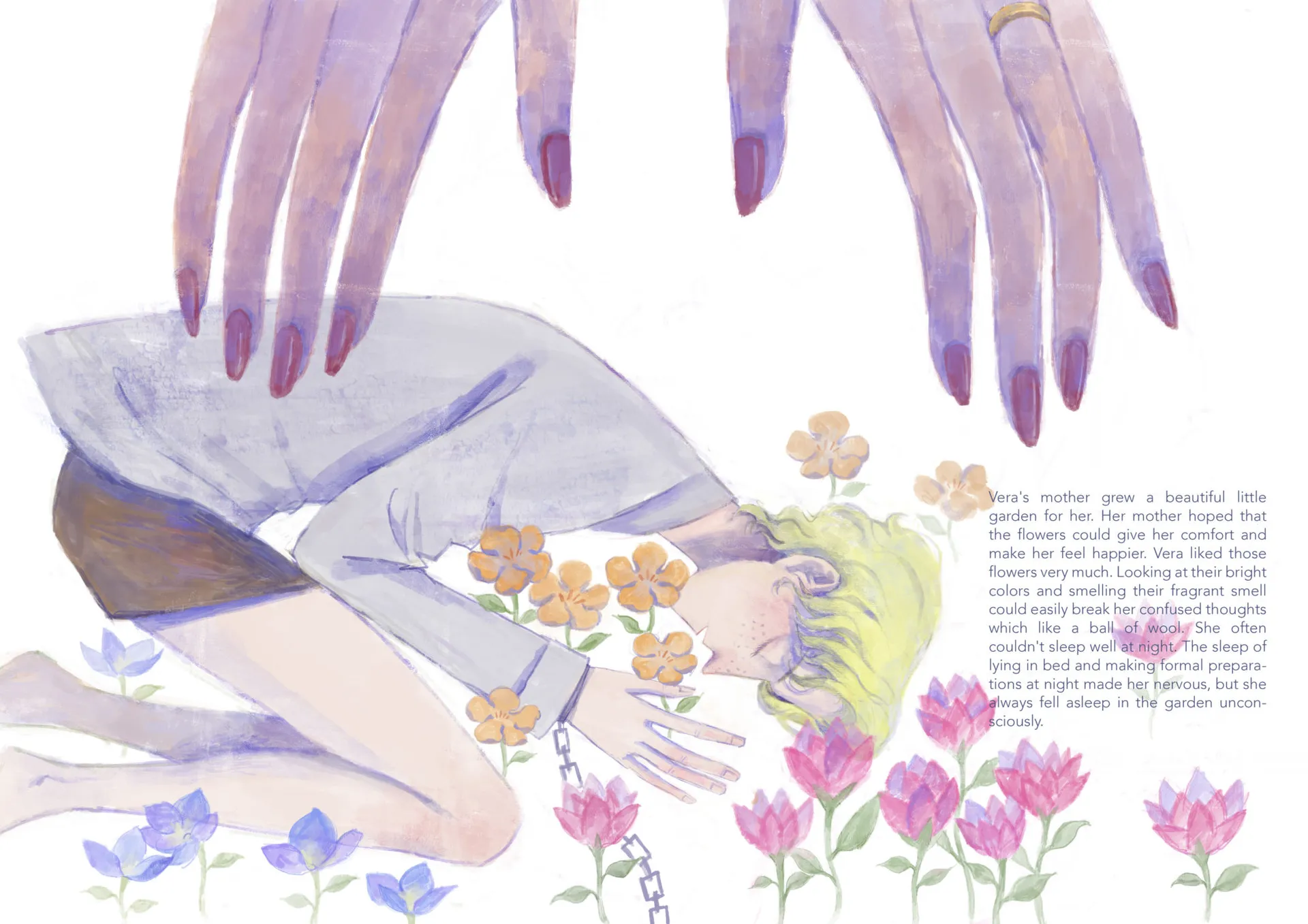 And the flowers to represent the mother with weak actions. Despite the mother could take her away from the people who hurt her and gave her some comfort, she failed to stop the tragedy in time, nor could she fight back powerfully after the tragedy.