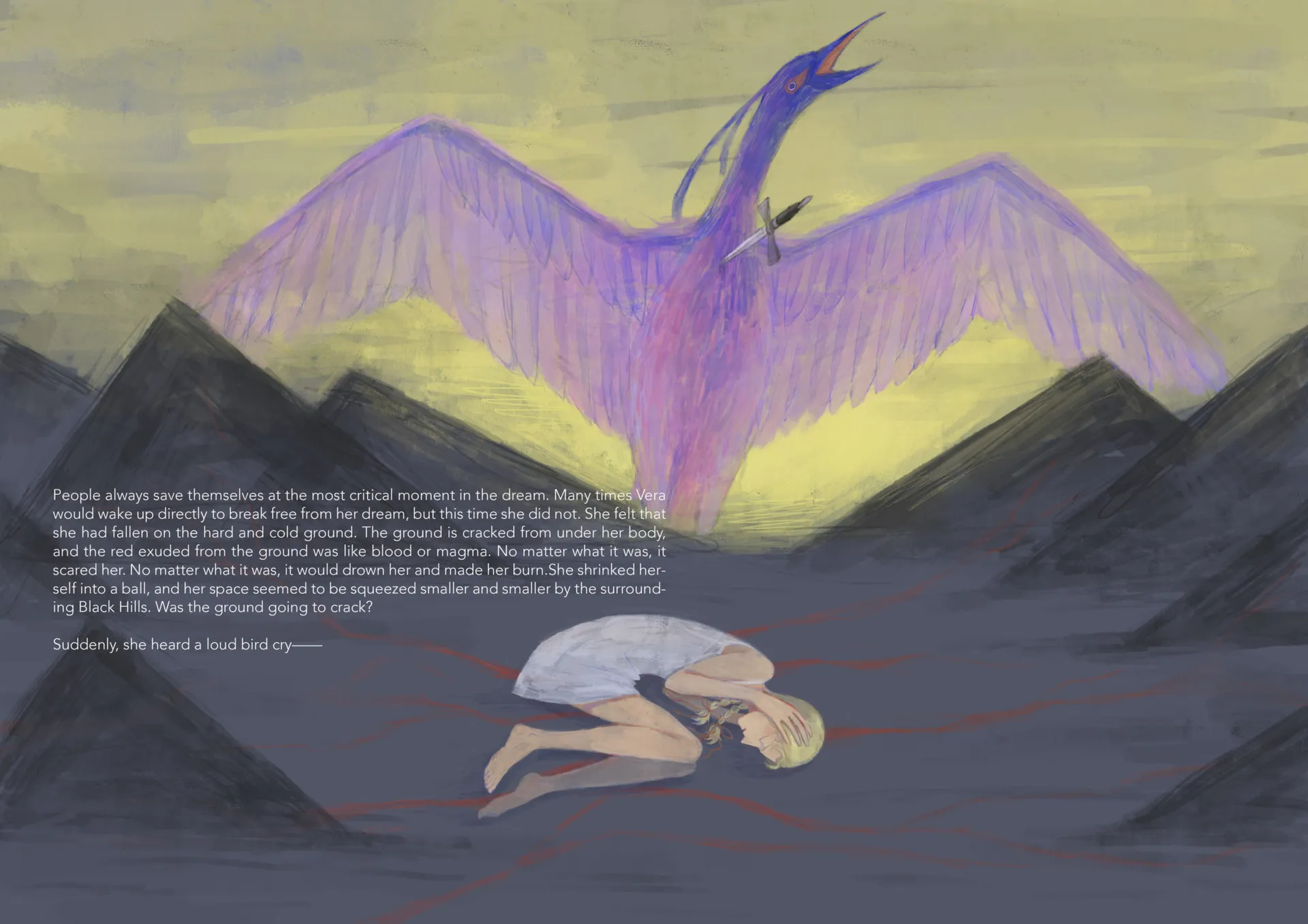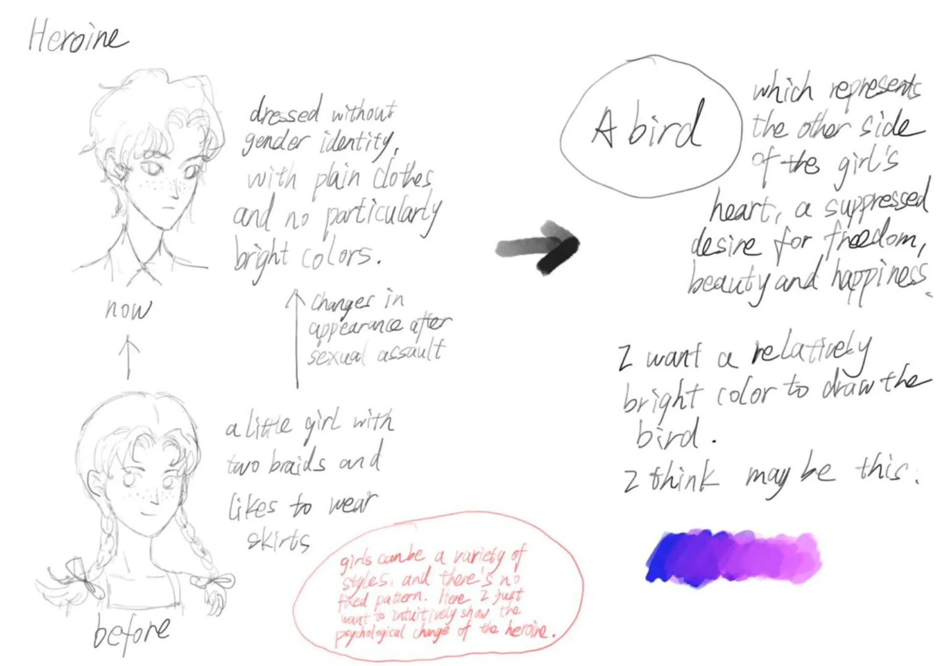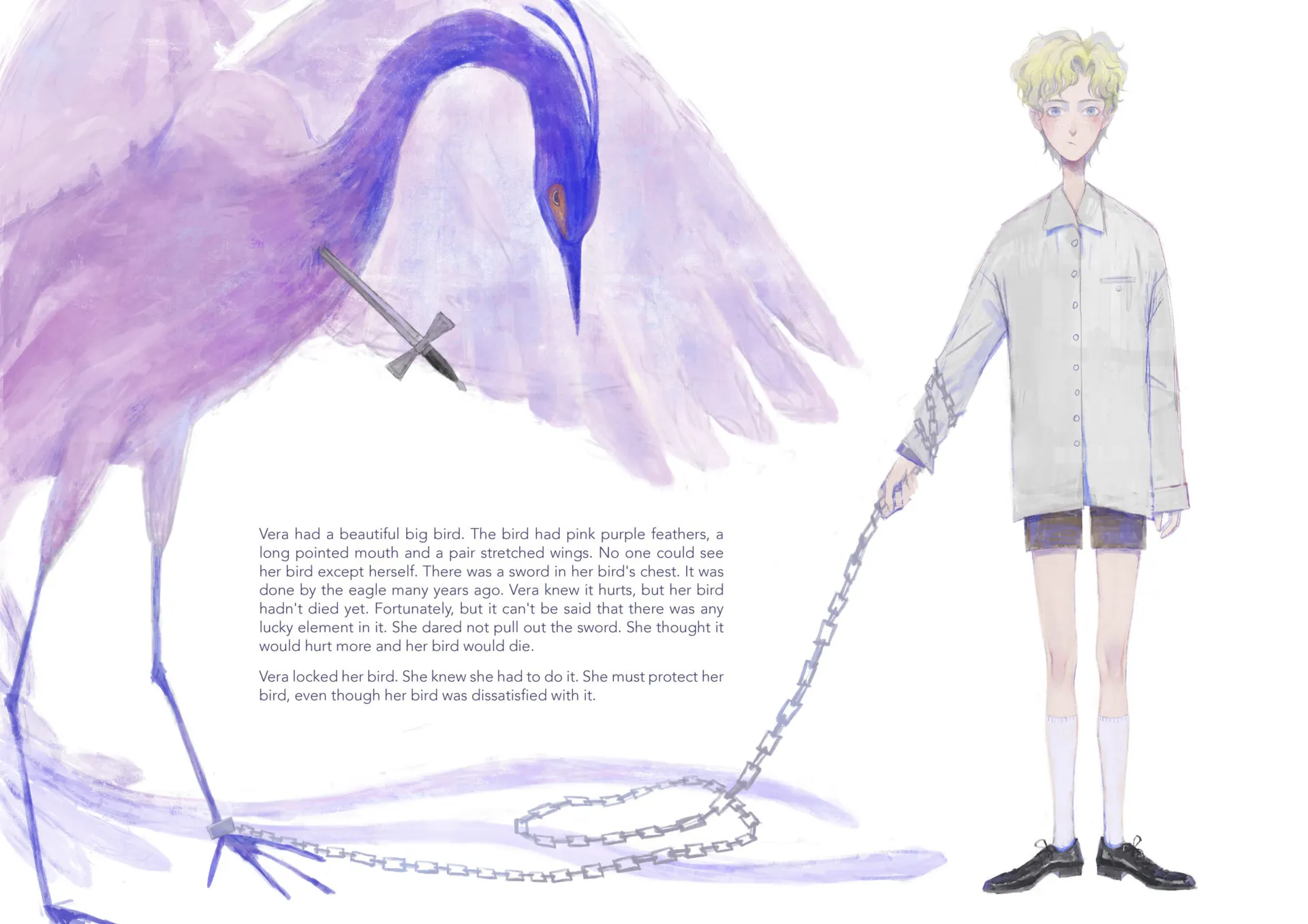 The pink and purple bird represents her inner self. the bird representing the protagonist is the embodiment of the hidden positive side in her heart. The bird leading her to break free from the chain, face herself again, and summon up the courage to protect her inner longing for good things and freedom.
