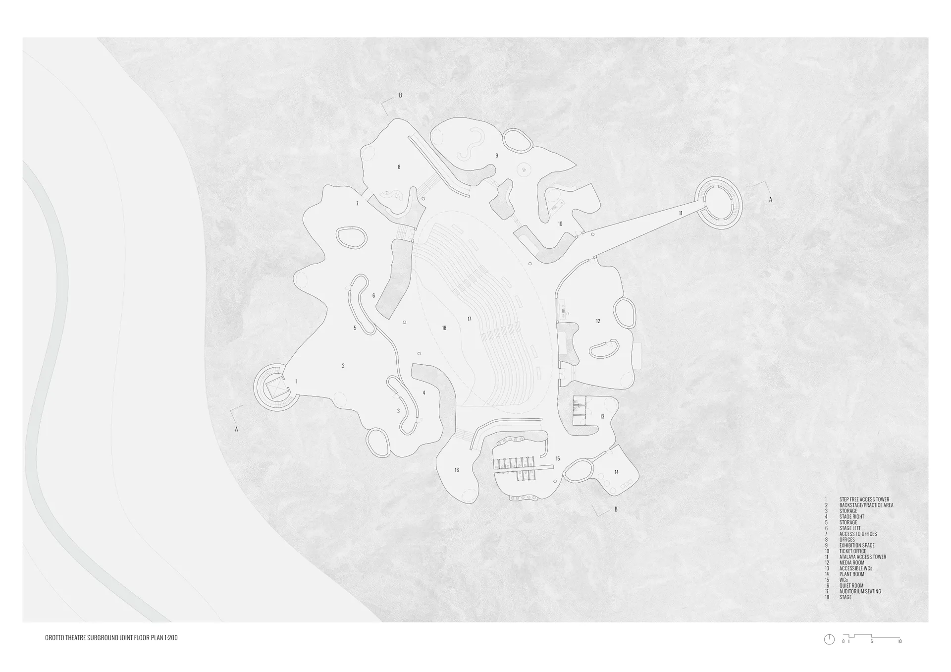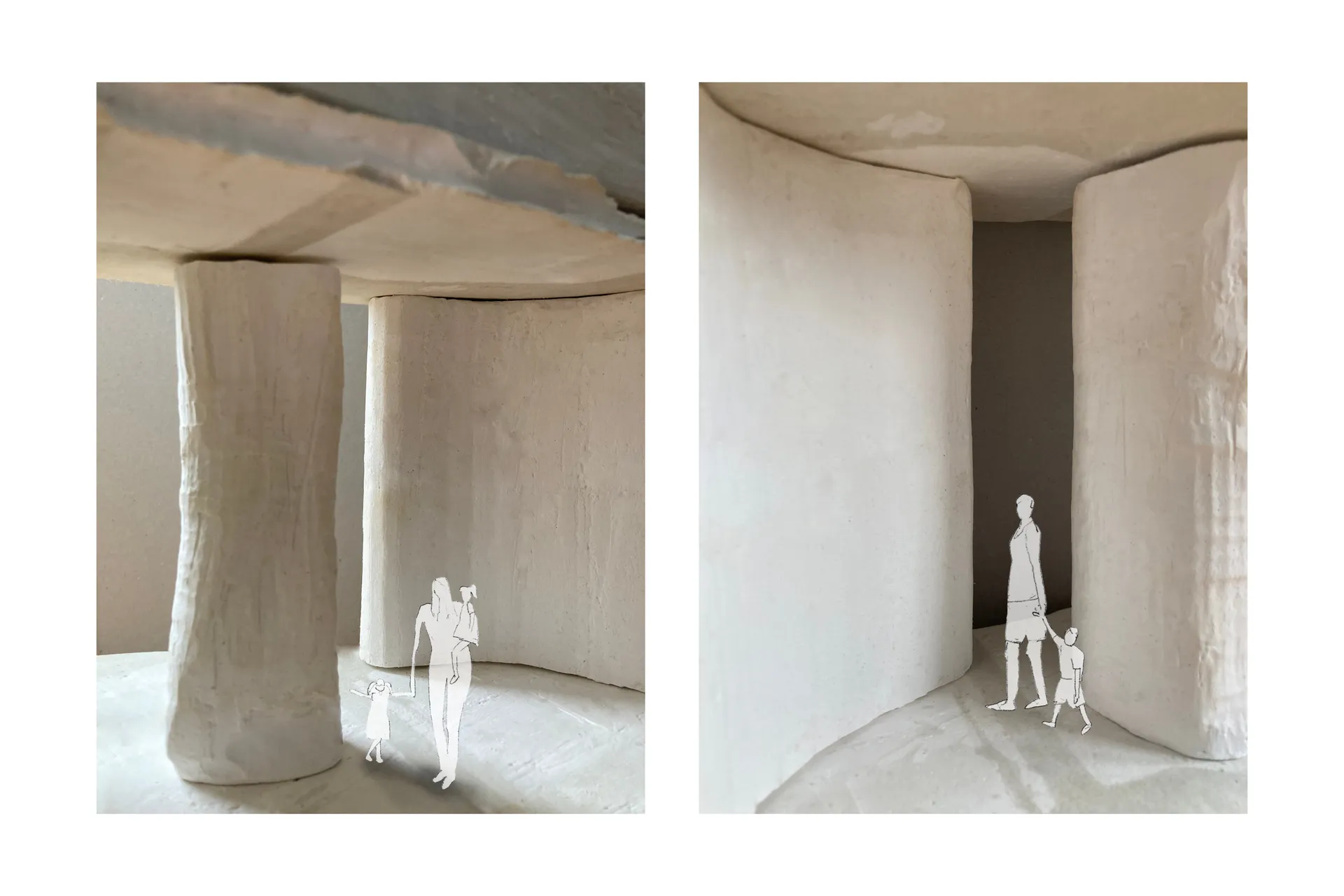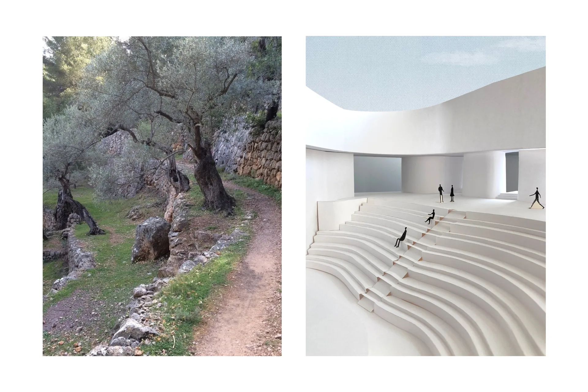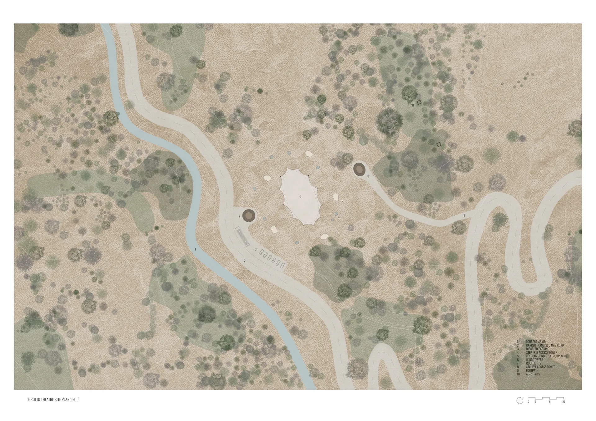 Founded in fiction, the proposal draws inspiration from the novel The White Goddess: An Encounter by Simon Gough, who recounts his time spent in Mallorca as a young boy visiting his great uncle, the poet Robert Graves. During his visit, he stumbles upon an underground grotto, which he describes as having a spiral staircase, a stone stage and an auditorium like quality. The grotto becomes a source of fascination for Simon and he revisits it periodically throughout his life. The interplay between reality, memory, play and storytelling became recurring themes for this project.