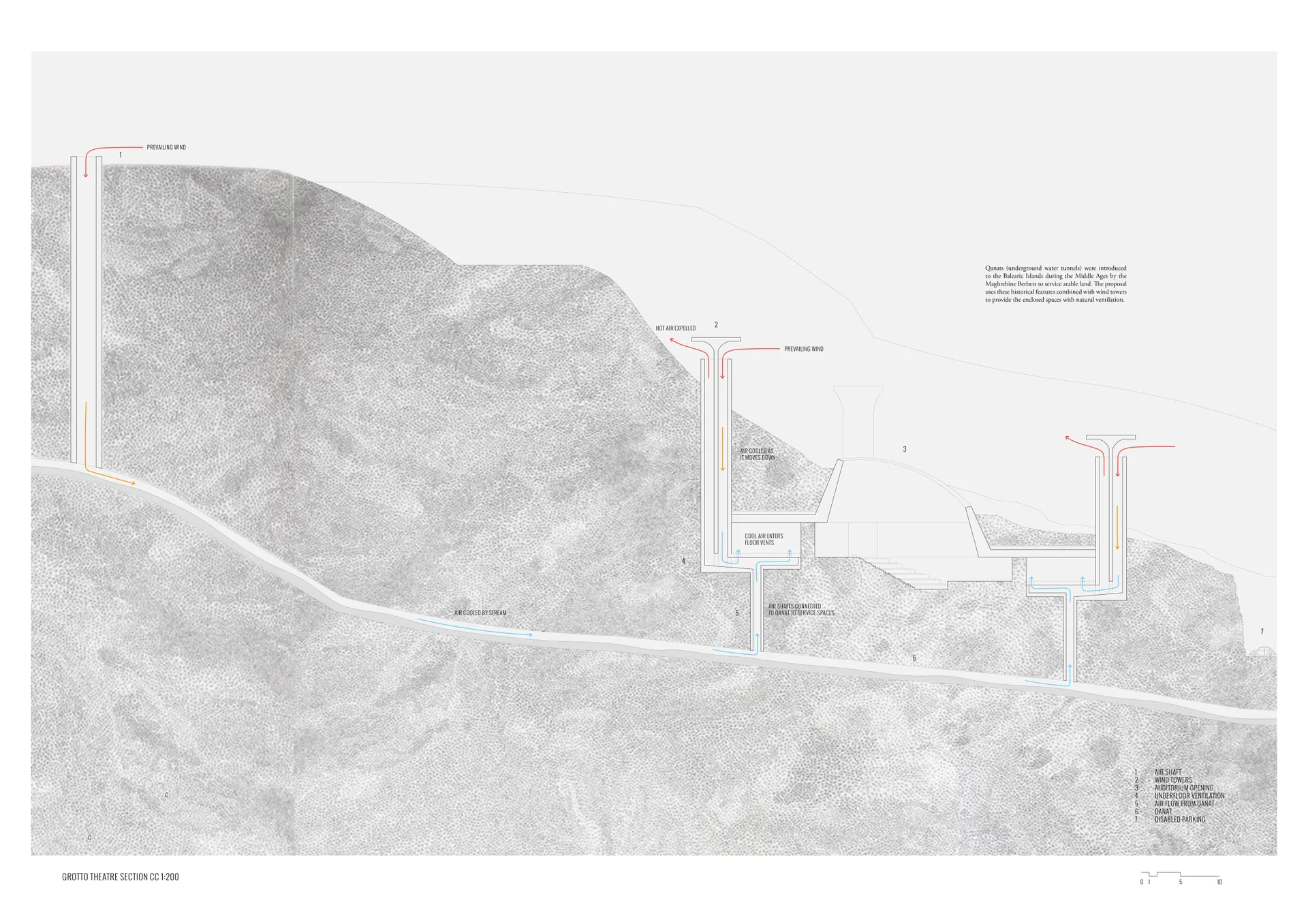 Geometries extracted from Fond Marin II, a painting by Joan Miró, who was a good friend of Robert Graves, form the limestone enclosures of the theatre. This approach allowed exploration into an unconventional method of creating a plan for the grotto space that felt both carved and made. The earth initially excavated is laid on top of the limestone and wind towers emerge from the landscape acting as landmarks to service the spaces with natural ventilation. These towers connect to an underground tunnel, called a qanat, flowing into the torrent at the bottom of the site. Qanats were introduced to the Balearic Islands by the Maghrebine Berbers in the Middle Ages, who used them to irrigate arable land. Access to the theatre comes from two atalayas, watch towers, at either end of the site, each encasing the spiral stone staircase that Simon describes.