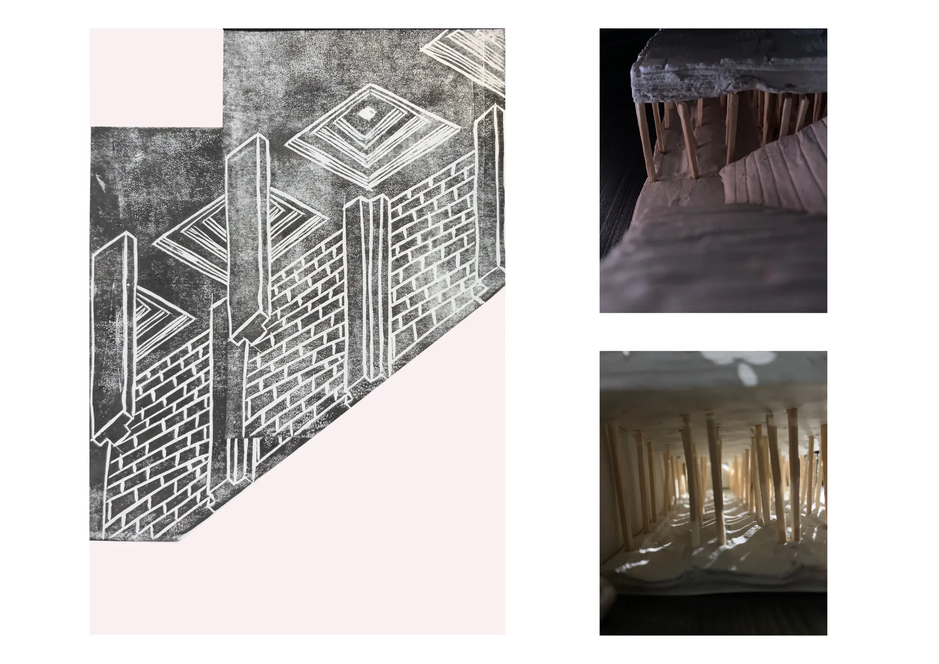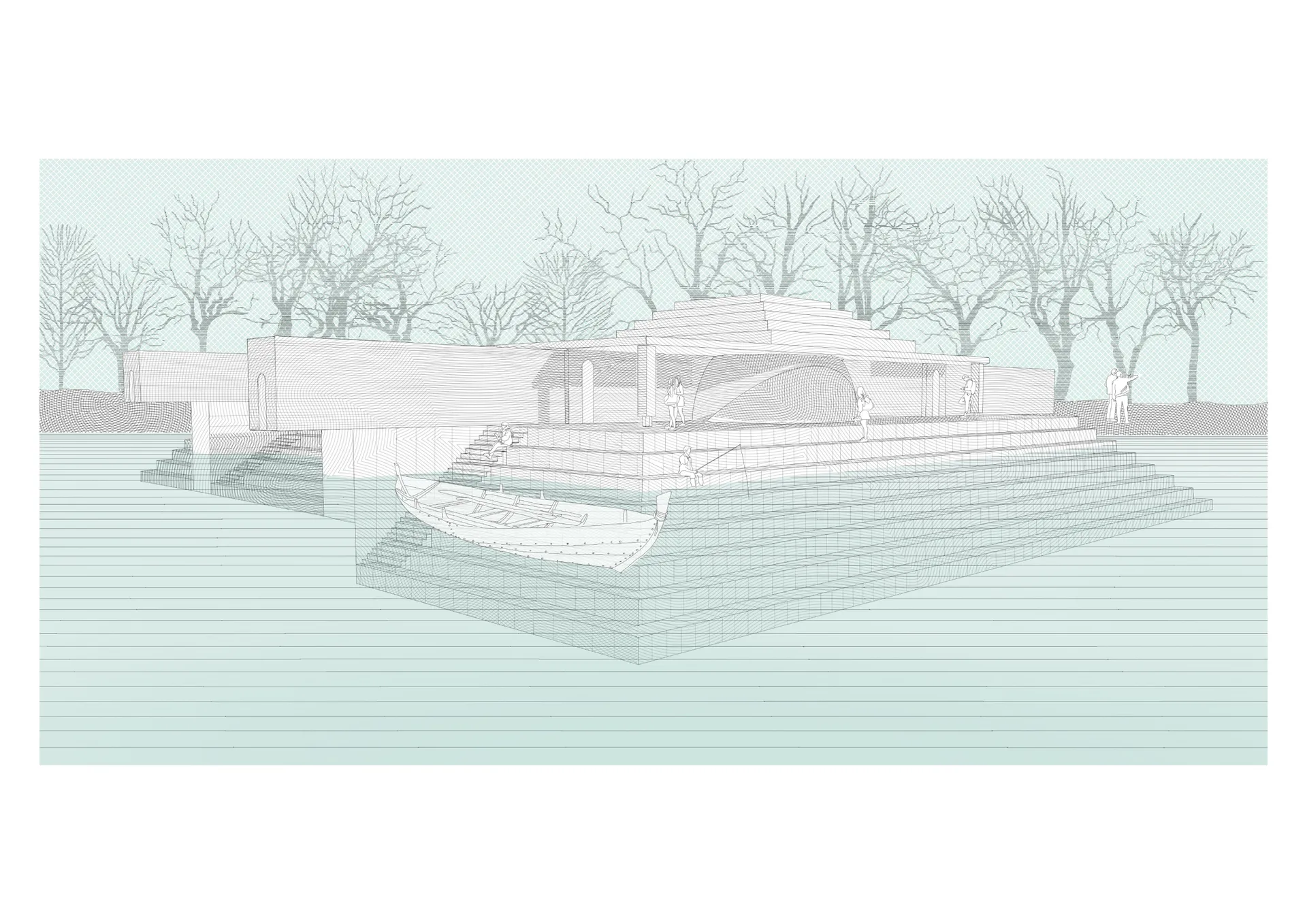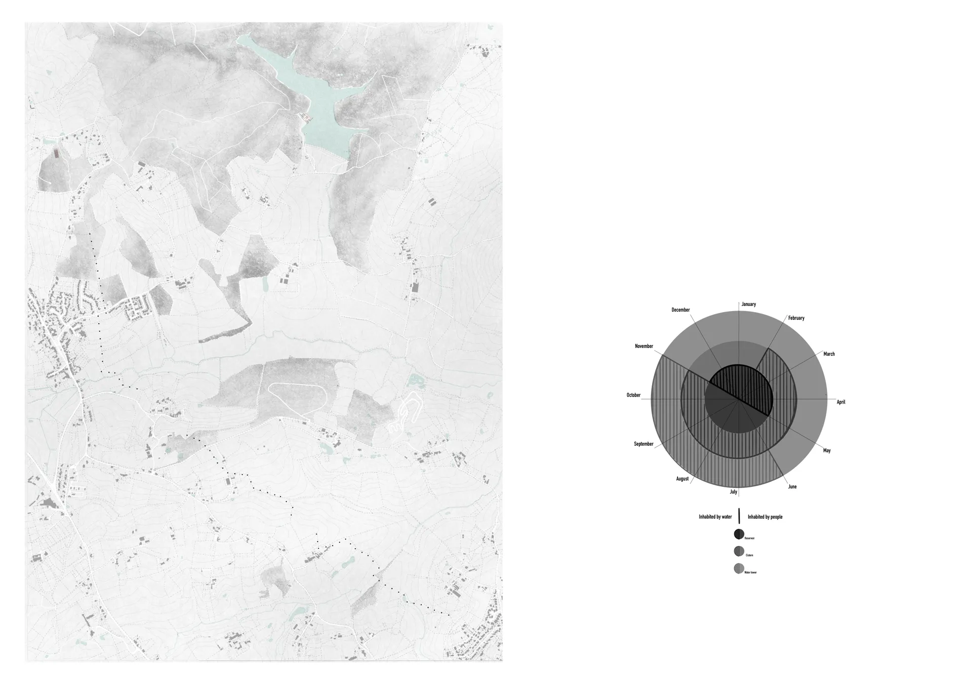 Set in one of the most water-stressed areas of England, East Sussex, my proposal seeks to use the element of the grotto as a vessel that captures water from flood zones and transports it to areas experiencing drought. Grottos in my project are used to mean stretched spatial thresholds which unite indoors and outdoors. A grotto protects the inhabitor from the elements by slowing their effects but allowing them entry to the protected space. Three connected elements create this network. Firstly, the outtake building is located within the flood zone of the powdermill reservoir, secondly, the subterranean cistern located on the hills north of Brede Valley and an aqueduct stretching from Sedlescombe to Westfield Village. The domed step-well captures overflowing water from the reservoir and guides it to the cistern where it is filtered and stored until Summer. Then, it leads to an aqueduct over hills and valleys to Westfield. Each infrastructural element is designed for secondary public/civic use during parts of the year. During Spring when water levels are lower at the reservoir, the out-take building is home to the Hastings Fly Fishers Club and in the summer, used as a summer school about water processes. The civic space above the cistern can be used all year round as a public park and a means to learn about the ecosystem and different habitats. These three provisions which carry water create a narrative much like the book fragmented, yet effective.