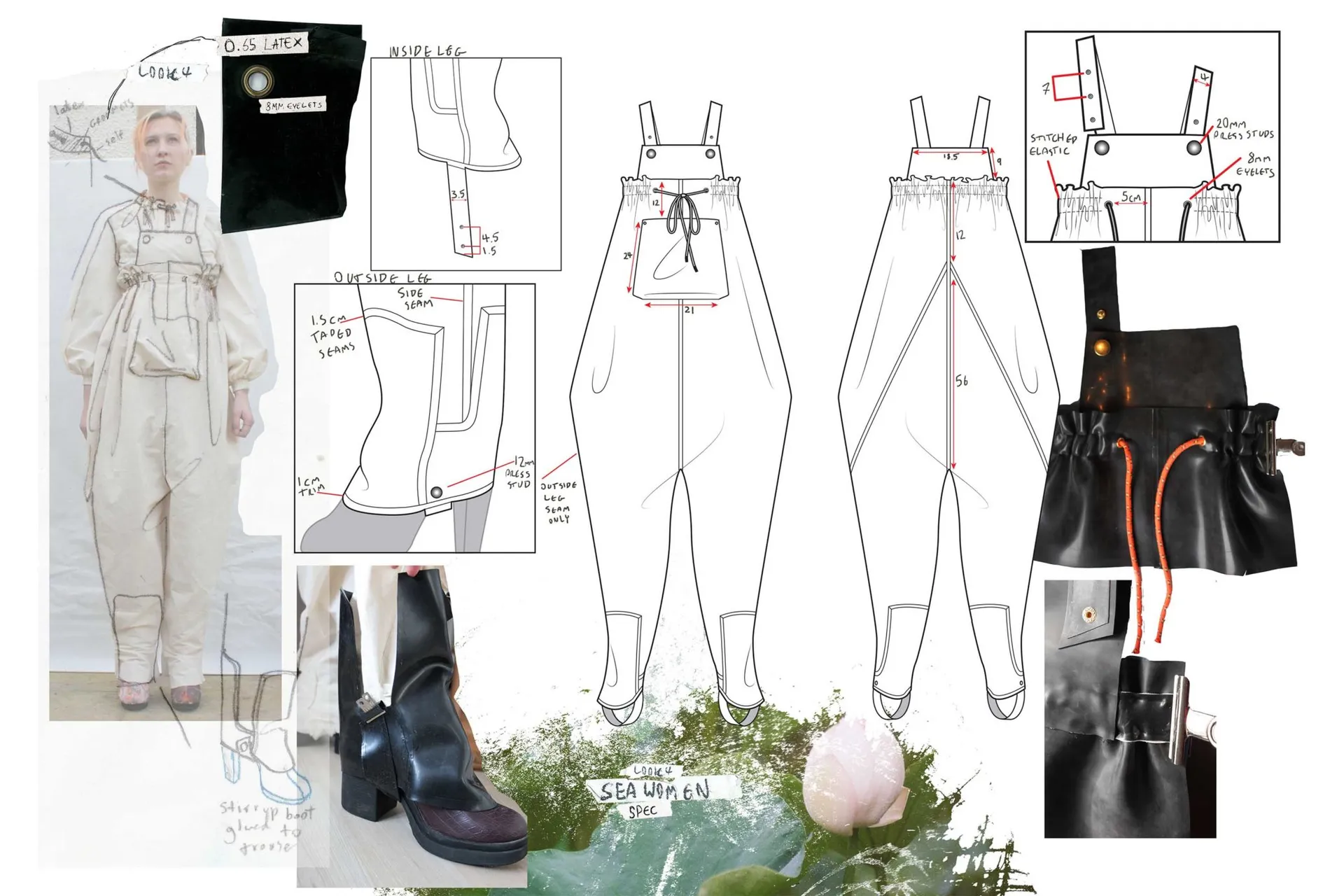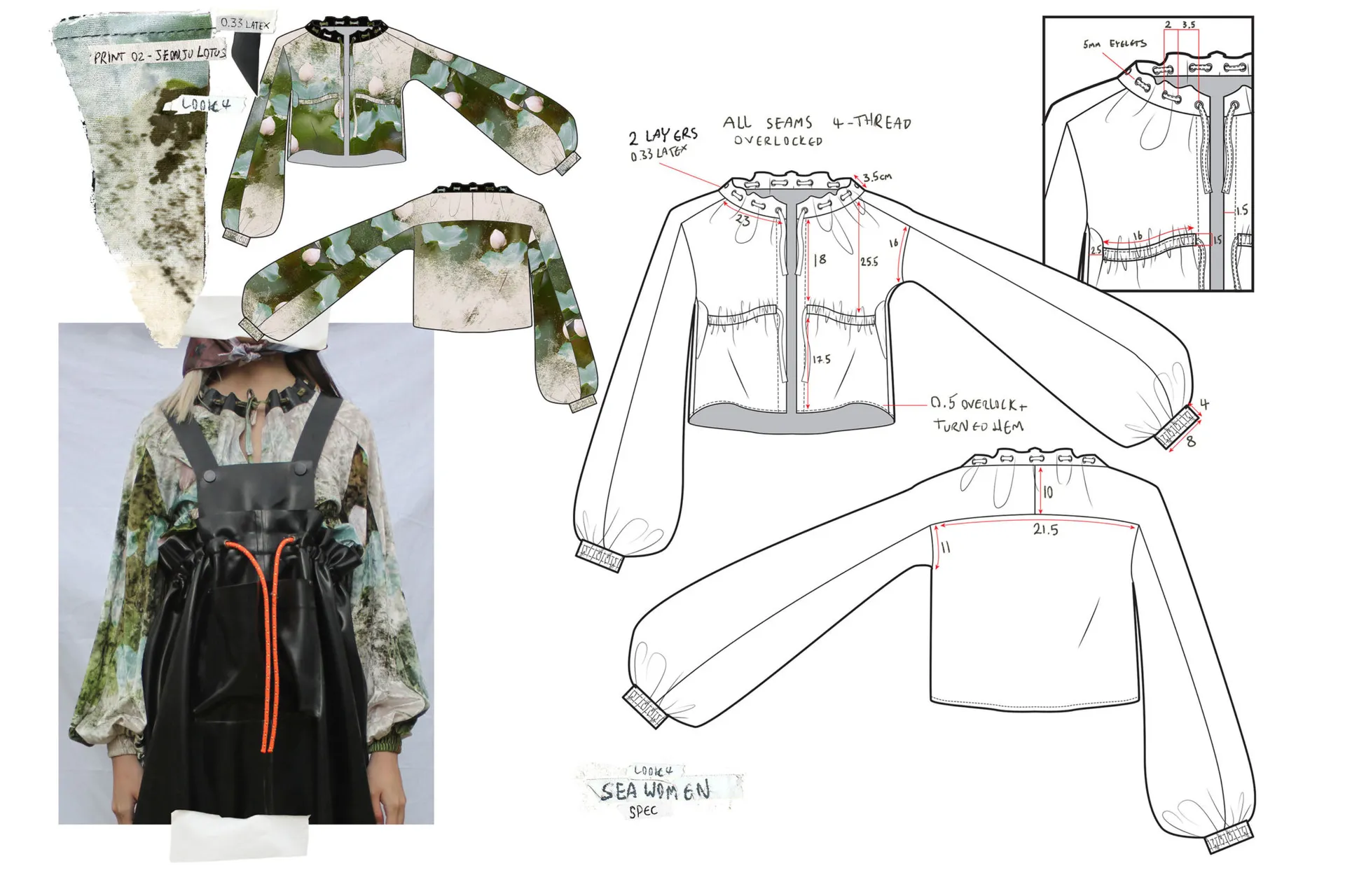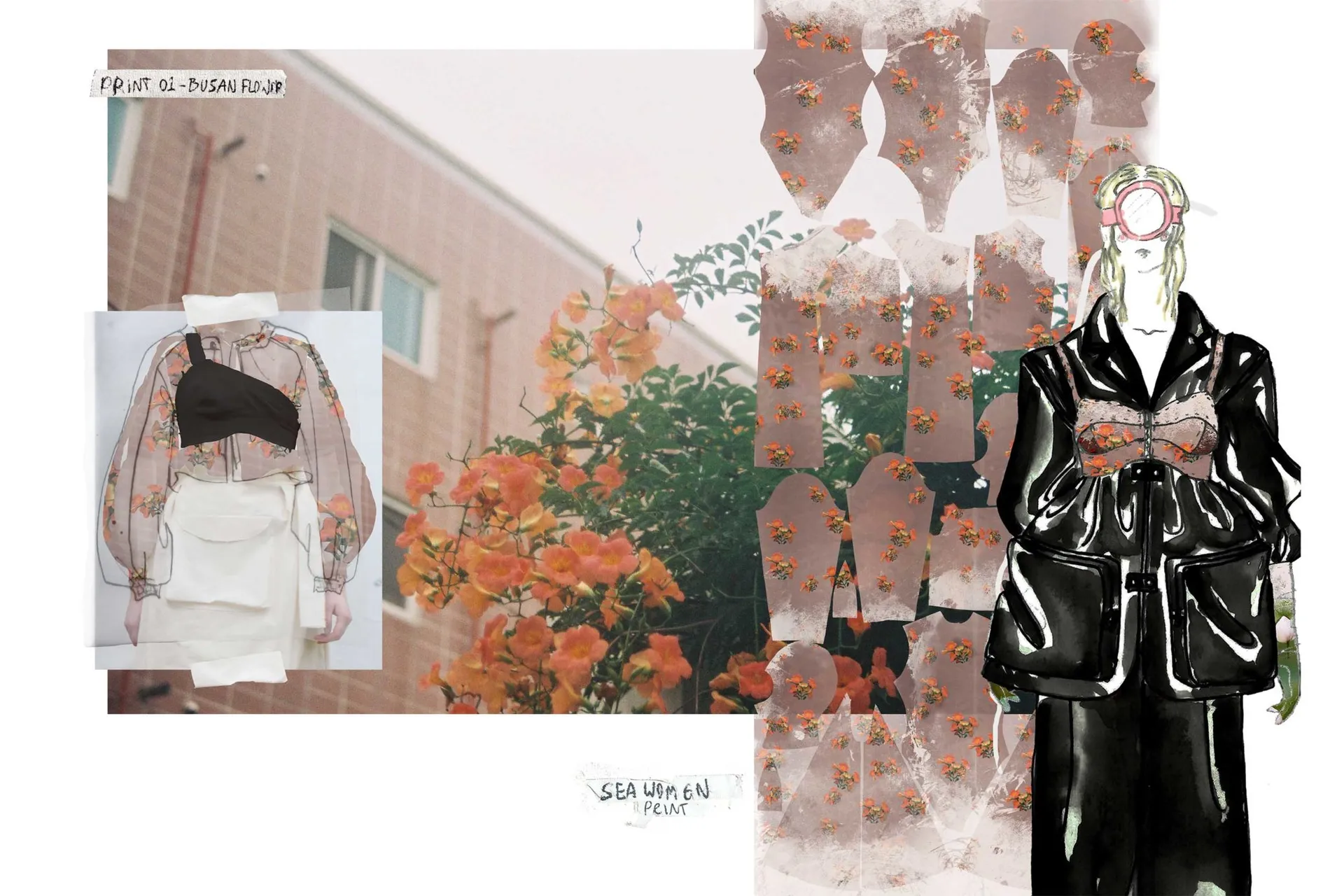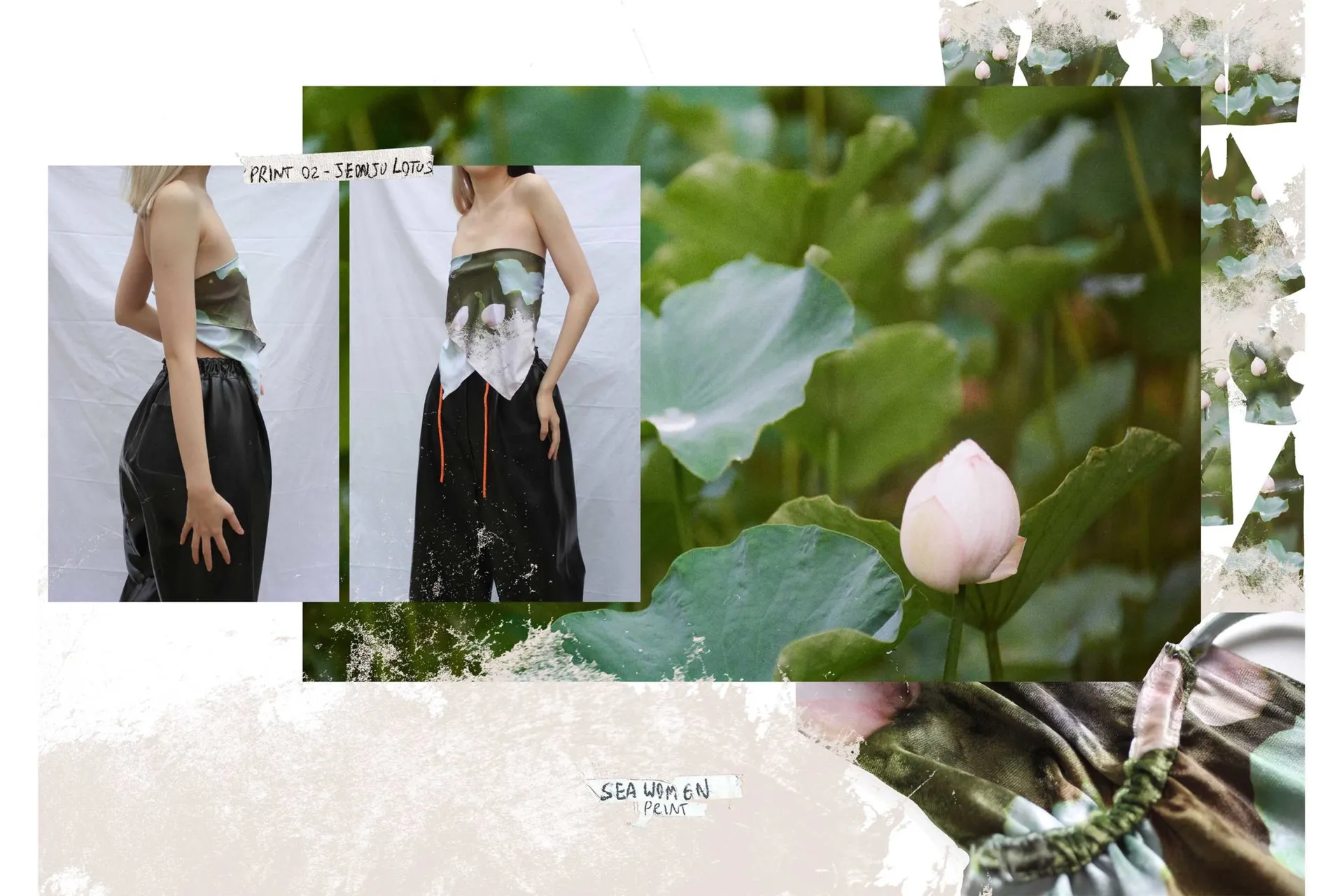 Haenyeo [해녀], the female free divers of Jeju Island are the inspiration for this collection. I wanted to create an empowering collection that celebrates their strength and individuality, using latex, a renewable material, to create strong, voluminous shapes. Each print comes from analogue images I took whilst studying and travelling in South Korea, edited to create modernised floral patterns that reflect the diver’s weathered clothes.