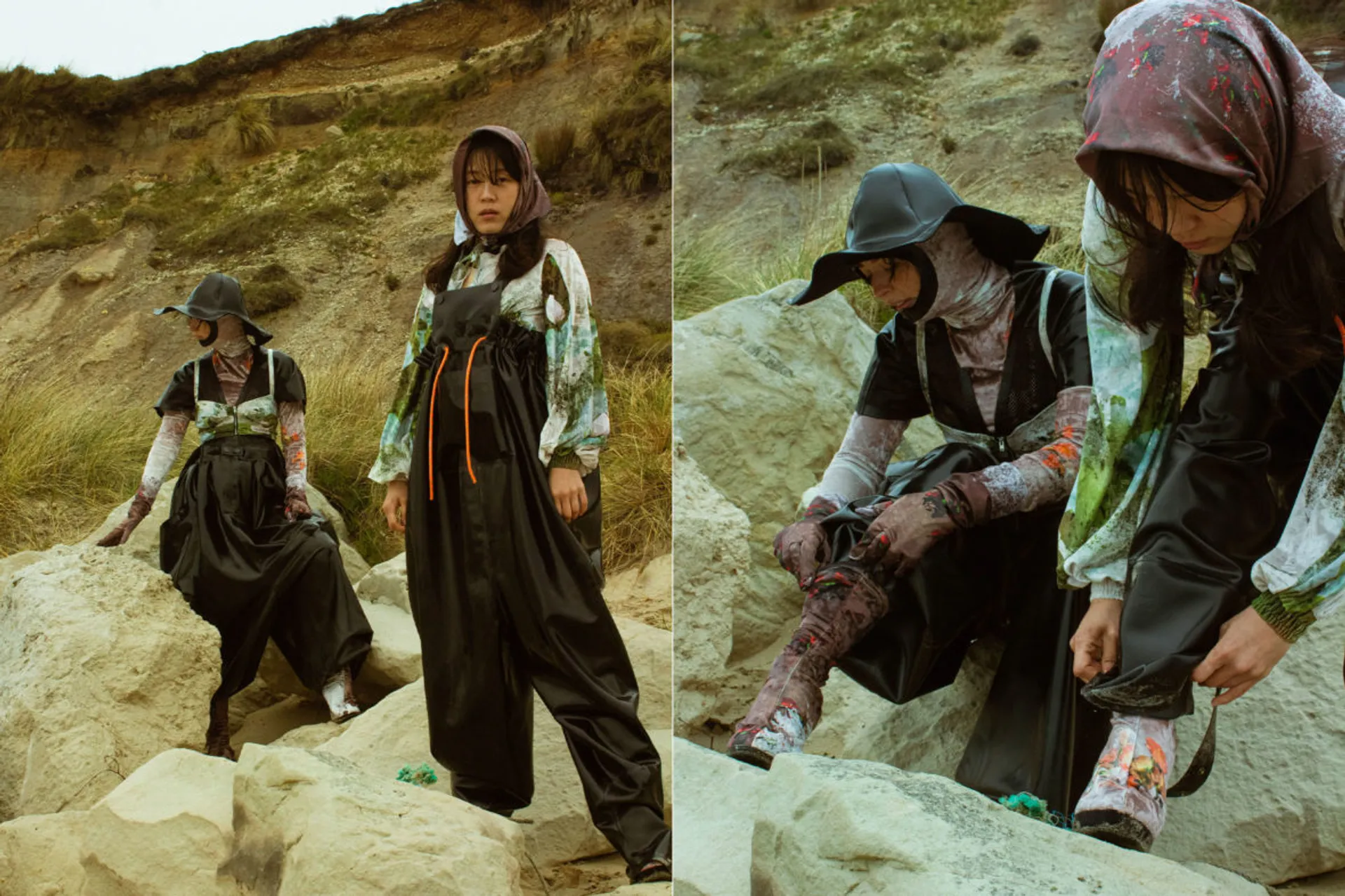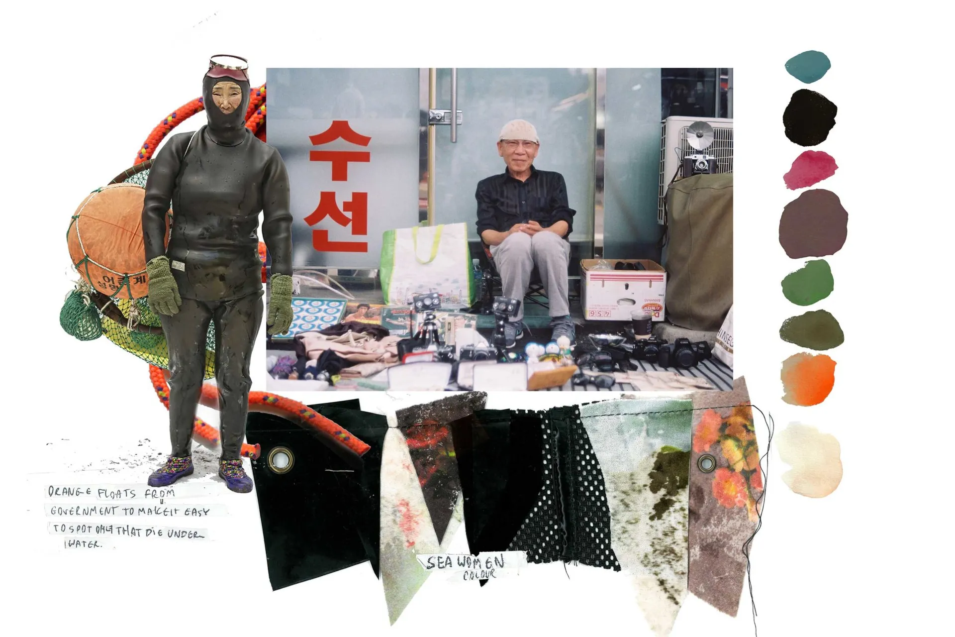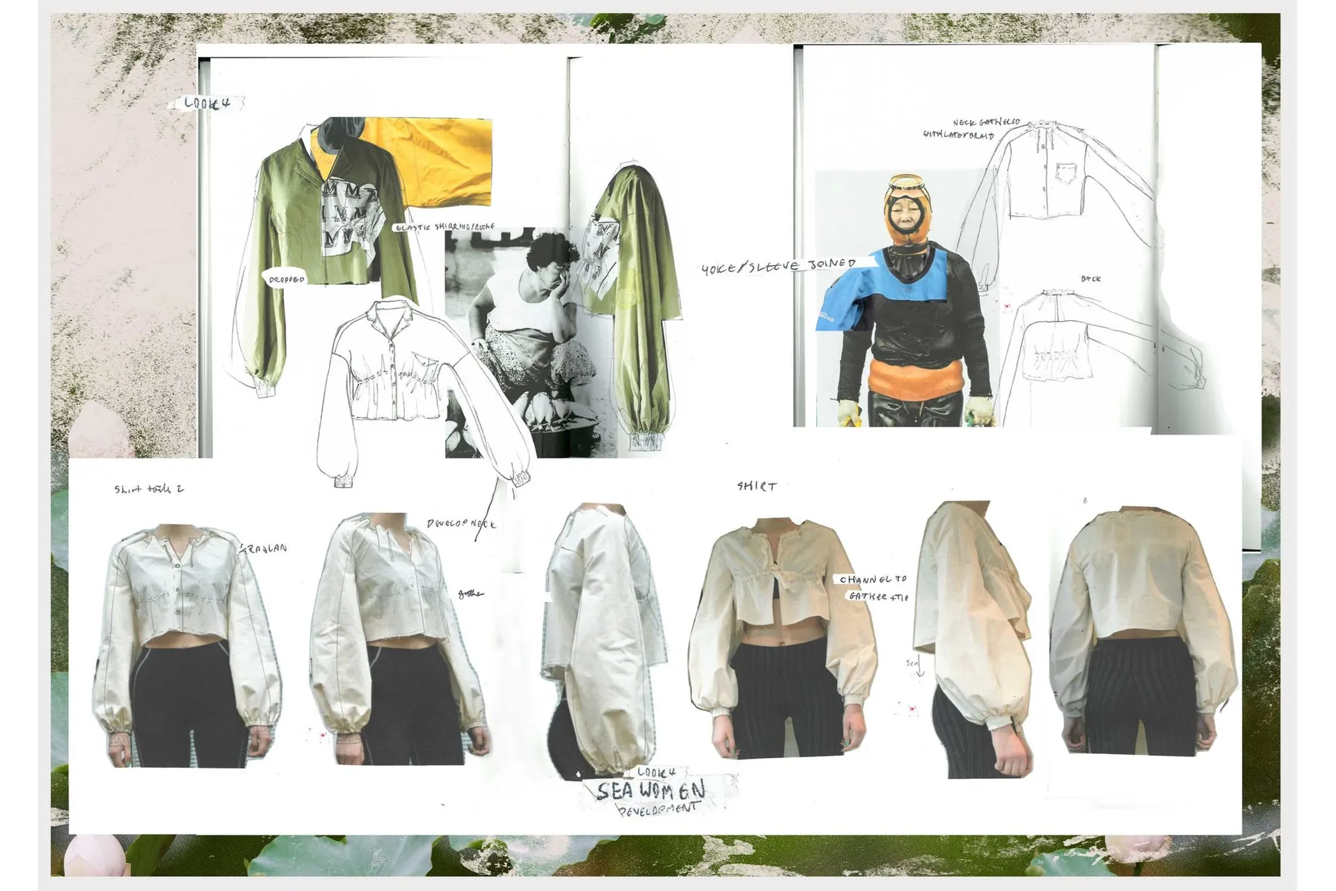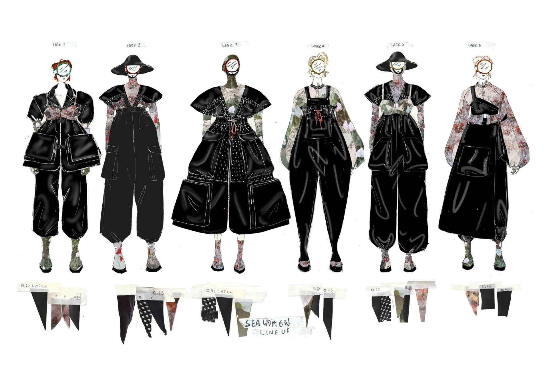 Haenyeo [해녀], the female free divers of Jeju Island are the inspiration for this collection. I wanted to create an empowering collection that celebrates their strength and individuality, using latex, a renewable material, to create strong, voluminous shapes. Each print comes from analogue images I took whilst studying and travelling in South Korea, edited to create modernised floral patterns that reflect the diver’s weathered clothes.