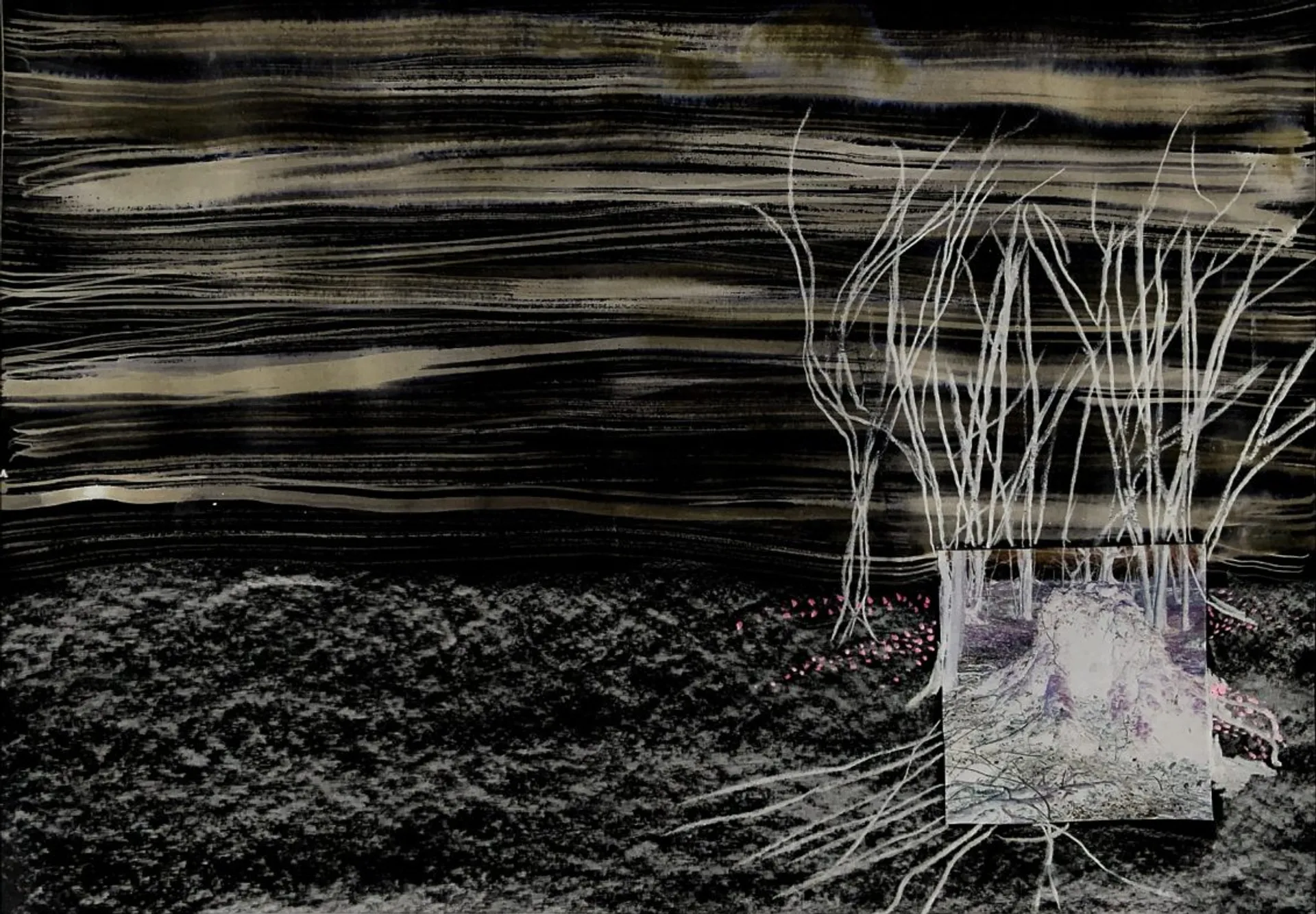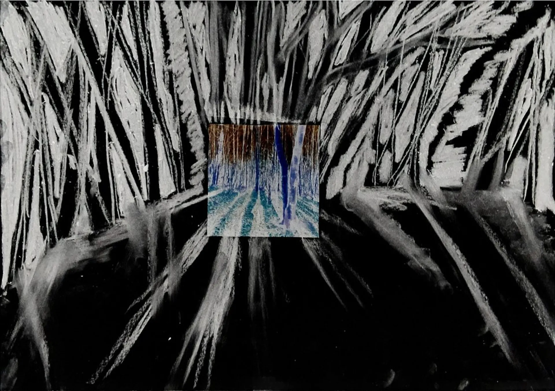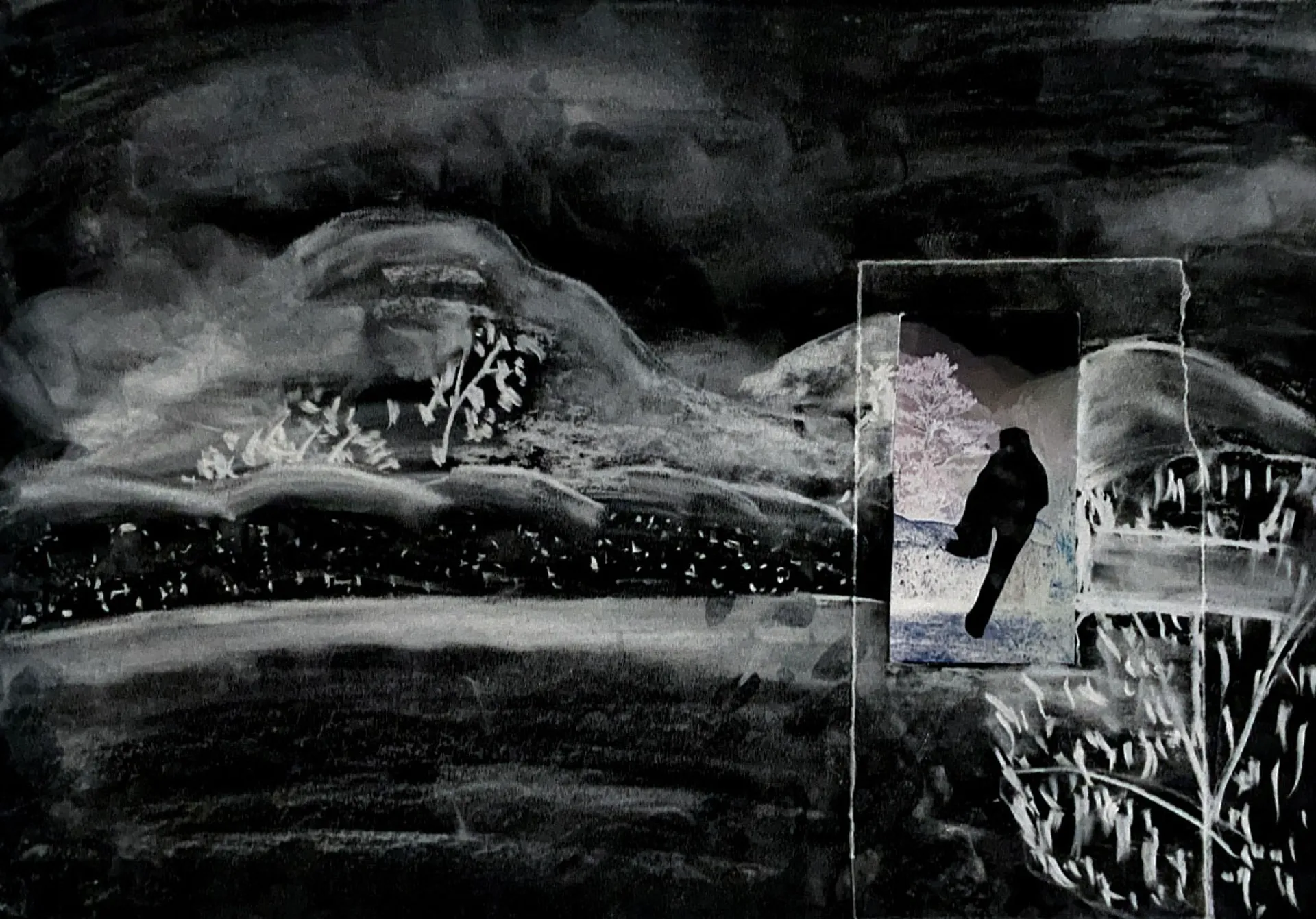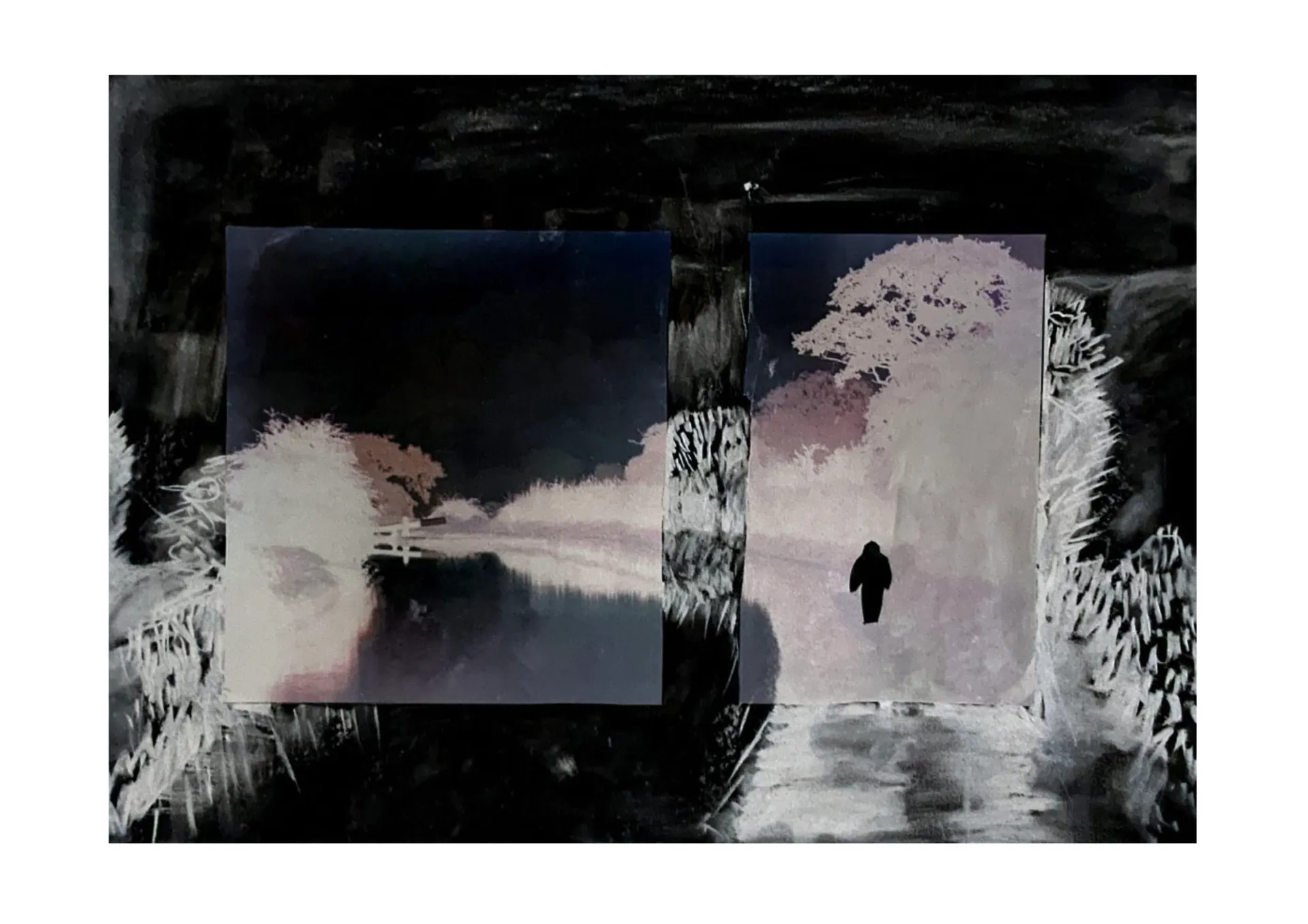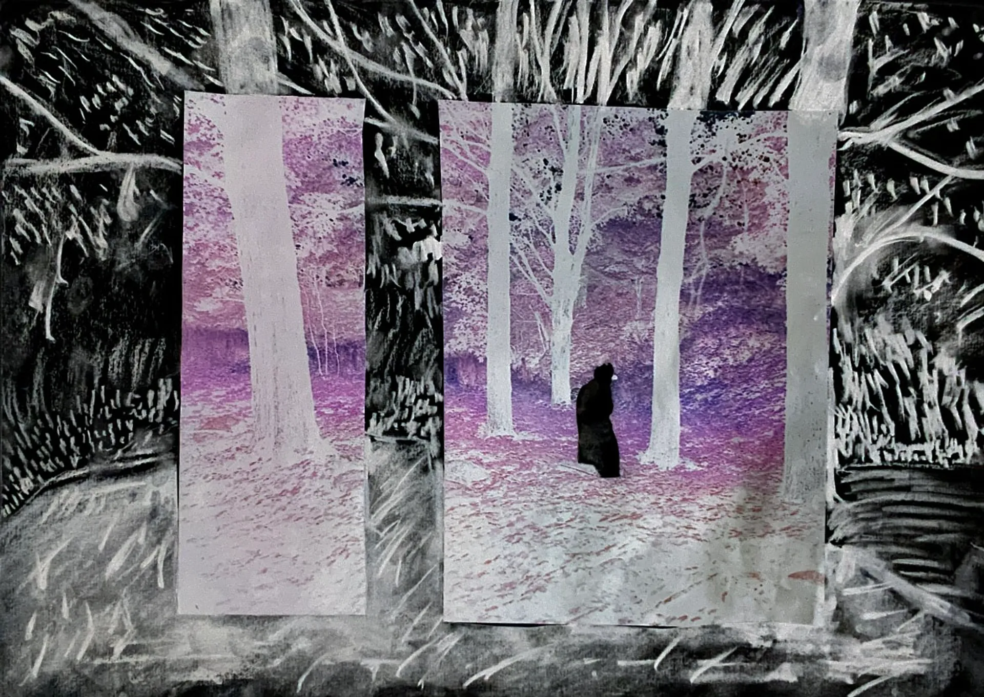 Molly works across Illustration and Animation with a range of mediums. Her focus is towards textures and building atmosphere and tone for projects to create worlds for them to exist in. The main focus of her end of year projects was around poems and creating instinctive work in response. The themes of these were largely focused on subverting the male gaze. With the use of collage, the intention was also to visually present an idea of space between reality and other worlds is it a dream-like state or a fairy kingdom. Using digital images of the woods as a focus point the squares were extended with charcoal drawings then inverted. This also created a layer between reality and the image/ world being created. Molly also worked with film within animation. She experimented with green screen and rotoscoping and using other artistic elements such as dance and sound to create a performative piece. Other mediums used were chalk pastels, acrylic paint and graphite. Molly aims to keep her work as hand-drawn and observant of the maker as possible using natural or recycled materials wherever possible.