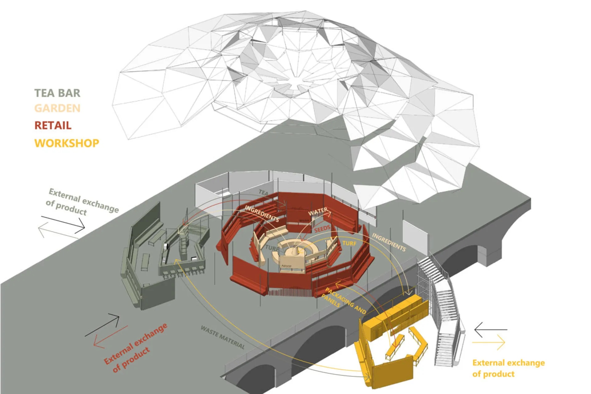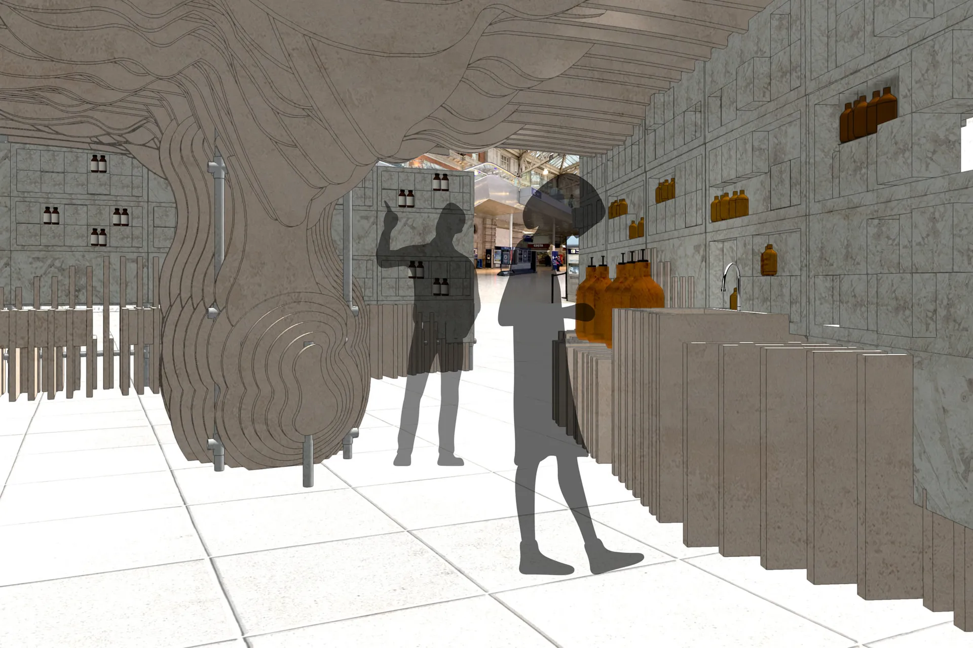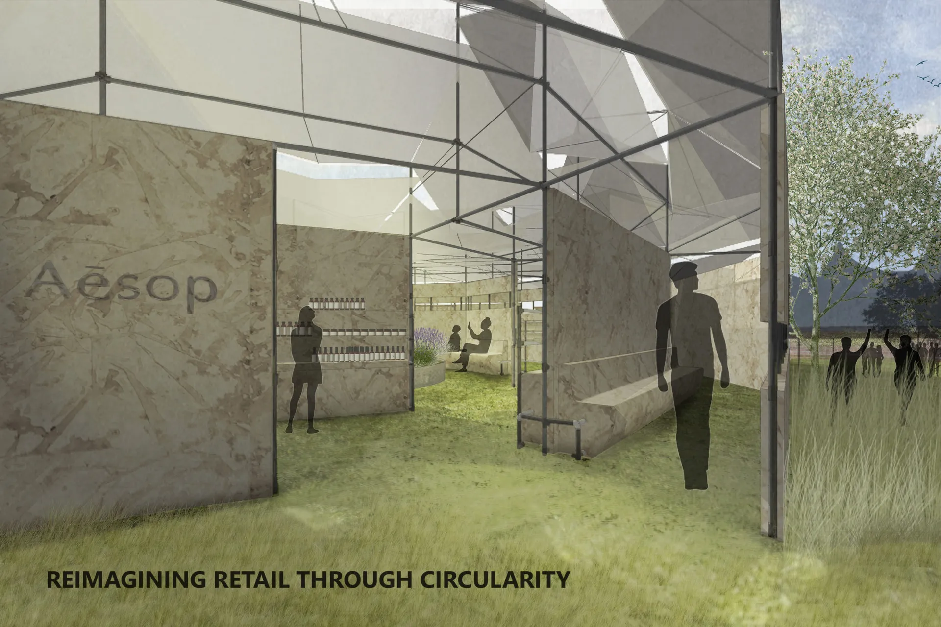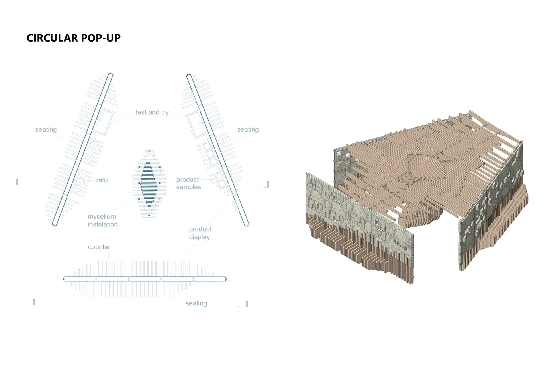 I am designing for the skin care brand Aesop and I started with redesigning an existing product. I developed my proposal around the idea of compostability and emotional durability with the passing of time. These qualities were translated in the Pop-up store and the Brand Pavilion. The Pop-up is located at Waterloo Station and its design is focused on the motion and experience of passengers. The Pop-up is a multi-use structure which incorporates furniture, packaging, and an installation. It communicates the metaphoric idea of ‘HOW HUMANKIND ALTERS NATURE AND ITS RESOURCES TO MEET INDUSTRIAL PURPOSES’.