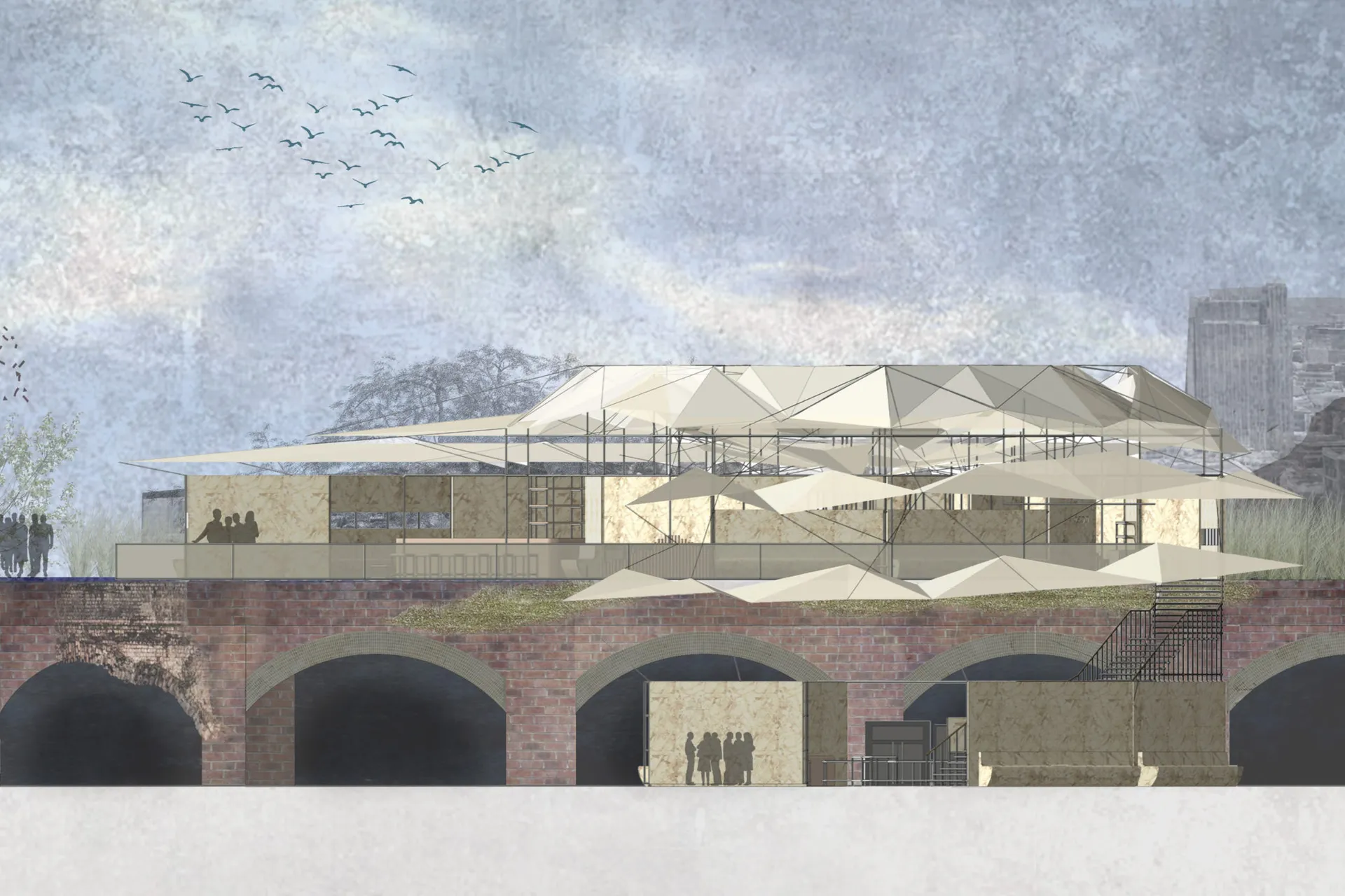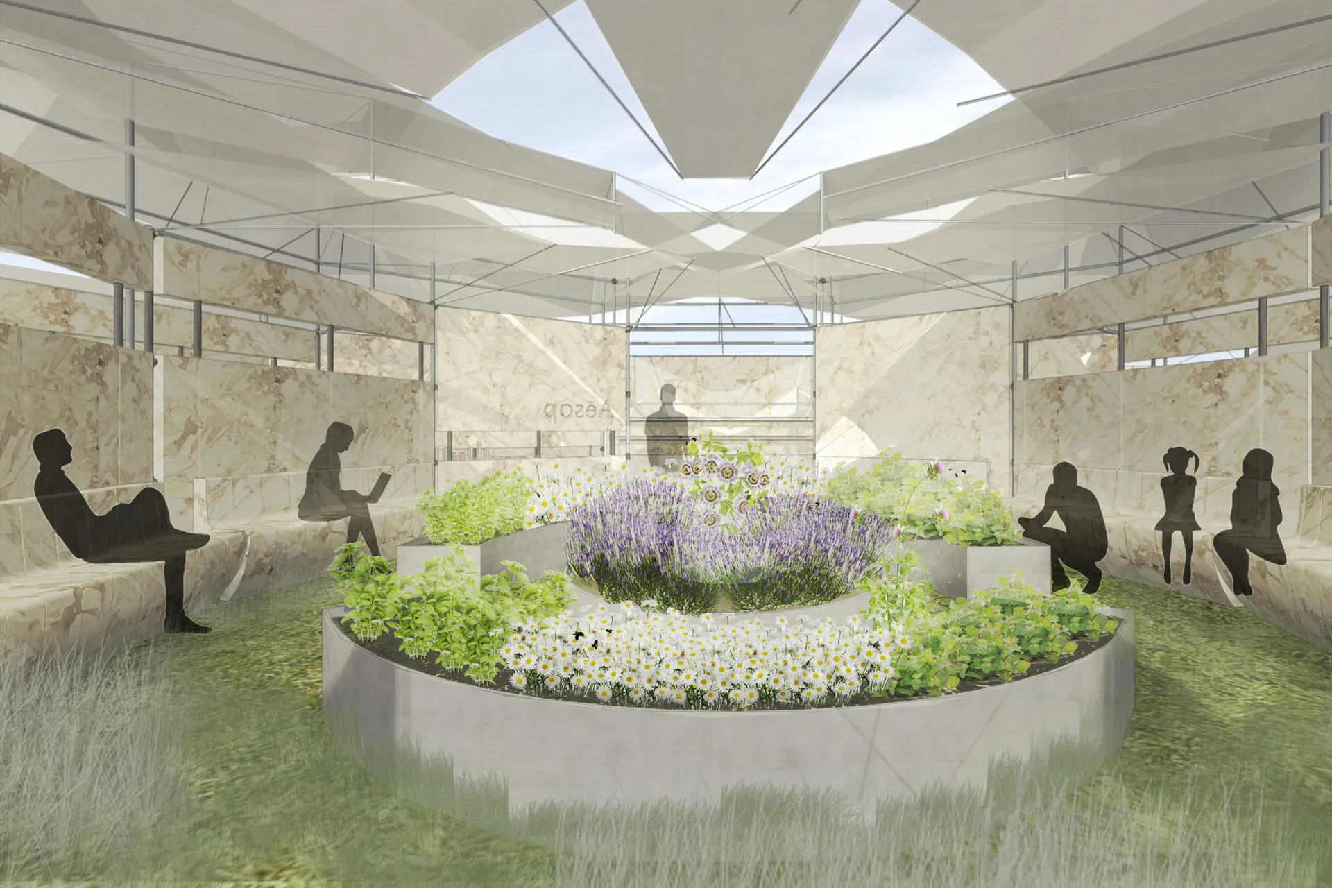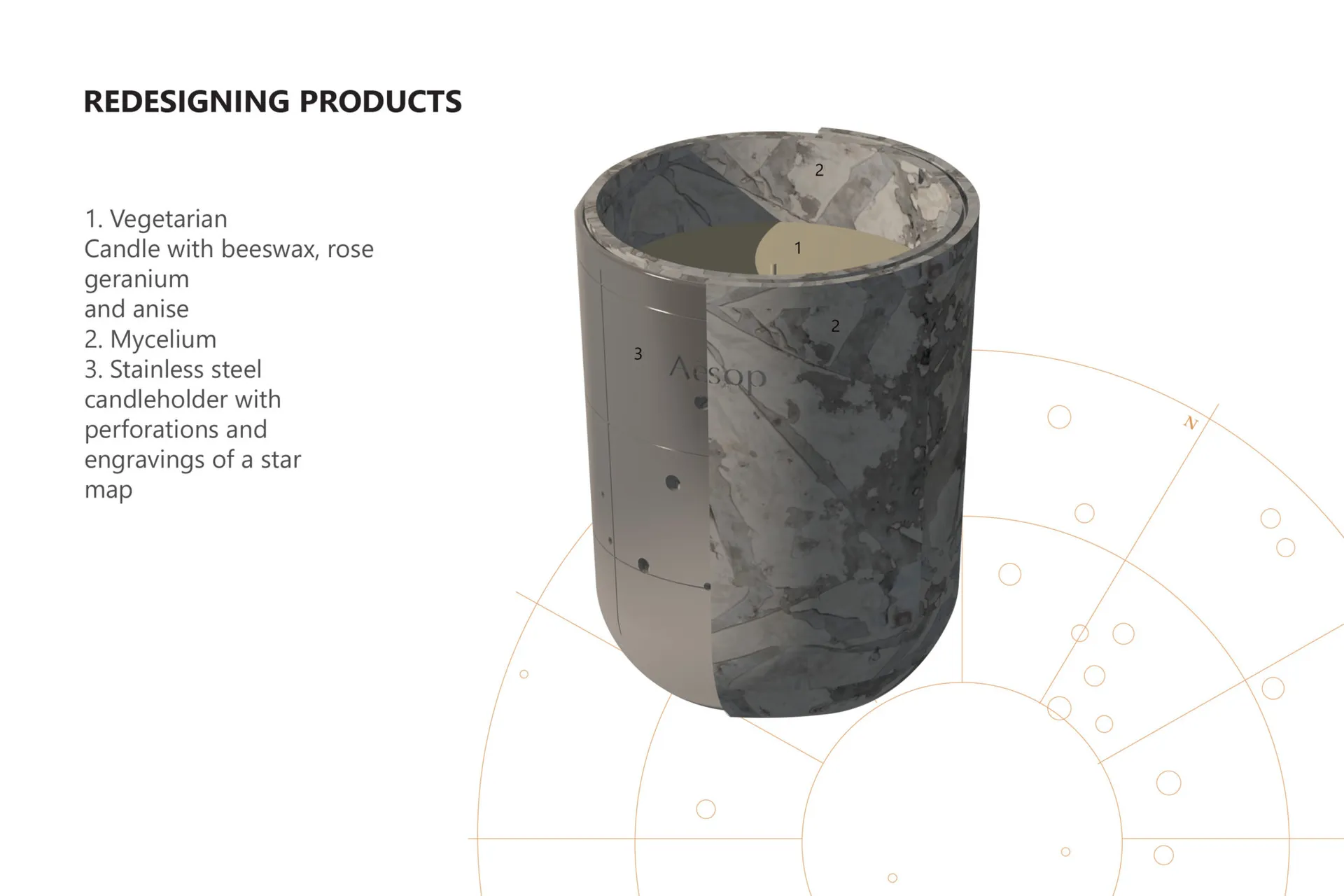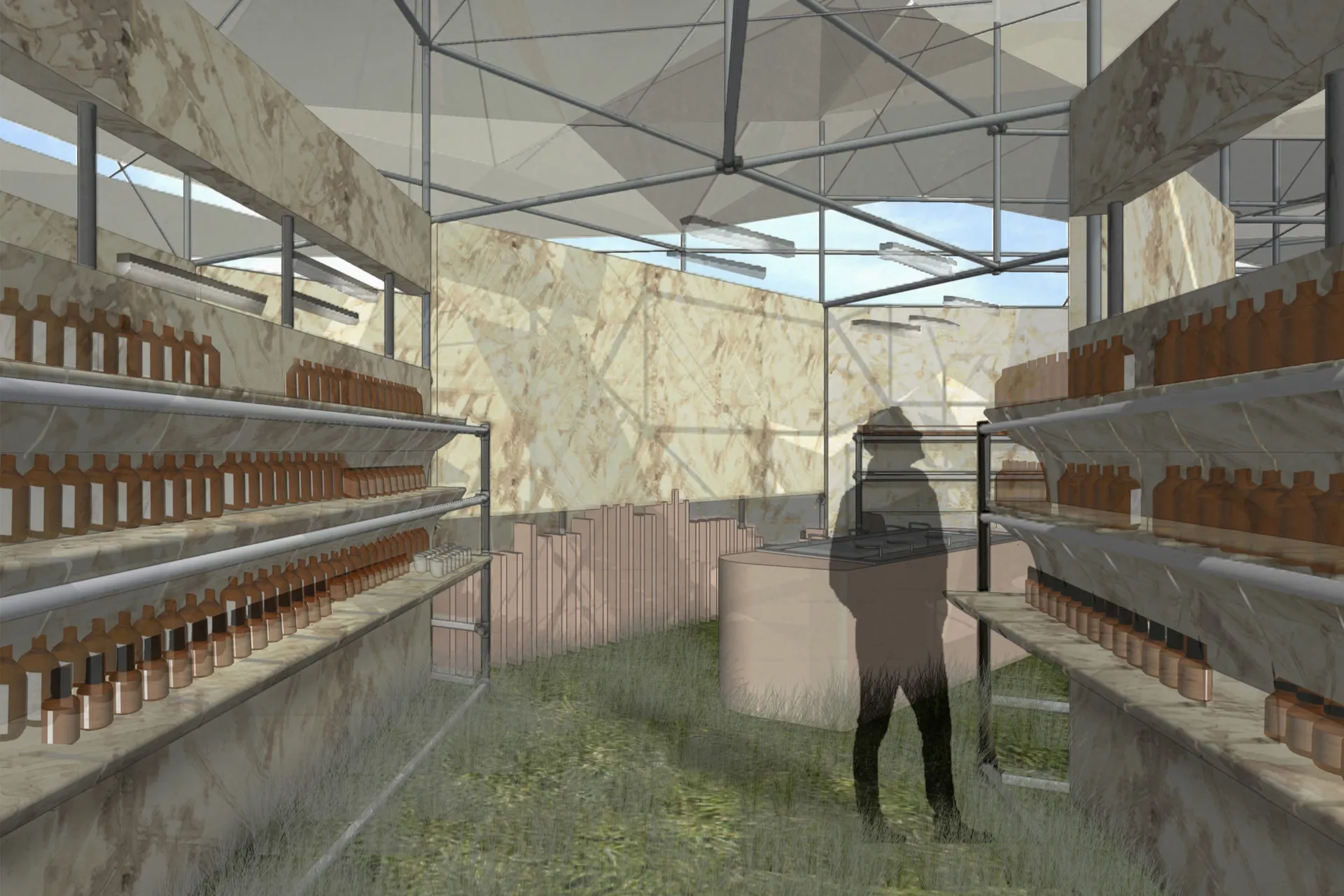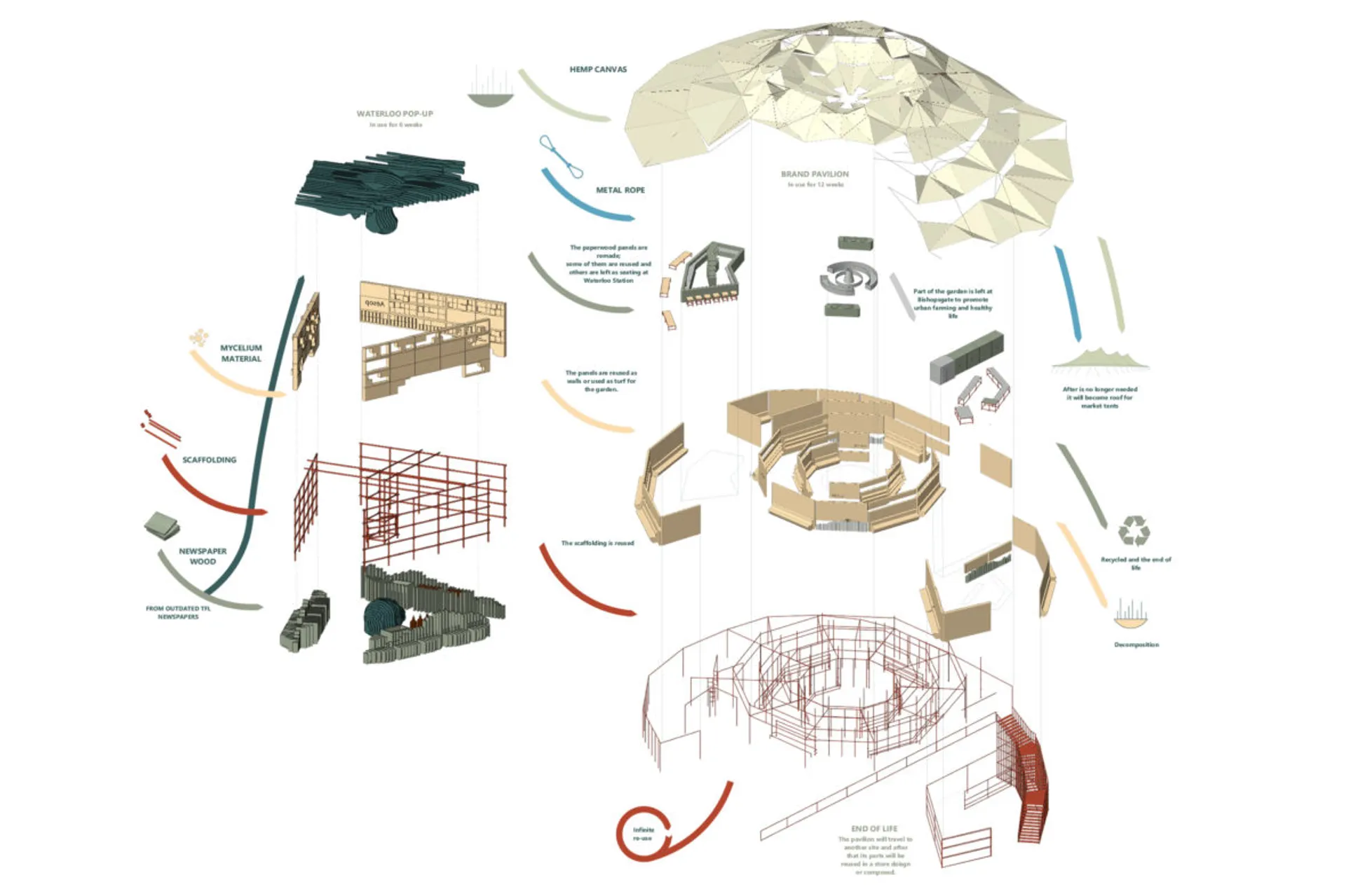 I am designing for the skin care brand Aesop and I started with redesigning an existing product. I developed my proposal around the idea of compostability and emotional durability with the passing of time. These qualities were translated in the Pop-up store and the Brand Pavilion. The Pop-up is located at Waterloo Station and its design is focused on the motion and experience of passengers. The Pop-up is a multi-use structure which incorporates furniture, packaging, and an installation. It communicates the metaphoric idea of ‘HOW HUMANKIND ALTERS NATURE AND ITS RESOURCES TO MEET INDUSTRIAL PURPOSES’.