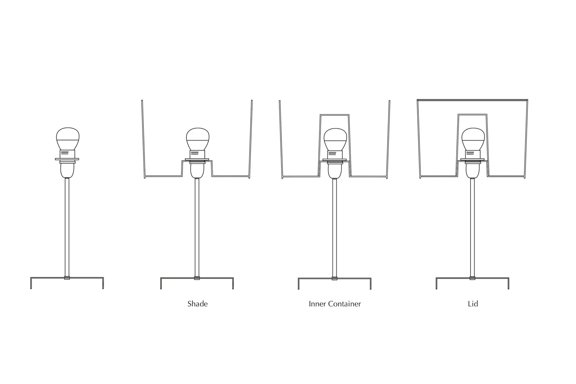 Materials – Frosted Polypropylene (shade, lid), Clear Polypropylene (inner container), Stainless Steel (satin polished), MDF, Foam (base)