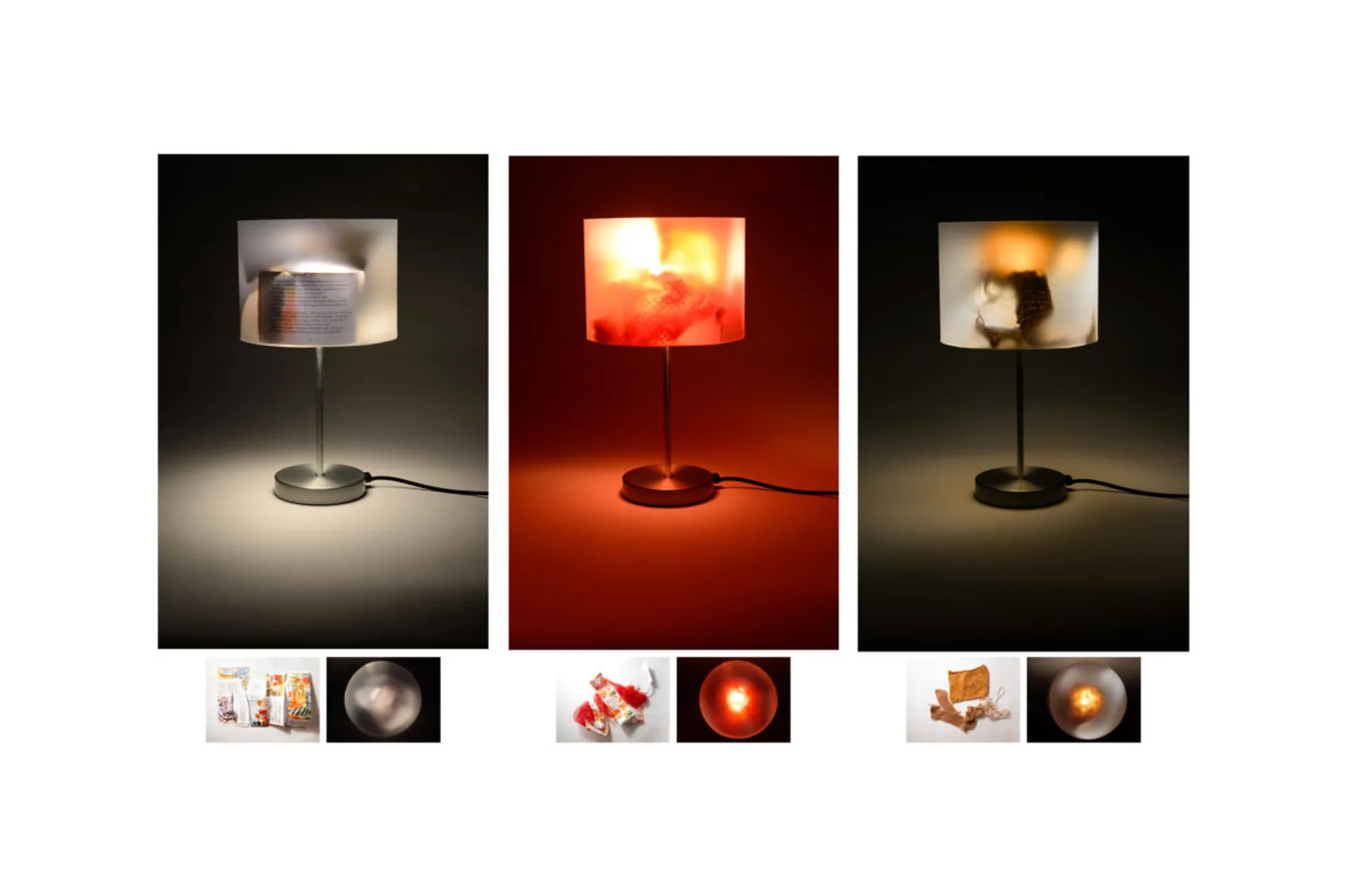 The user can affect the mood and atmosphere of the lamp and its surroundings by mixing coloured household disregarded packaging to create a beautiful abstract image and projection through its frosted lens.