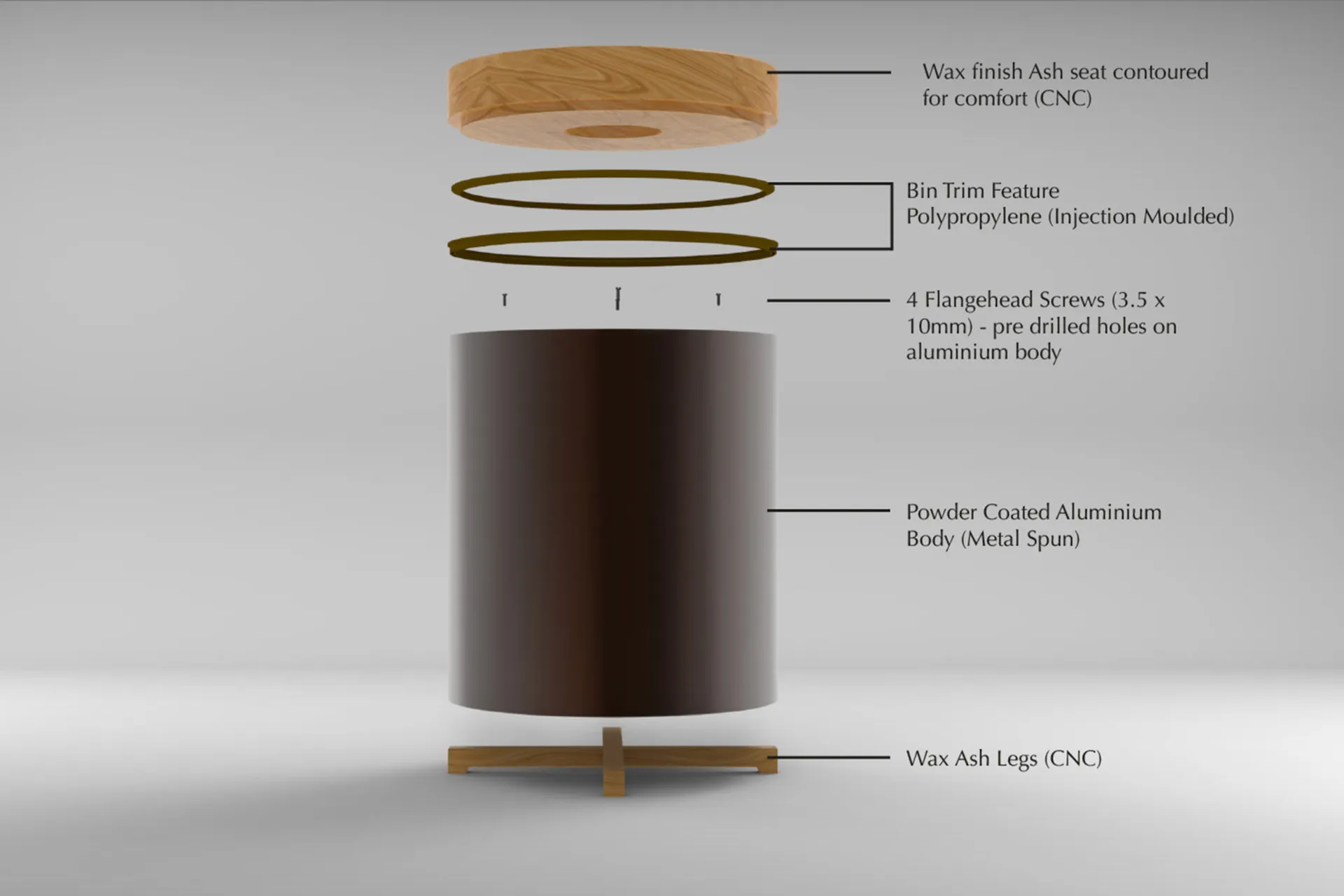 Materials – Ash (Wax finish), Polypropylene, Aluminium (Powder Coated Finish)