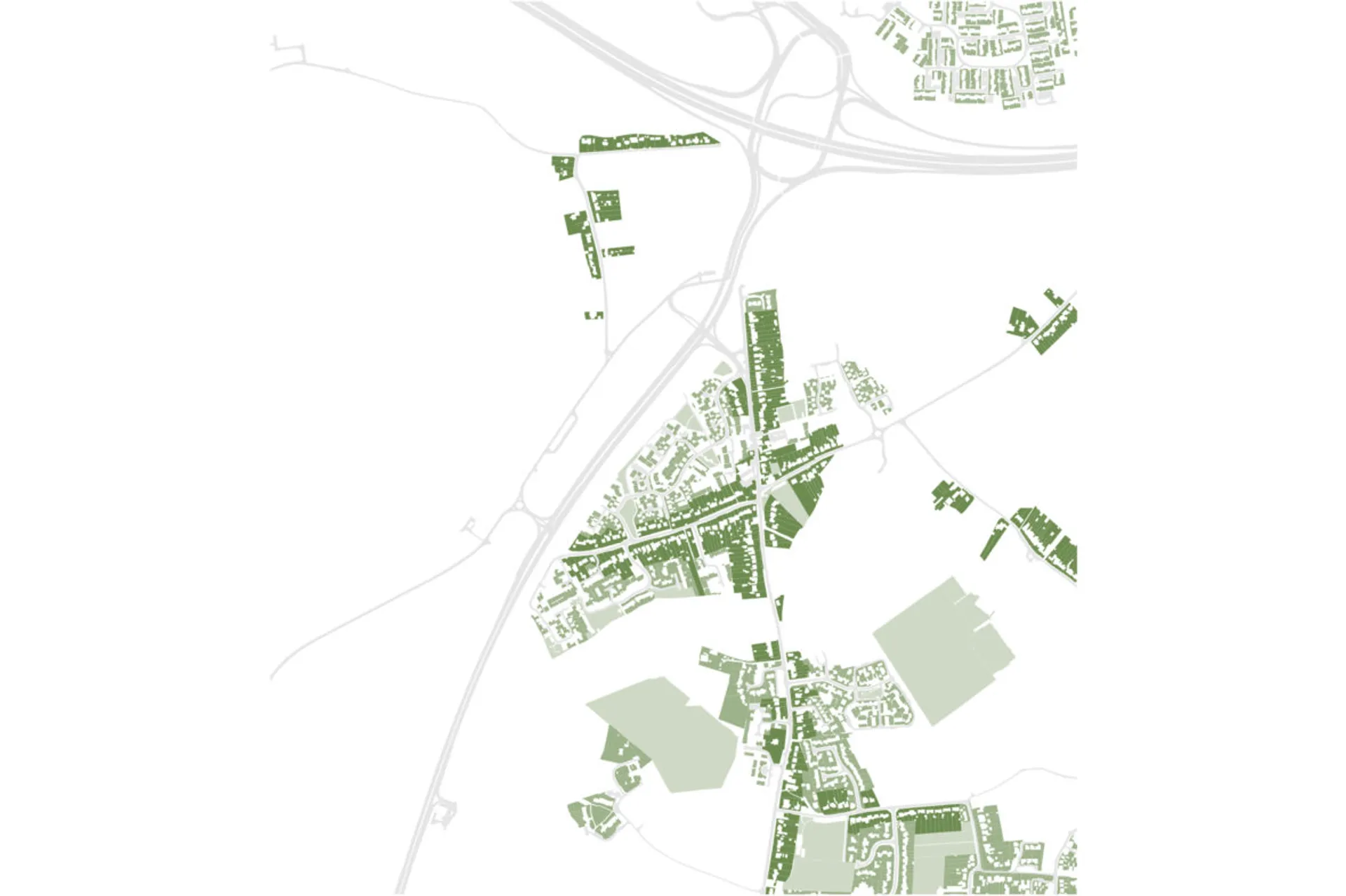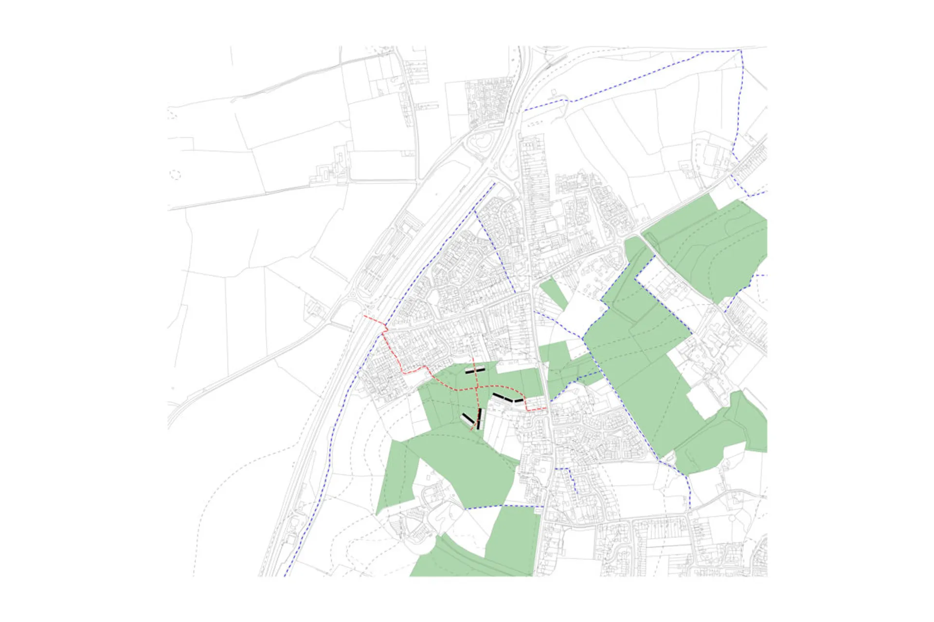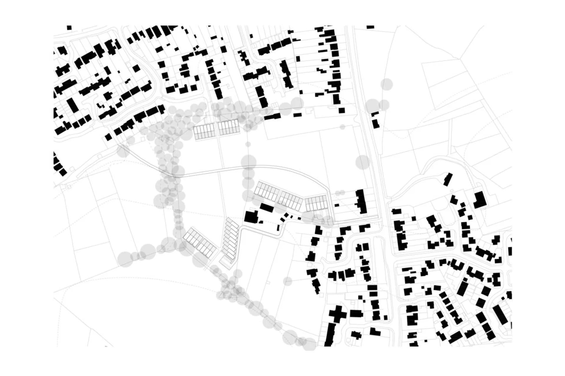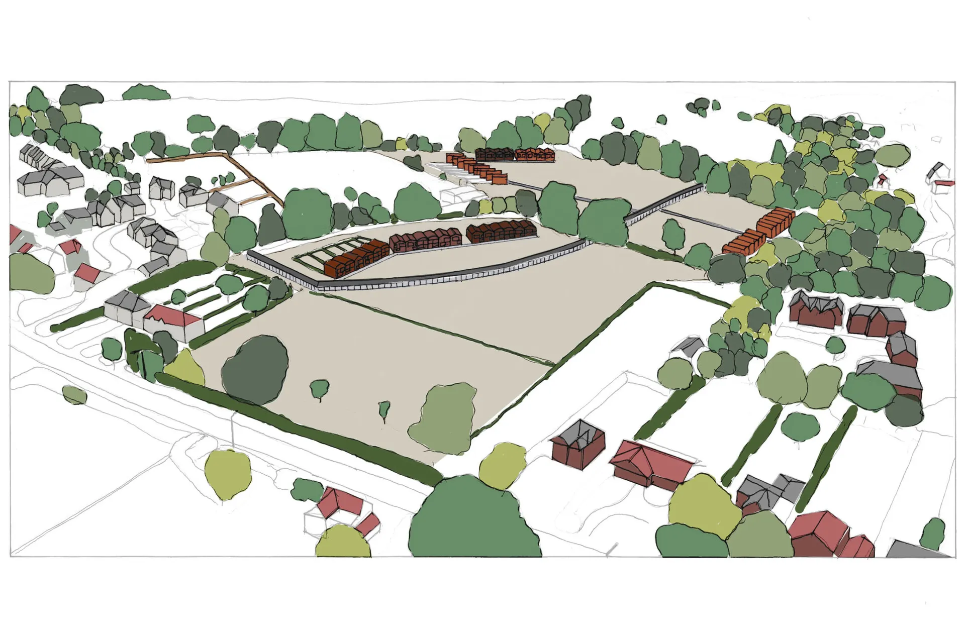The project consists of 47 houses set between the two villages of Three Mile Cross and Spencers Wood. The intent for this project was to both densify the villages and also to define the edges of them, leaving a public green space to separate the two.