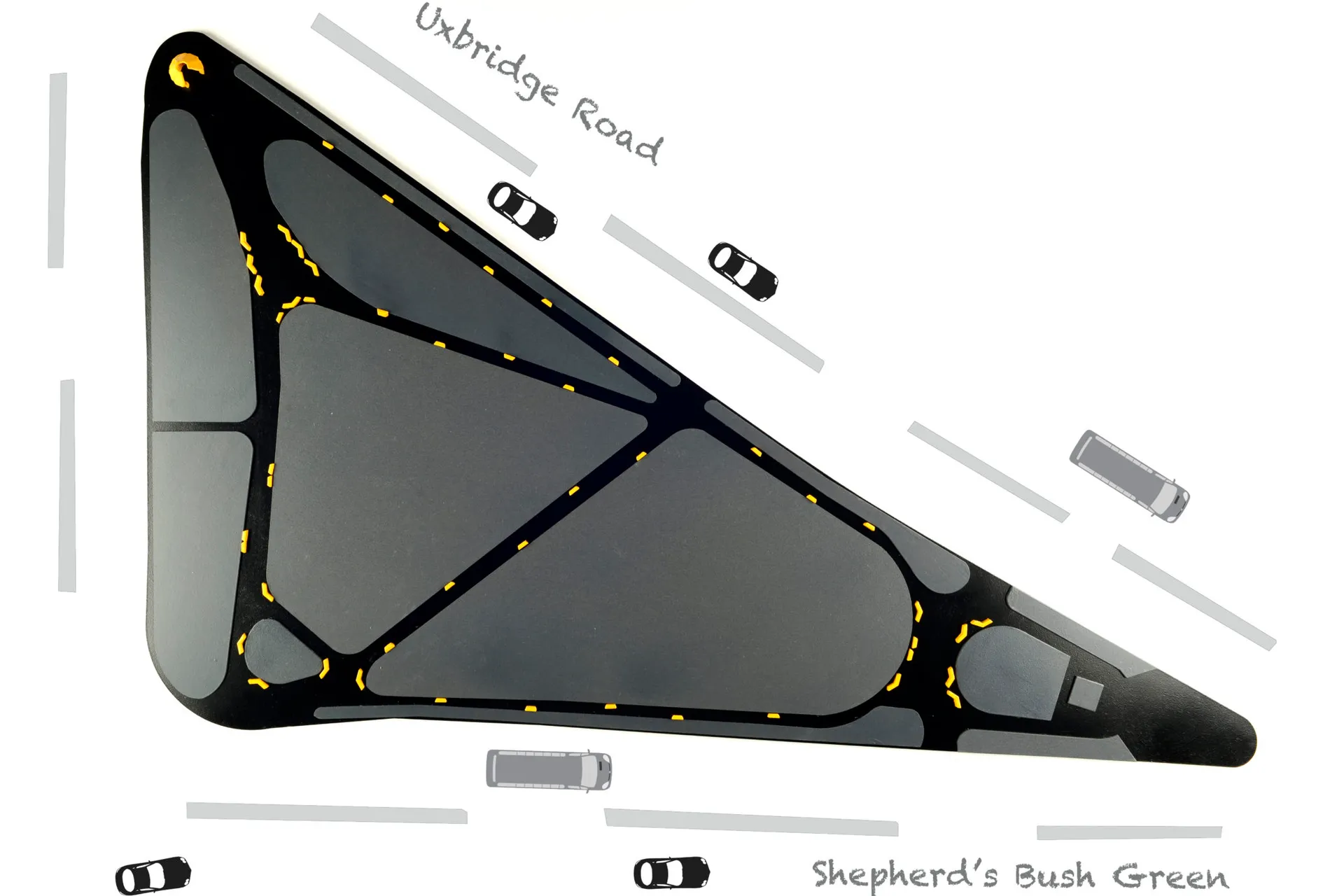 My proposal is named “MEETING-POINT”, and the motive behind it is to transform the busy Shepherd’s Bush Green that has been confusing and underwhelming for people over many years into an inclusive space that gathers people and allows them to walk through this historic neighbourhood.