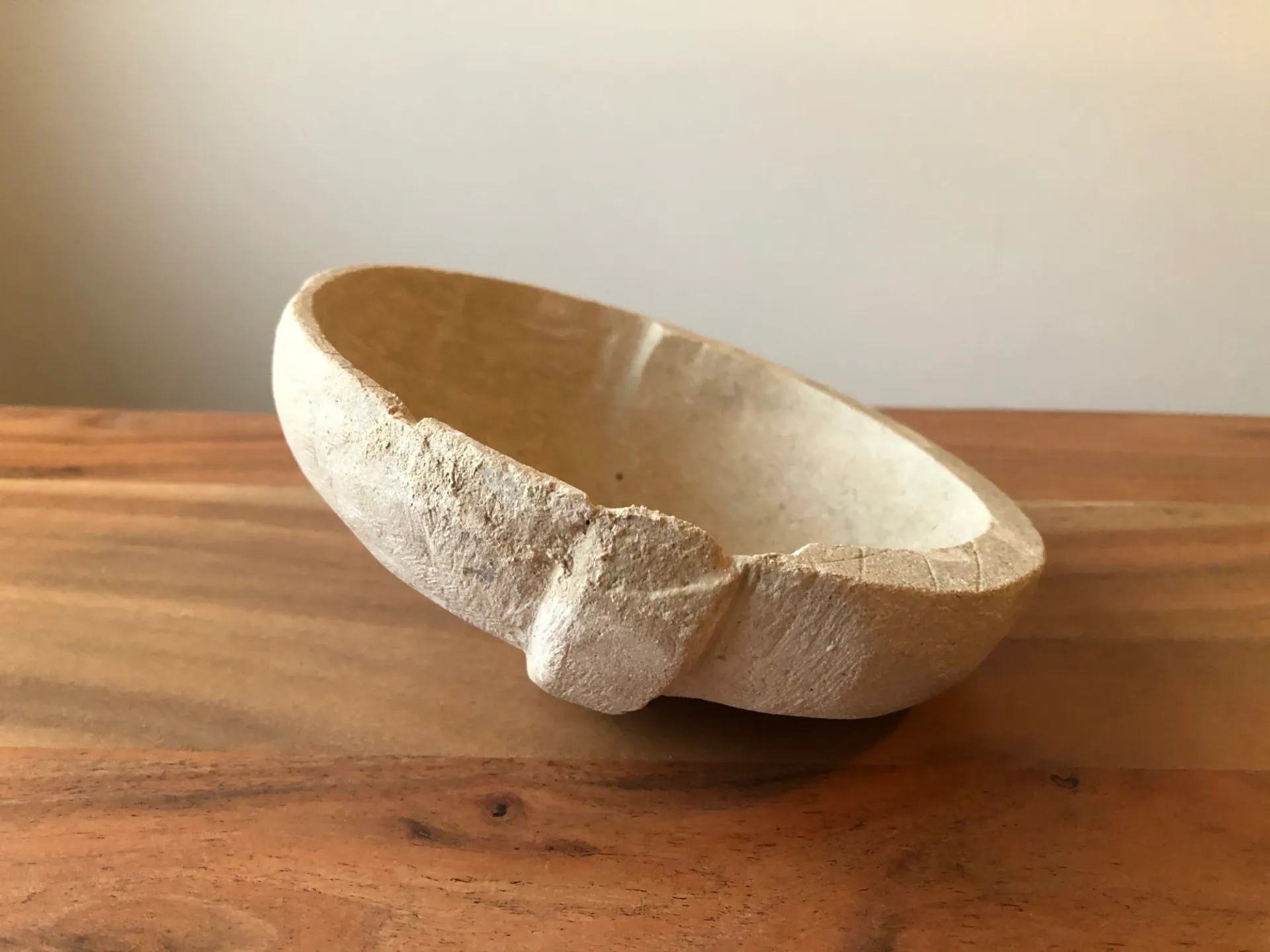 Reintroducing awkwardness and discomfort into our lives by redesigning objects used in our daily routines. This hand carved stone bowl left untouched would tip and be unusable, so requires newfound ways of holding to fulfil its function.