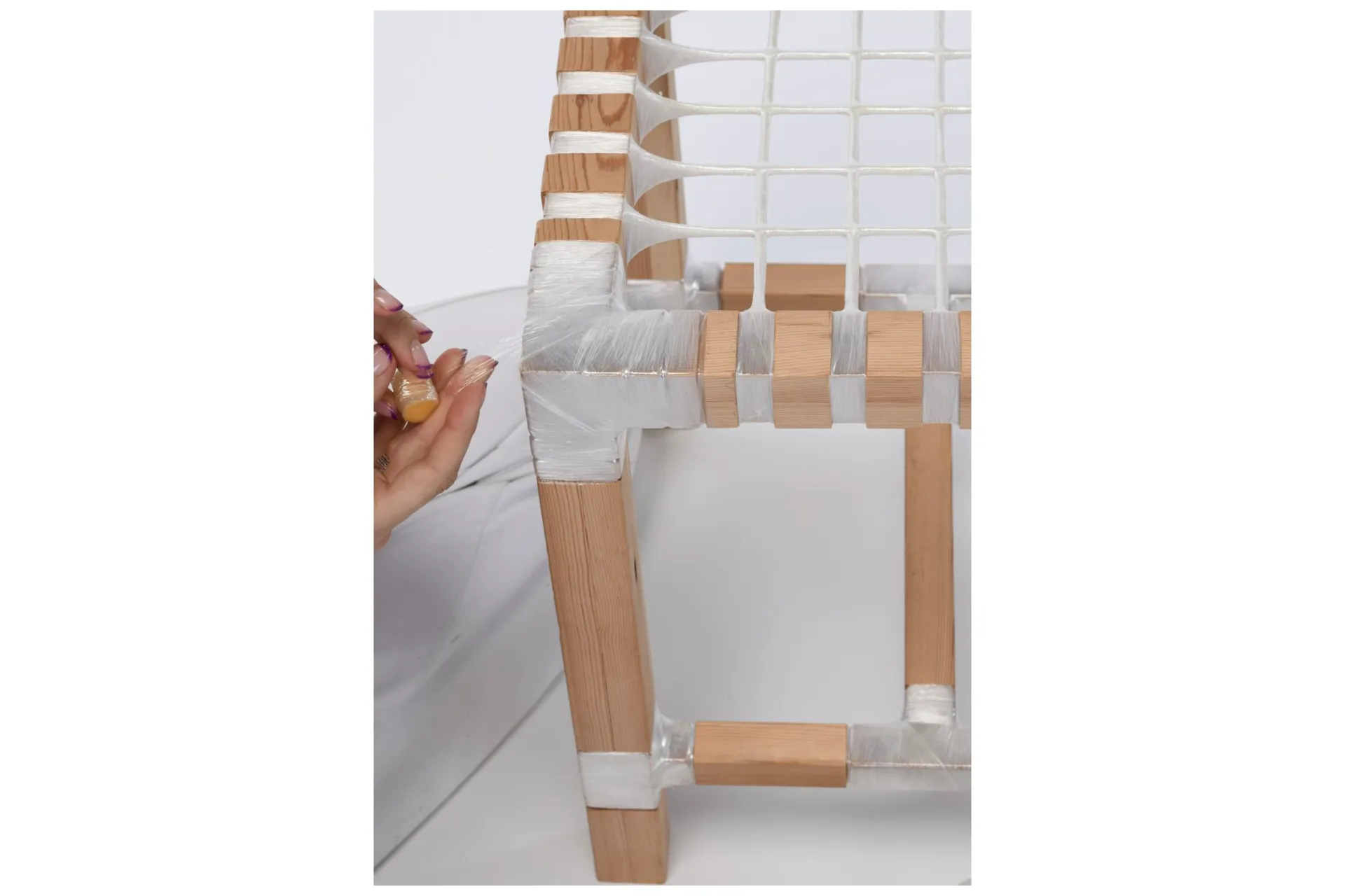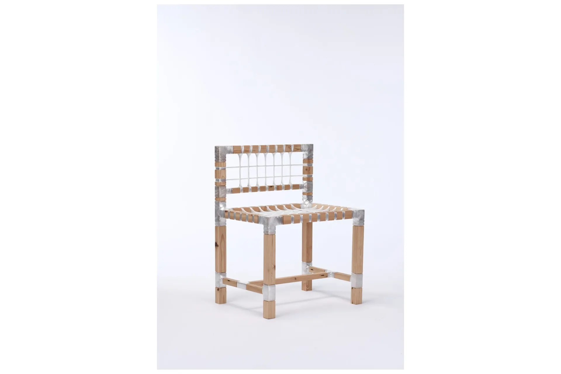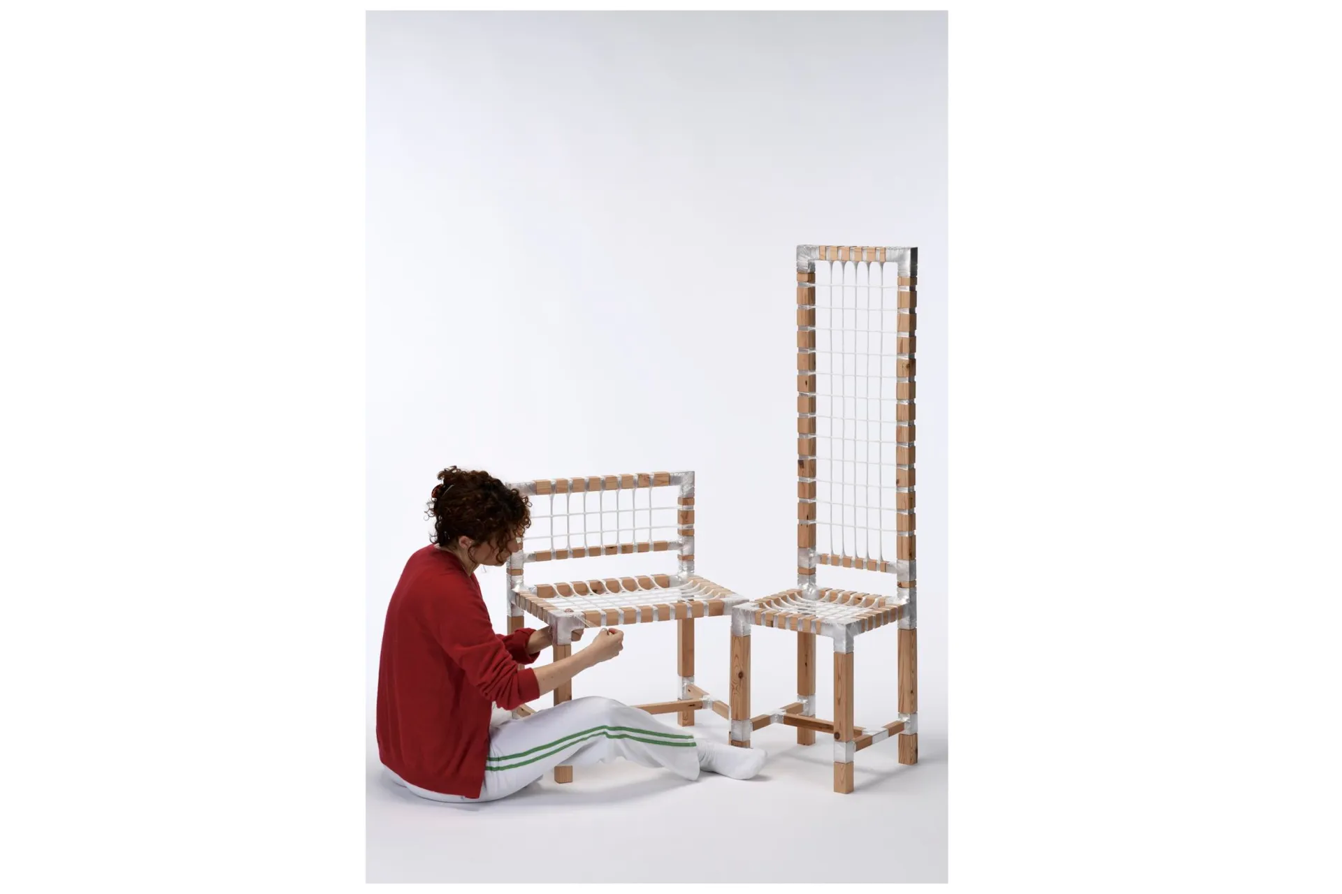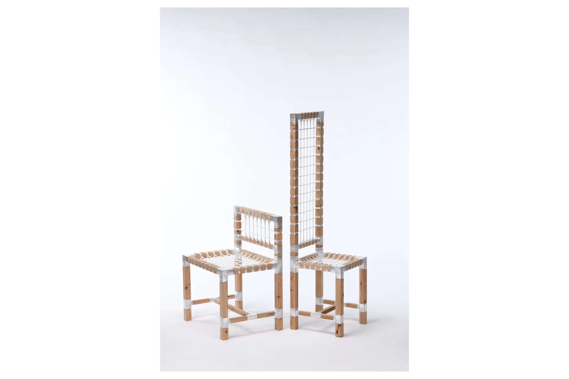 The properties of the high elasticity, adhesion, and translucence make cling film an intriguing material for creating three-dimensional frameworks. The chairs in this collection do not require any adhesive, jointing, or fixings and are only bound together with cling film. The netted webbing across the chairs is also solely cling film.